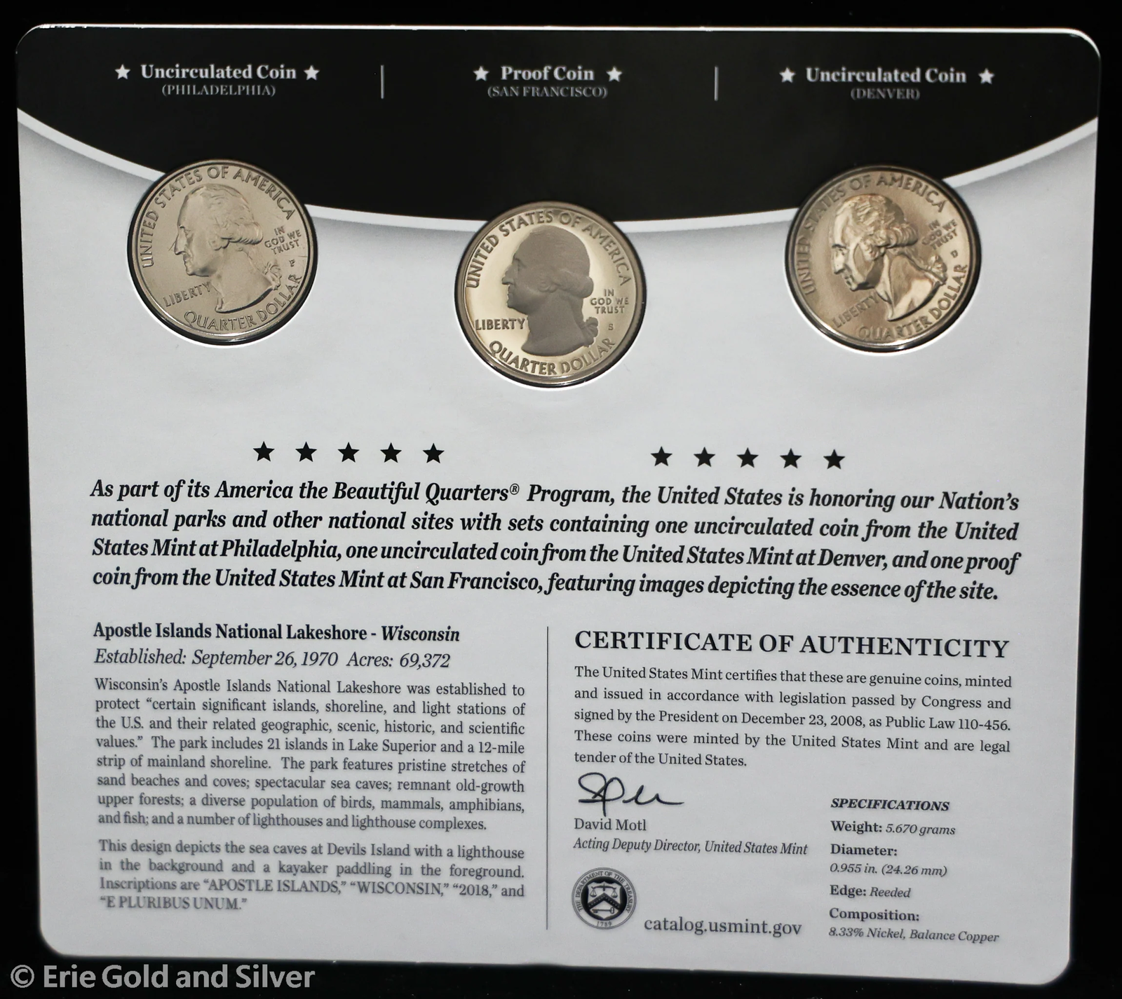 2018 P D S 25c ATB Apostle Islands Quarters 3 Coin Set | BU Proof