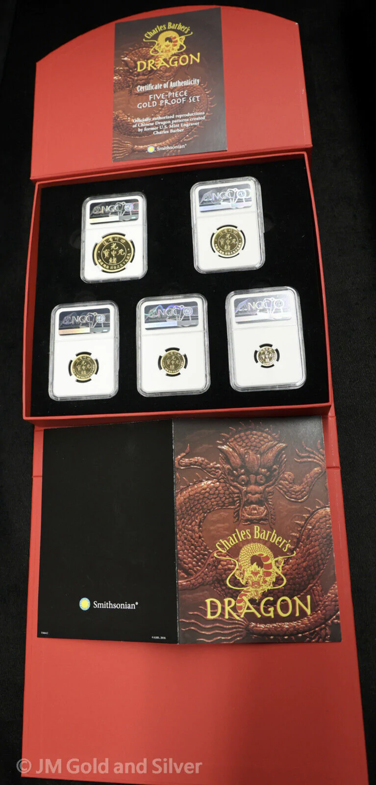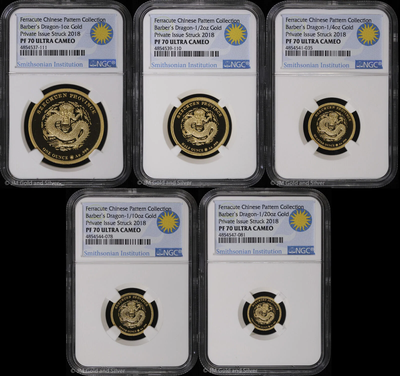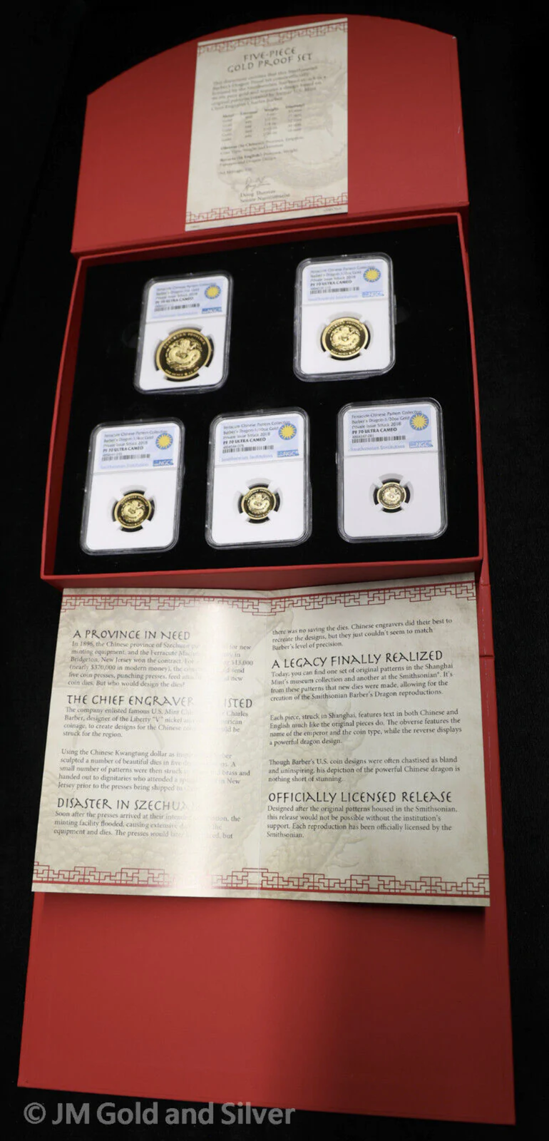 For sale is a 2018 Smithsonian Institution Barber's Dragon 5 Piece Gold Proof Set With Box & COA. Certified / graded by NGC at PF 70 Ultra Cameo. View pictures for details and condition, the set pictured is the exact set you will receive. Feel free to contact us with any questions.