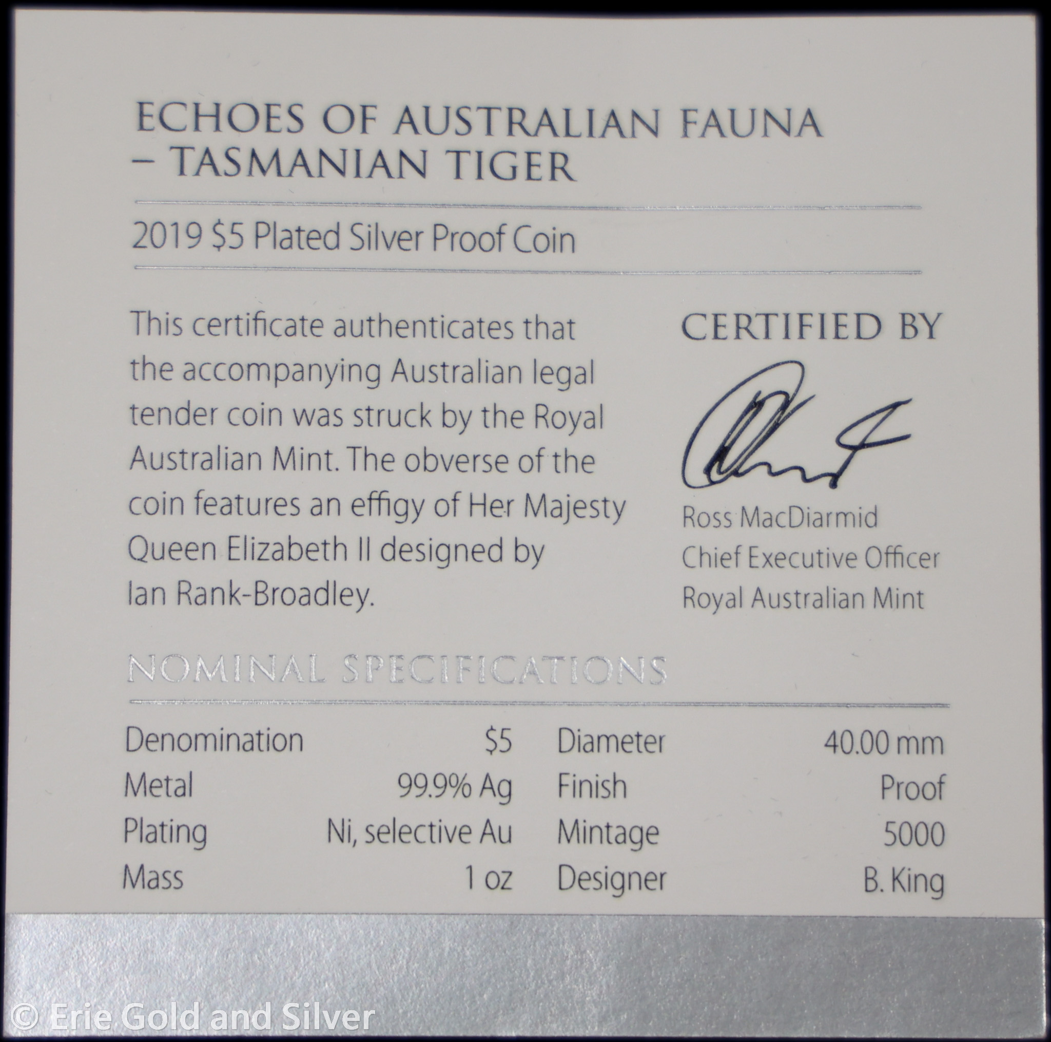 For sale is a 2019 $5 Australia Tasmanian Tiger 1 oz Silver Proof Coin w/ COA.