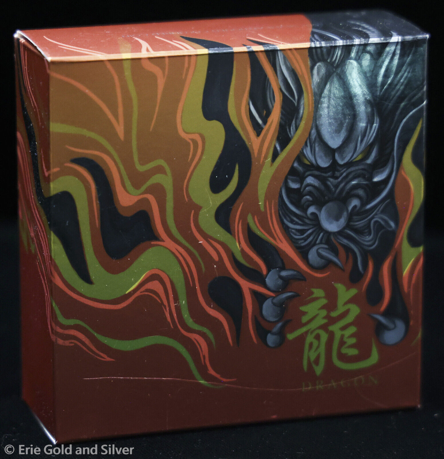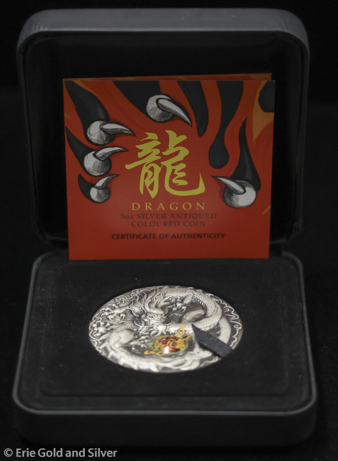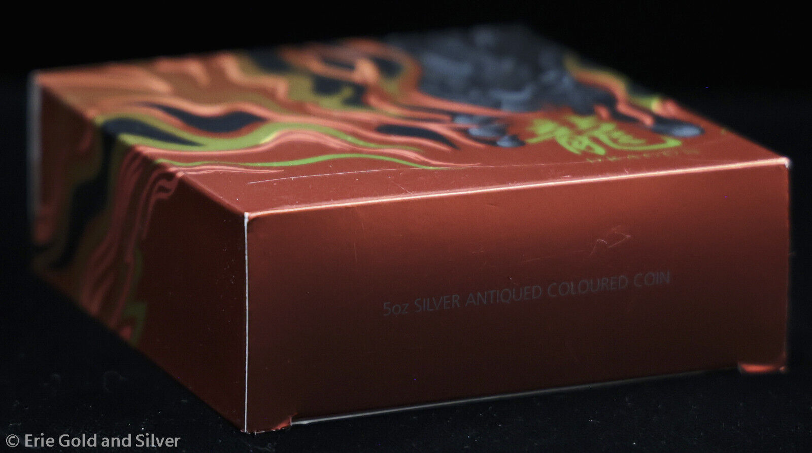 2019 $5 Tuvalu Perth Mint 5 oz Silver Antiqued Colored Dragon in OGP