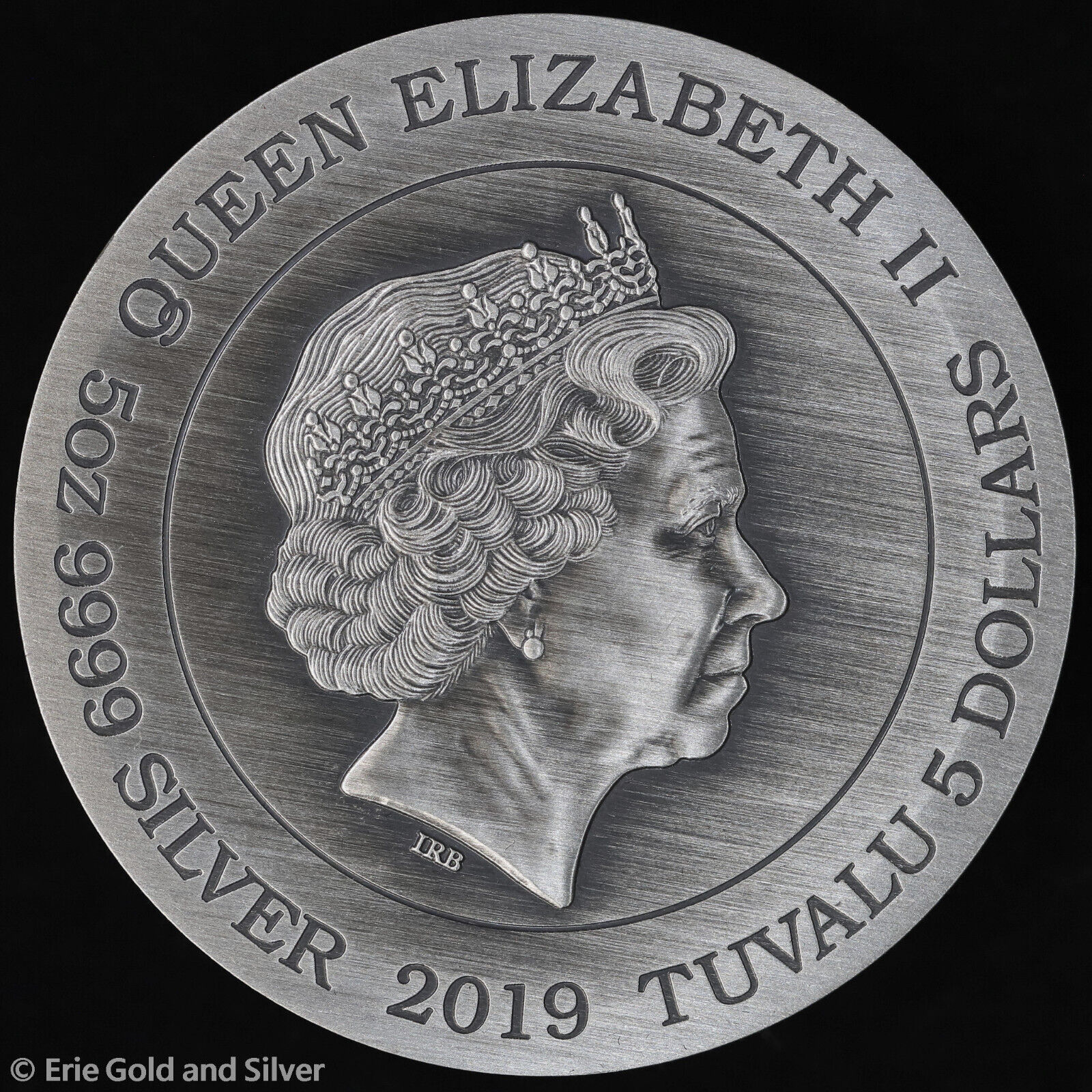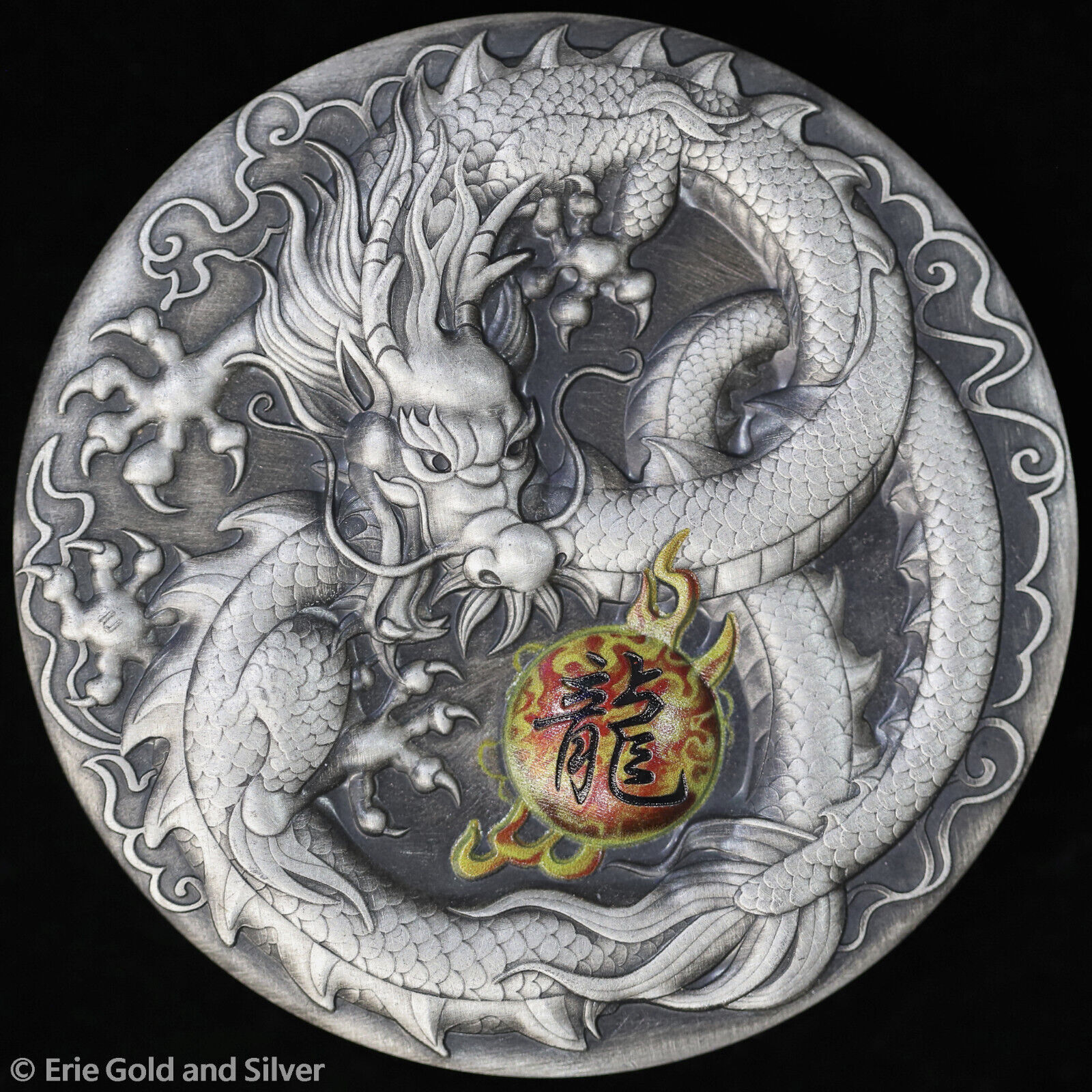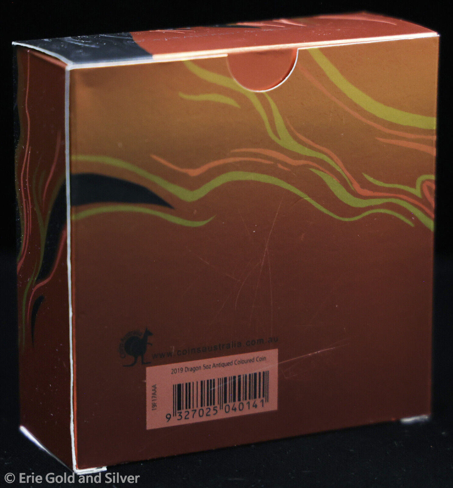 2019 $5 Tuvalu Perth Mint 5 oz Silver Antiqued Colored Dragon in OGP