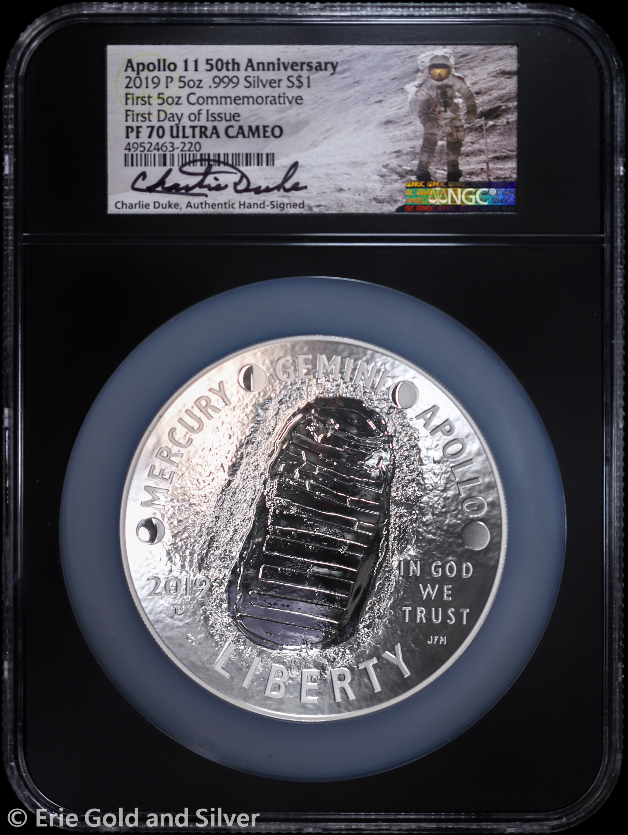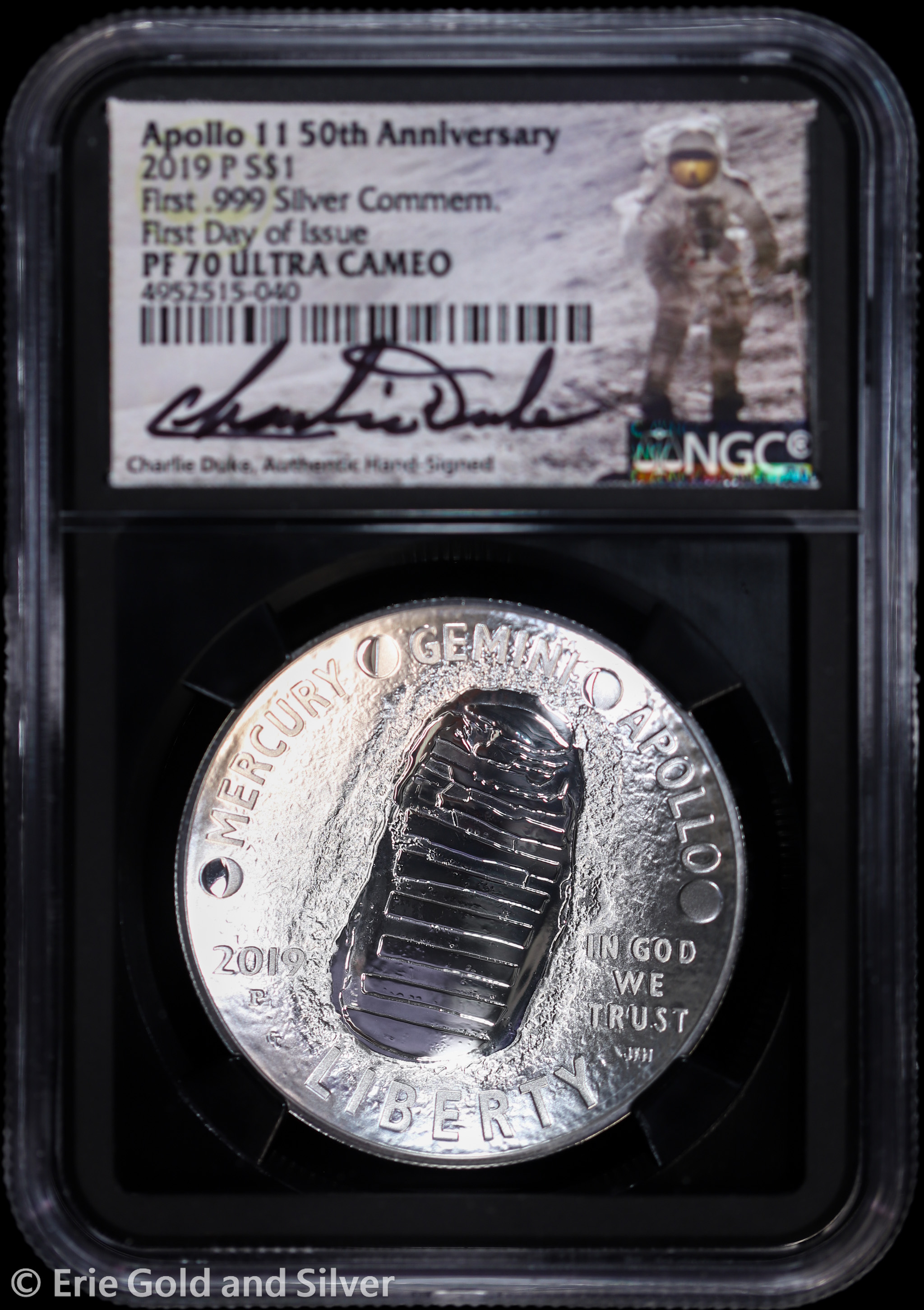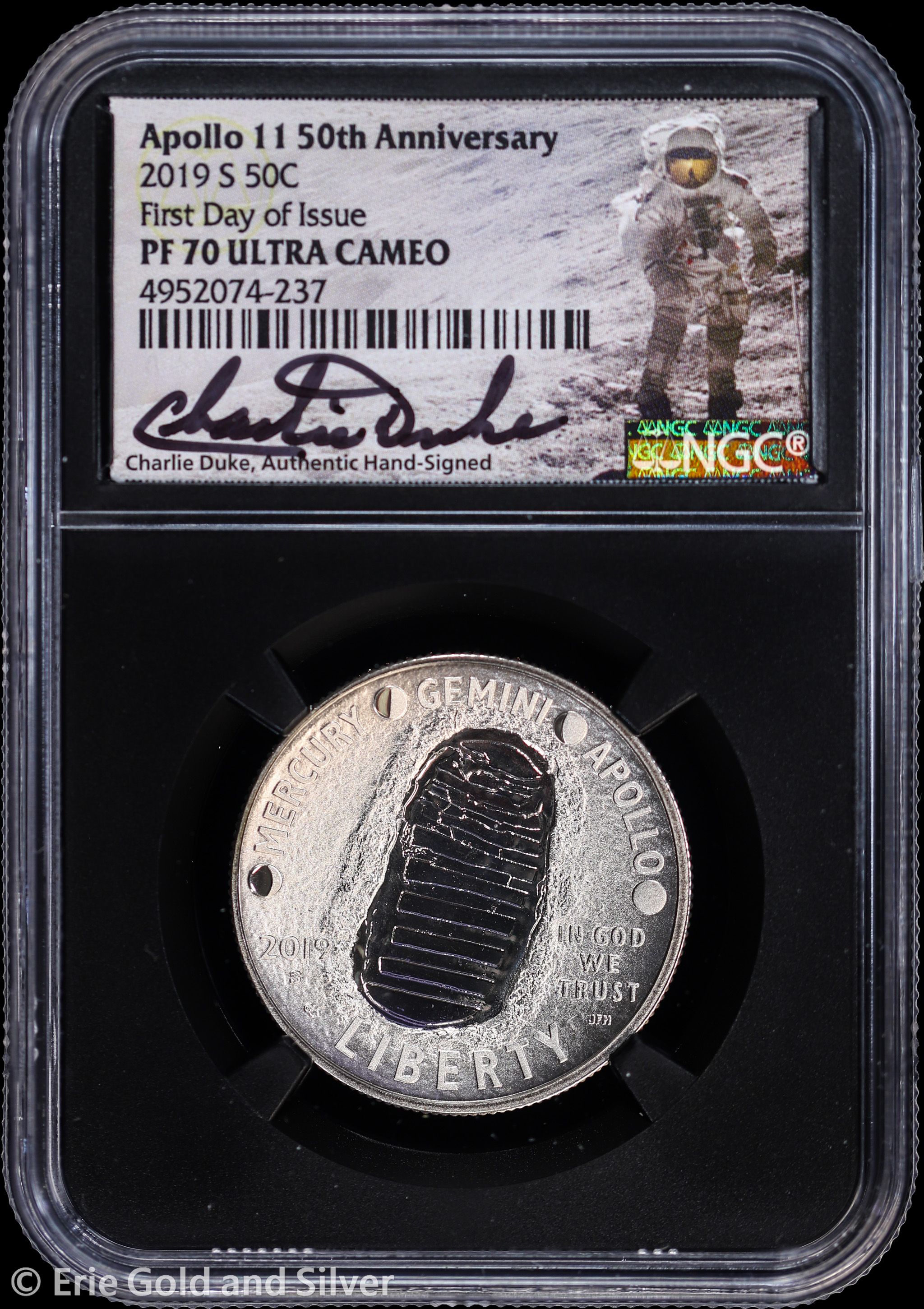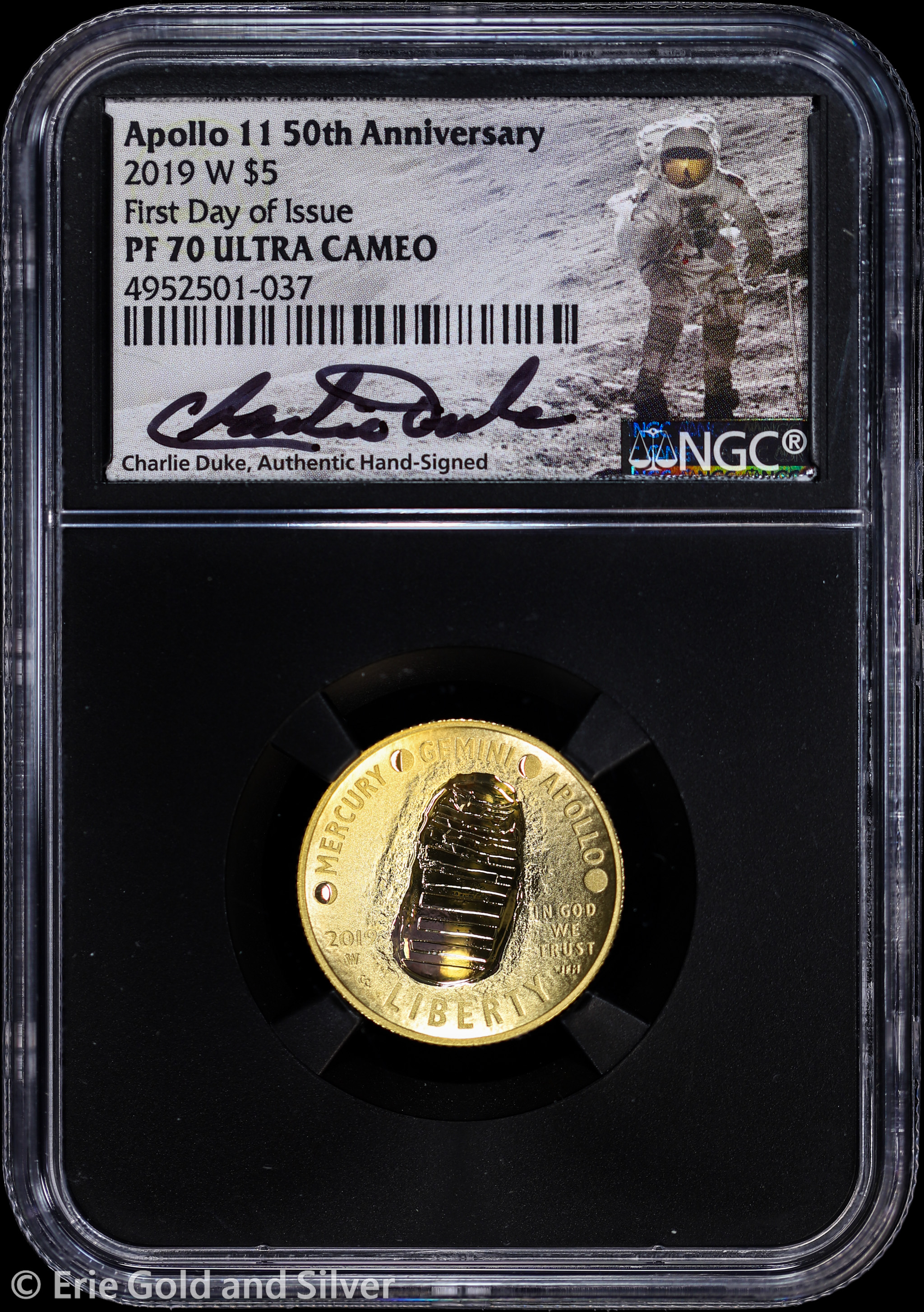 2019 Apollo 11 50th Anniversary 4-Coin & Space Flown Kapton Foil Set in Storage Box NGC PR 70 Ultra Cameo | First Day of Issue, Charlie Duke Signed Slabs