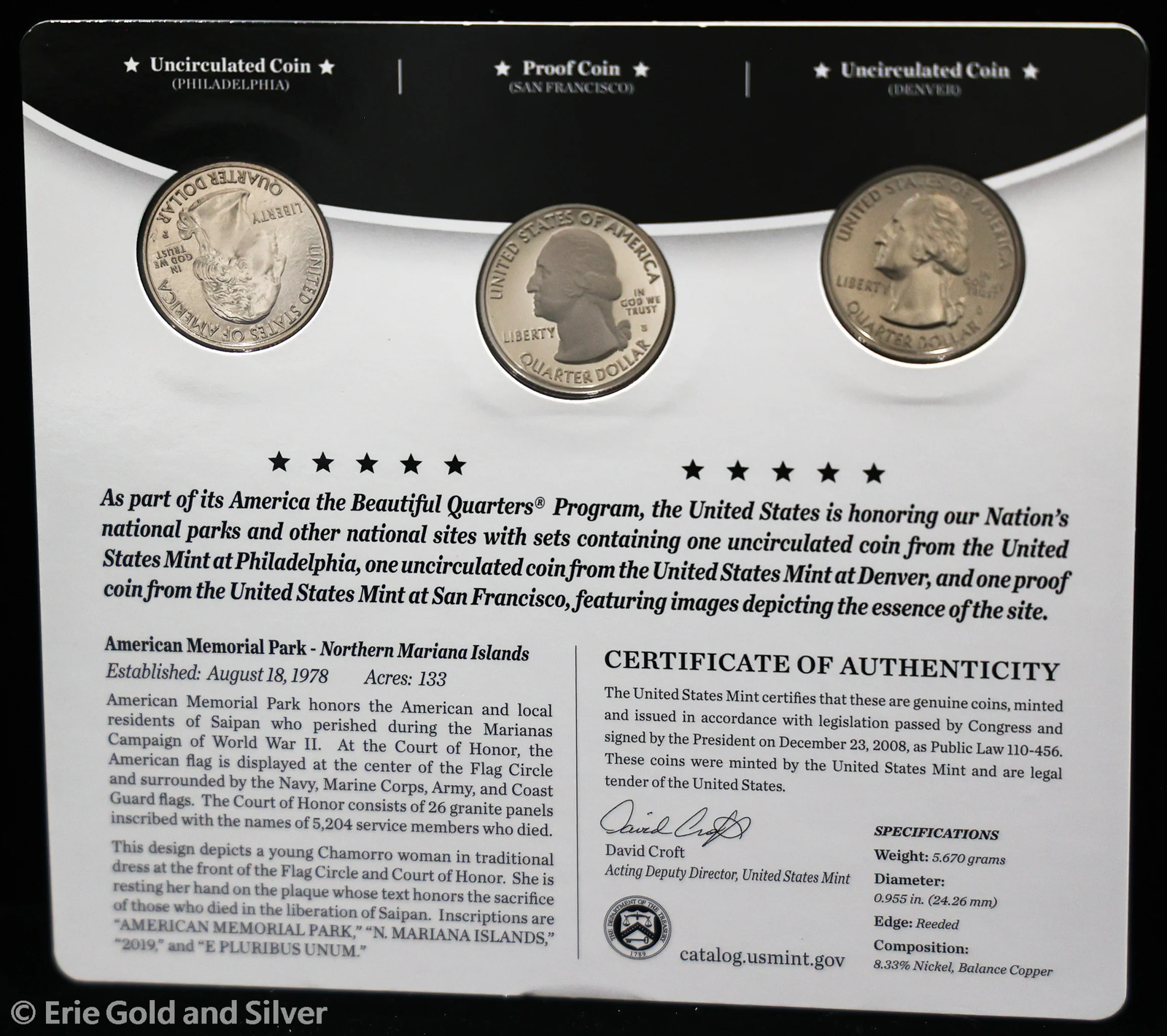 2019 P D S 25c ATB American Memorial Park Quarters 3 Coin Set | BU Proof