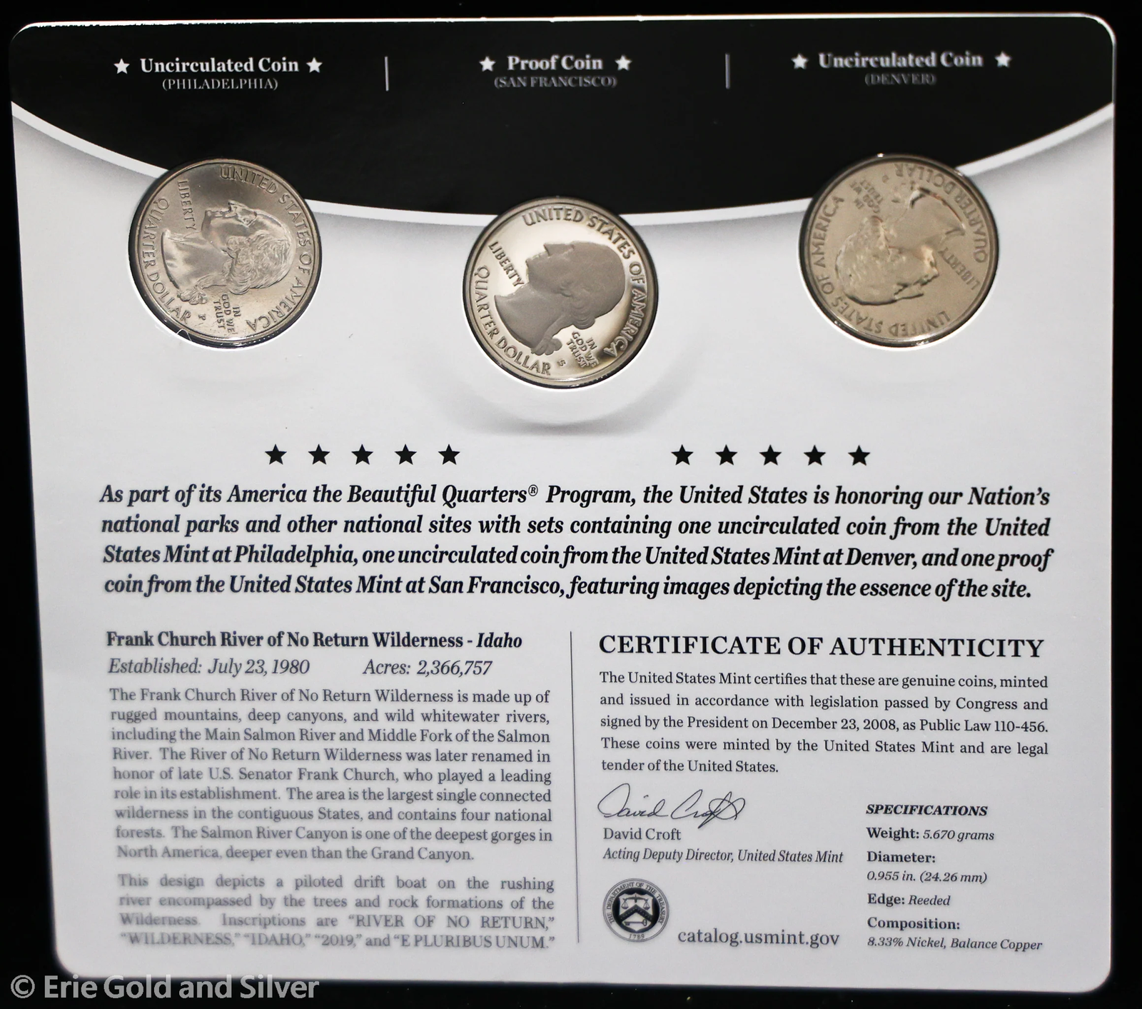 For sale is a 2019-P, D, S ATB Frank Church River of No Return Wilderness Quarters 3 Coin Set.