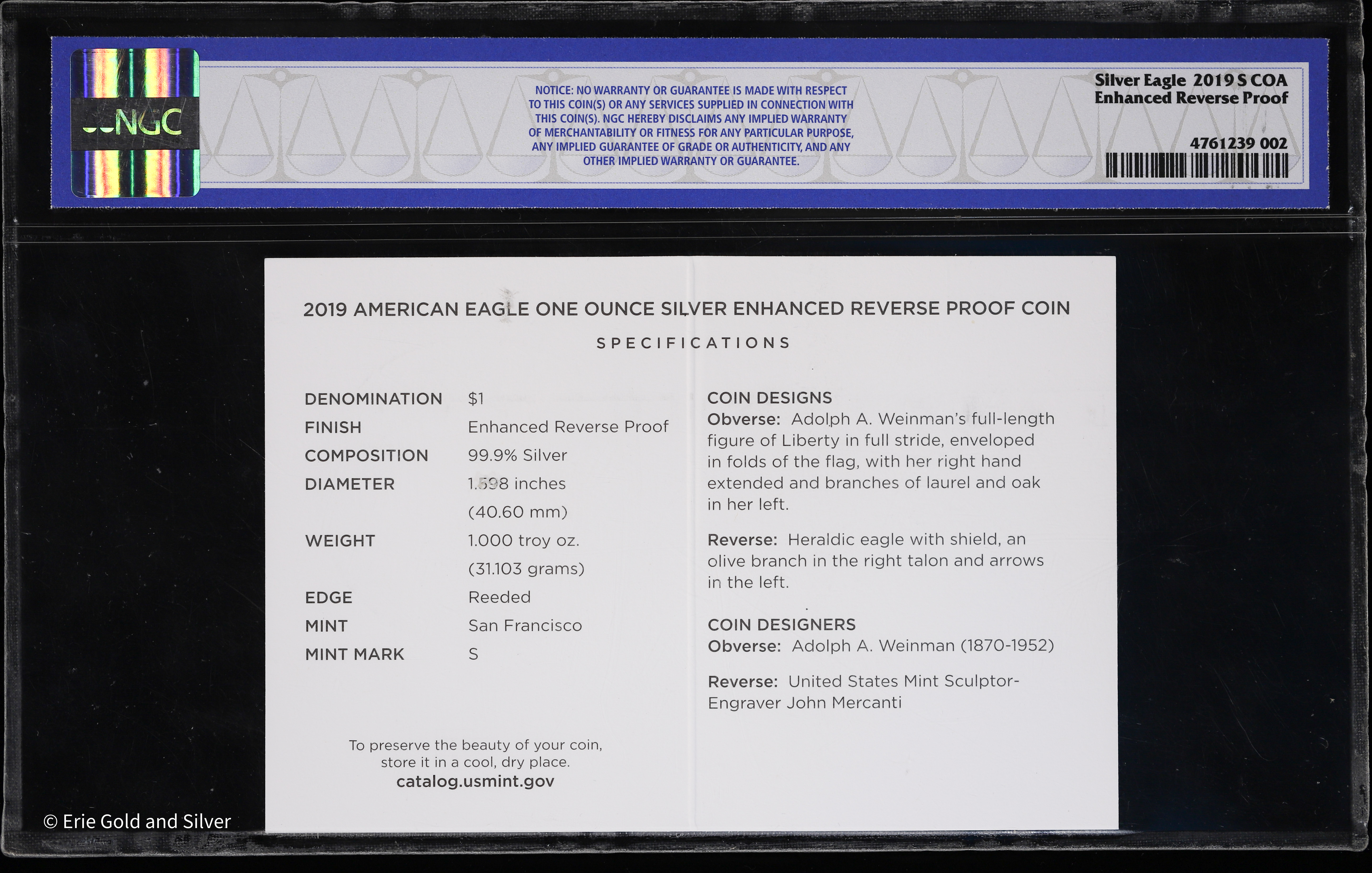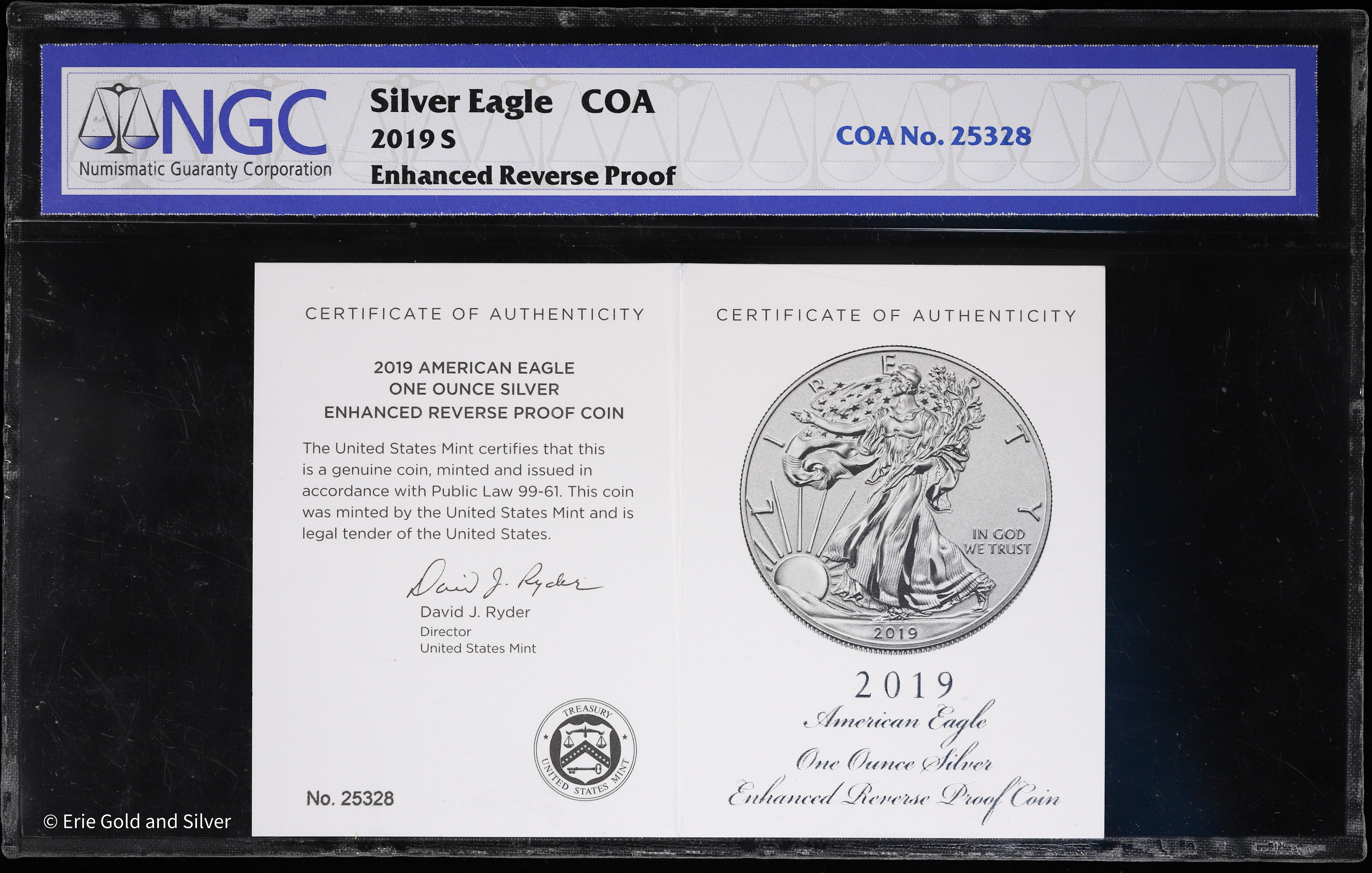 For sale is a 2019-S 1 oz Silver $1 American Eagle, Enhanced Reverse Proof with COA No. 25328. Graded by NGC at Rev PR 69.