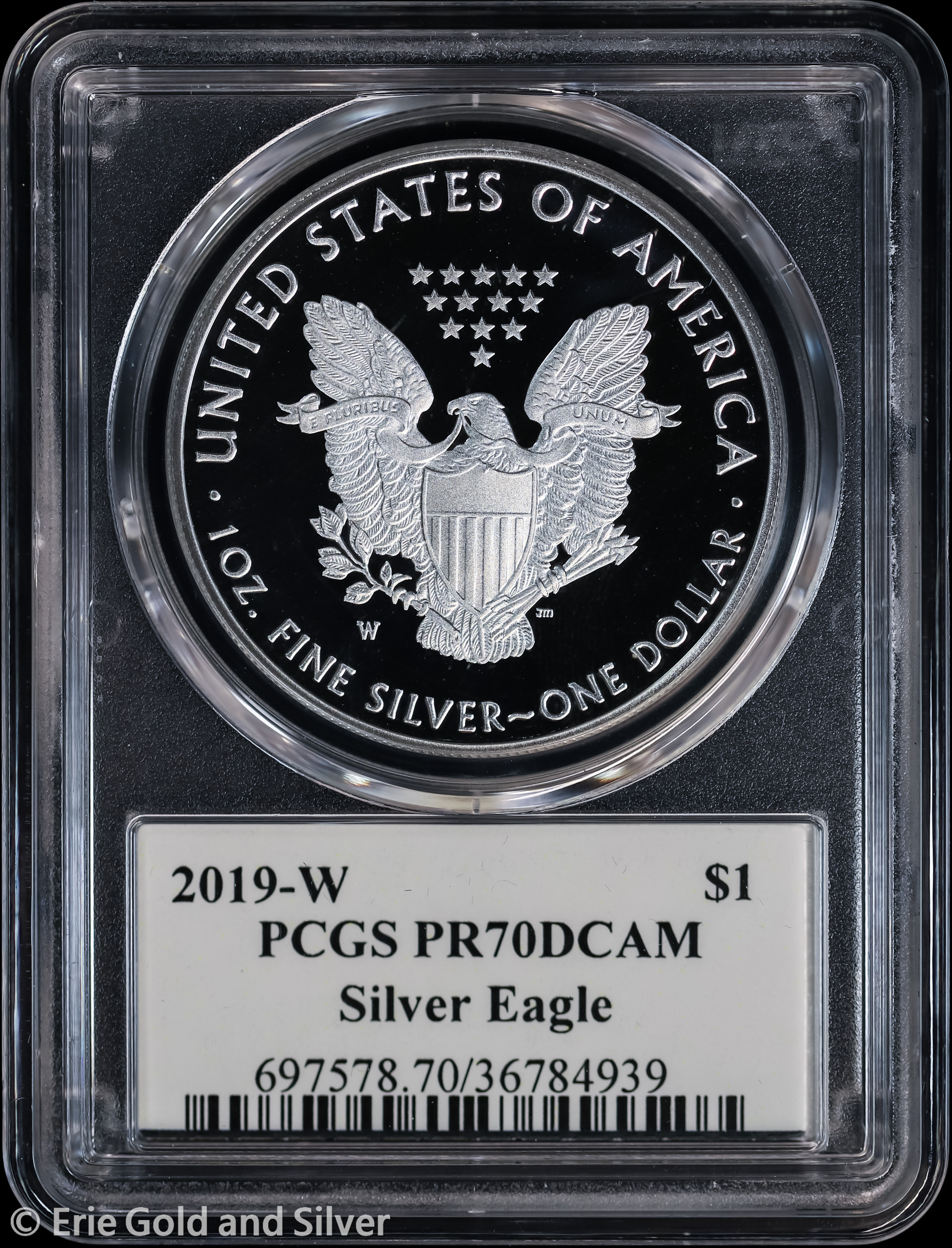 For sale is a 2019-W Proof American Silver Eagle with COA. Certified / graded by PCGS at PR 70 DCAM.