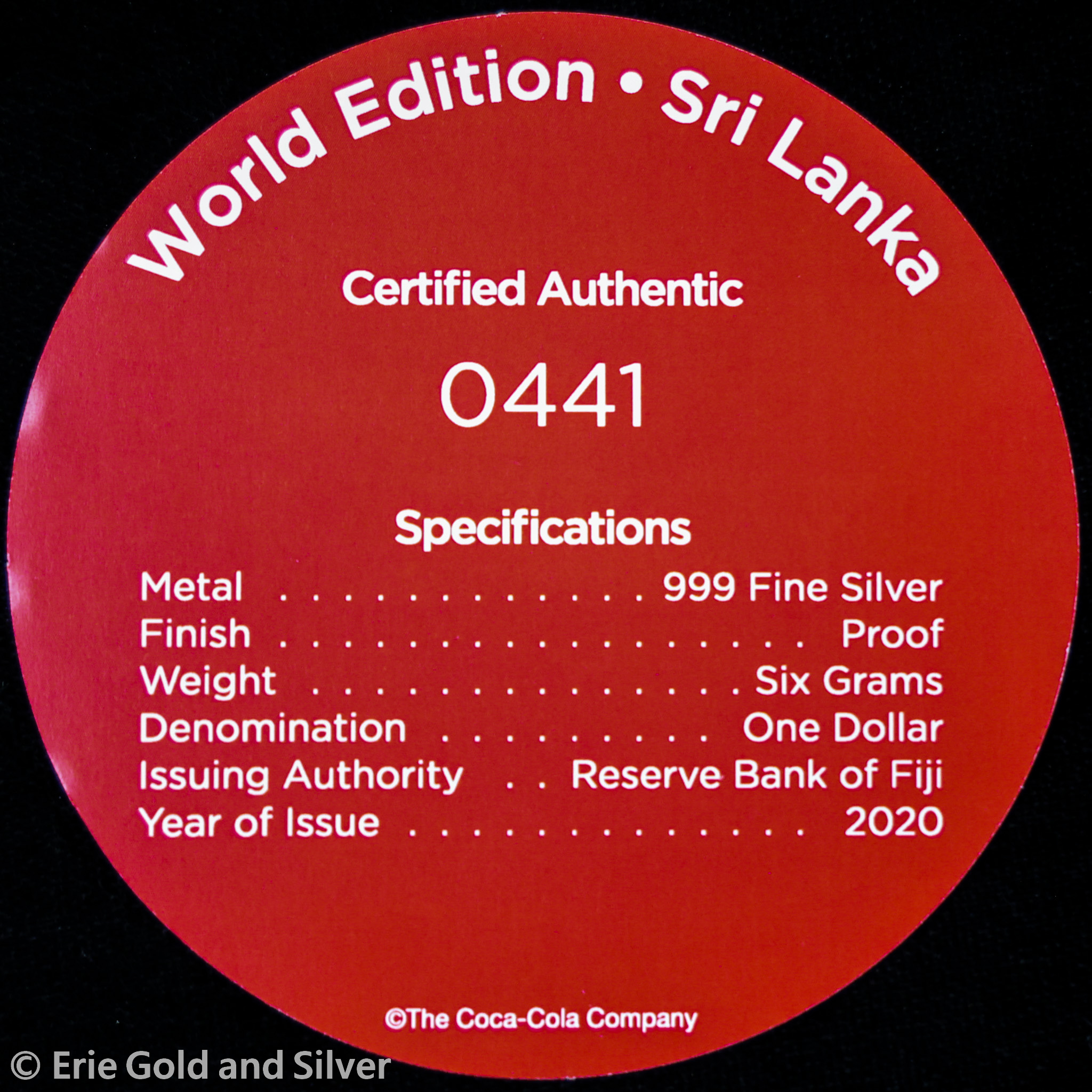 For sale is a 2020 $1 Fiji Coca-Cola 6g Silver Bottle Cap World Edition Sri Lanka in OGP.