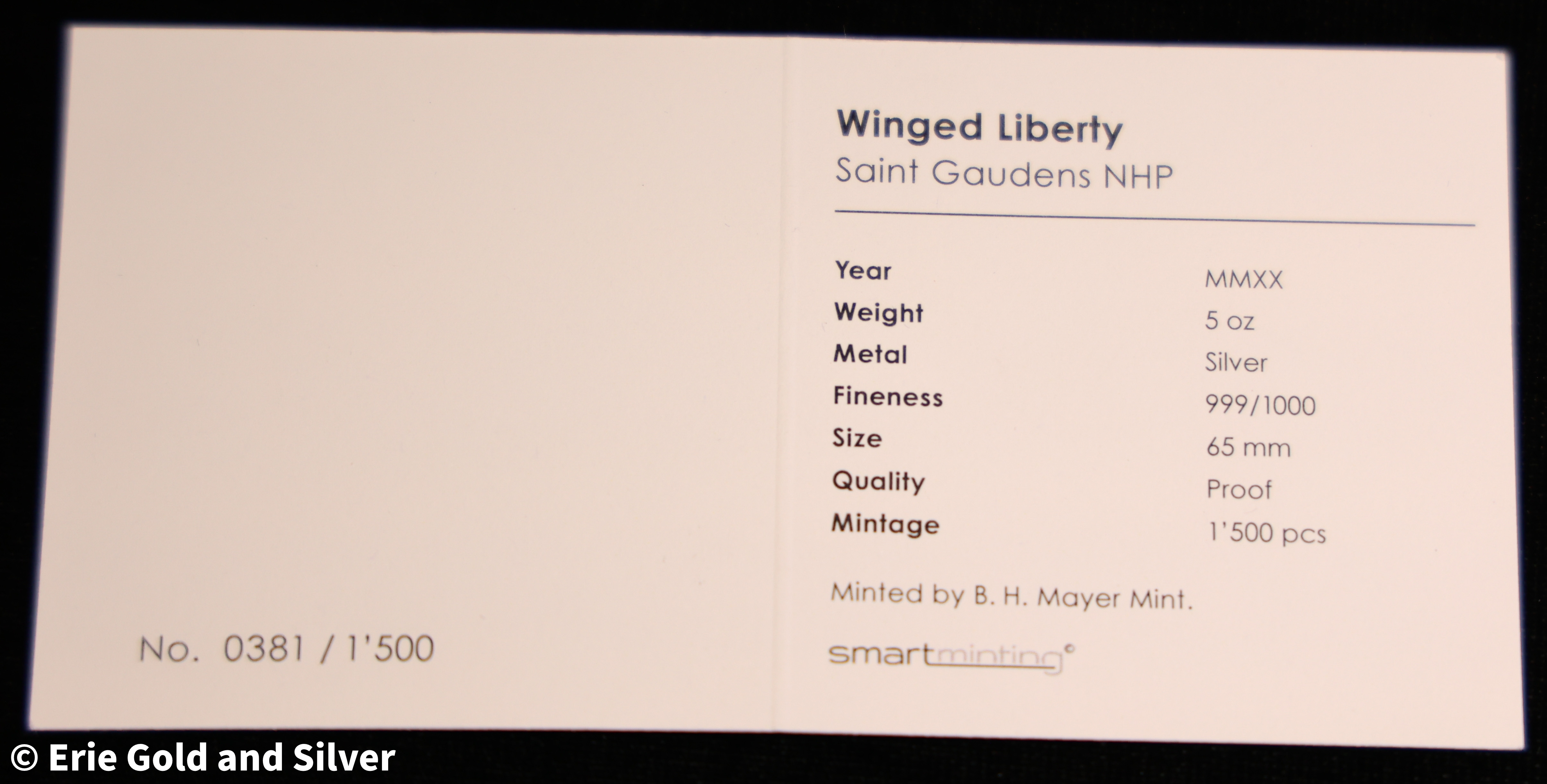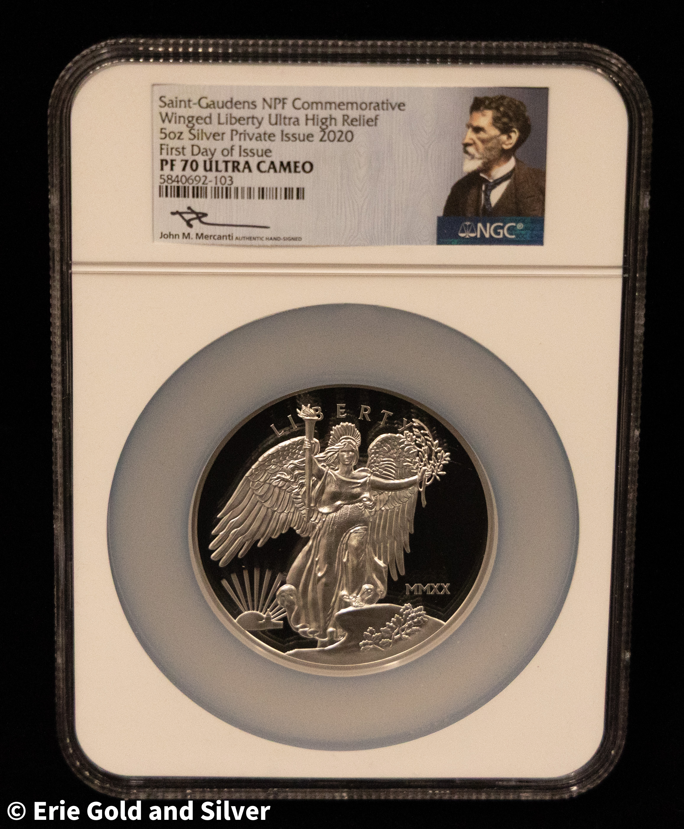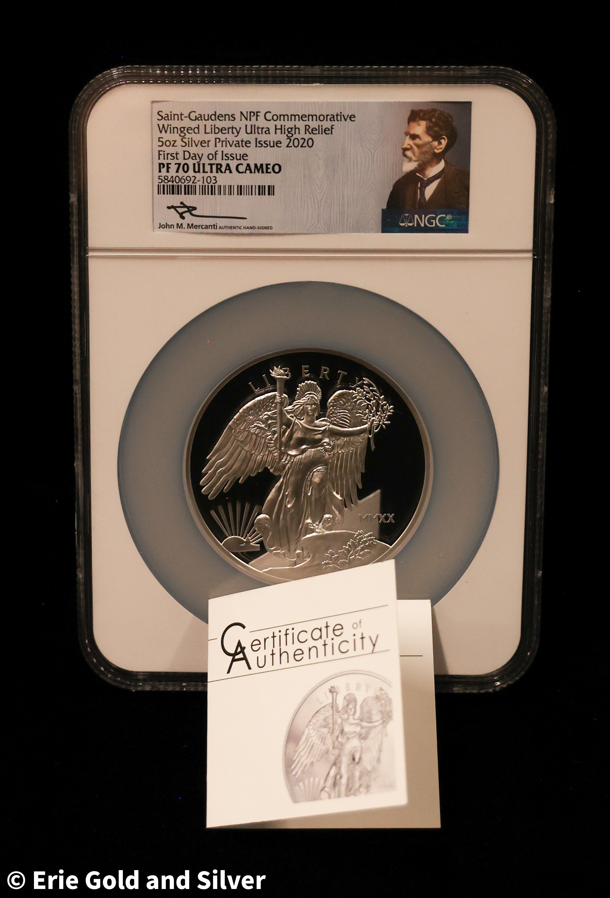For sale is a 2020 Saint-Gaudens Winged Liberty UHR 5 oz Silver NGC FDOI PF70 comes with a display box
