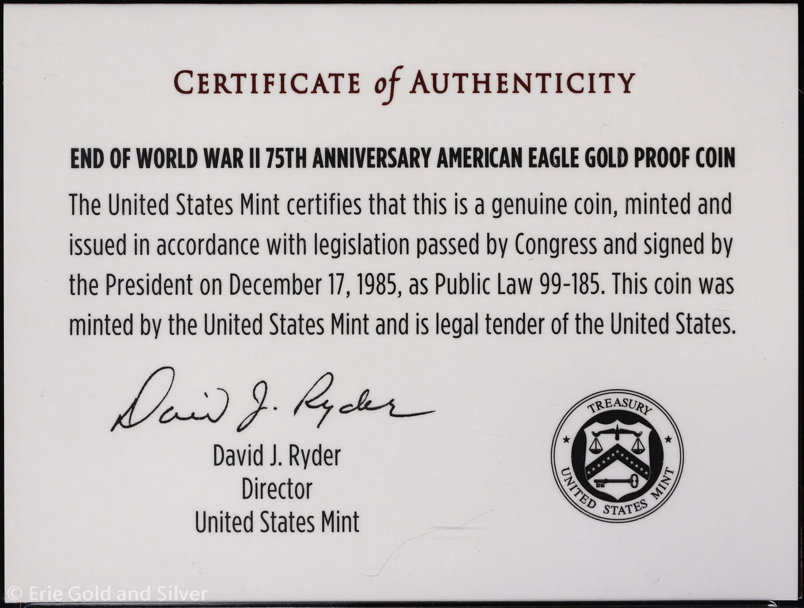 2020-W v75 Privy Gold Eagle COA PCGS | Certificate of Authenticity ONLY