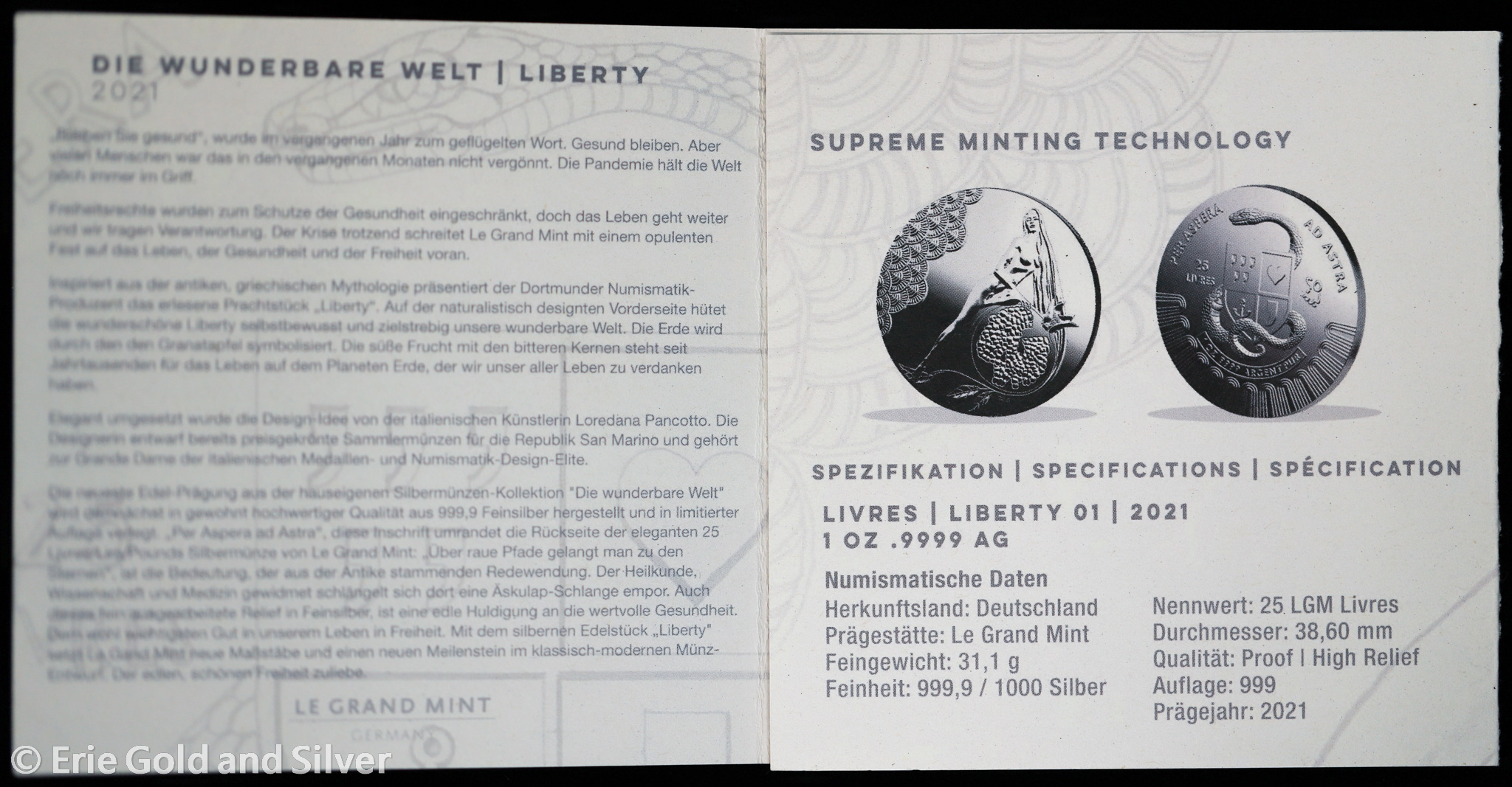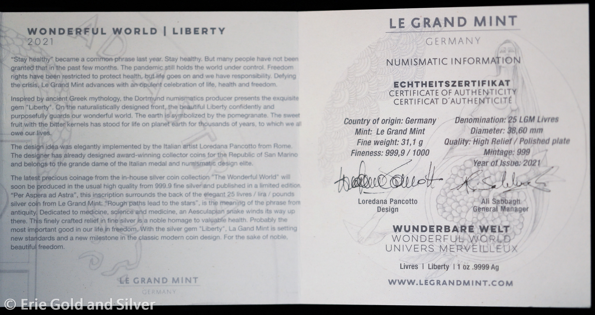 For sale is a 2021 Germany Le Grand Mint Wonderful World Liberty 1 oz Silver Round in OGP.