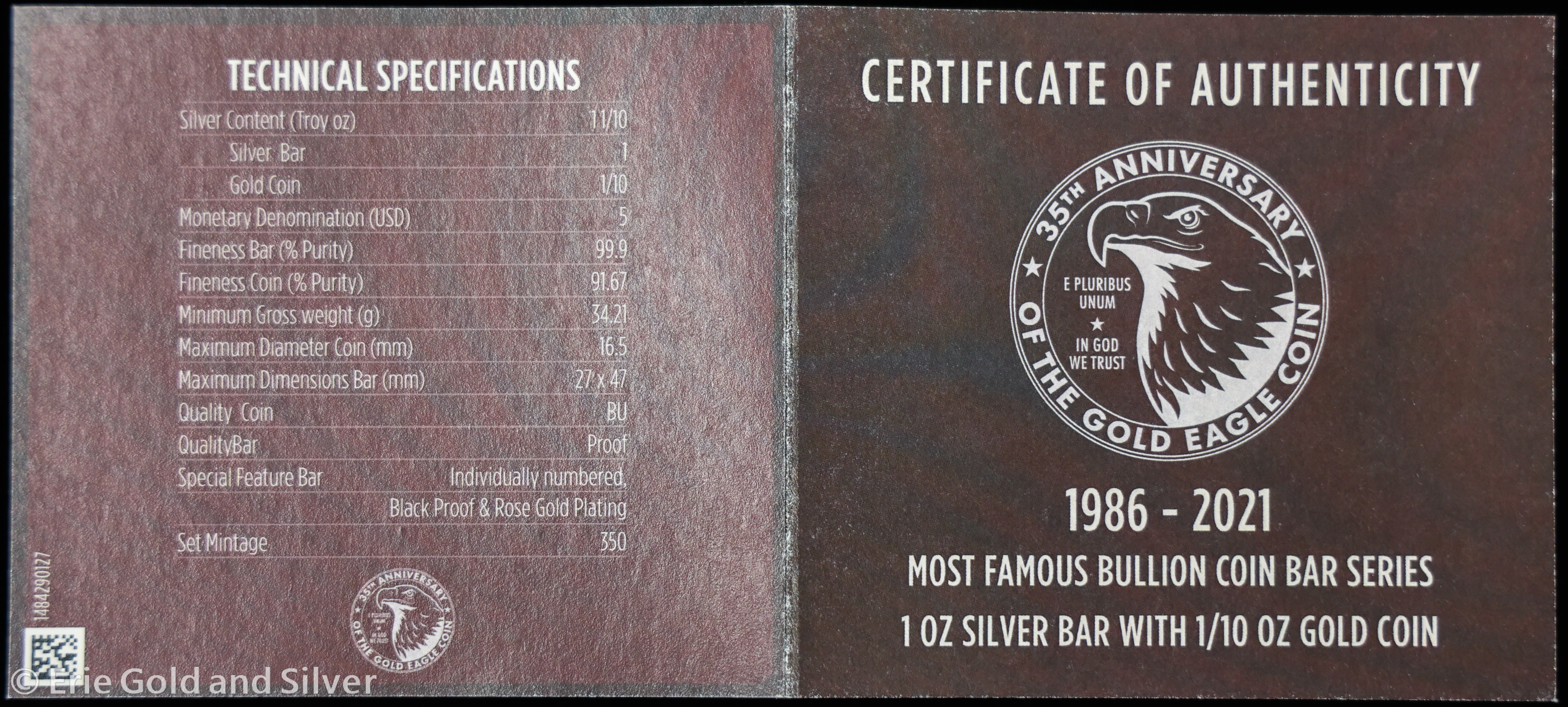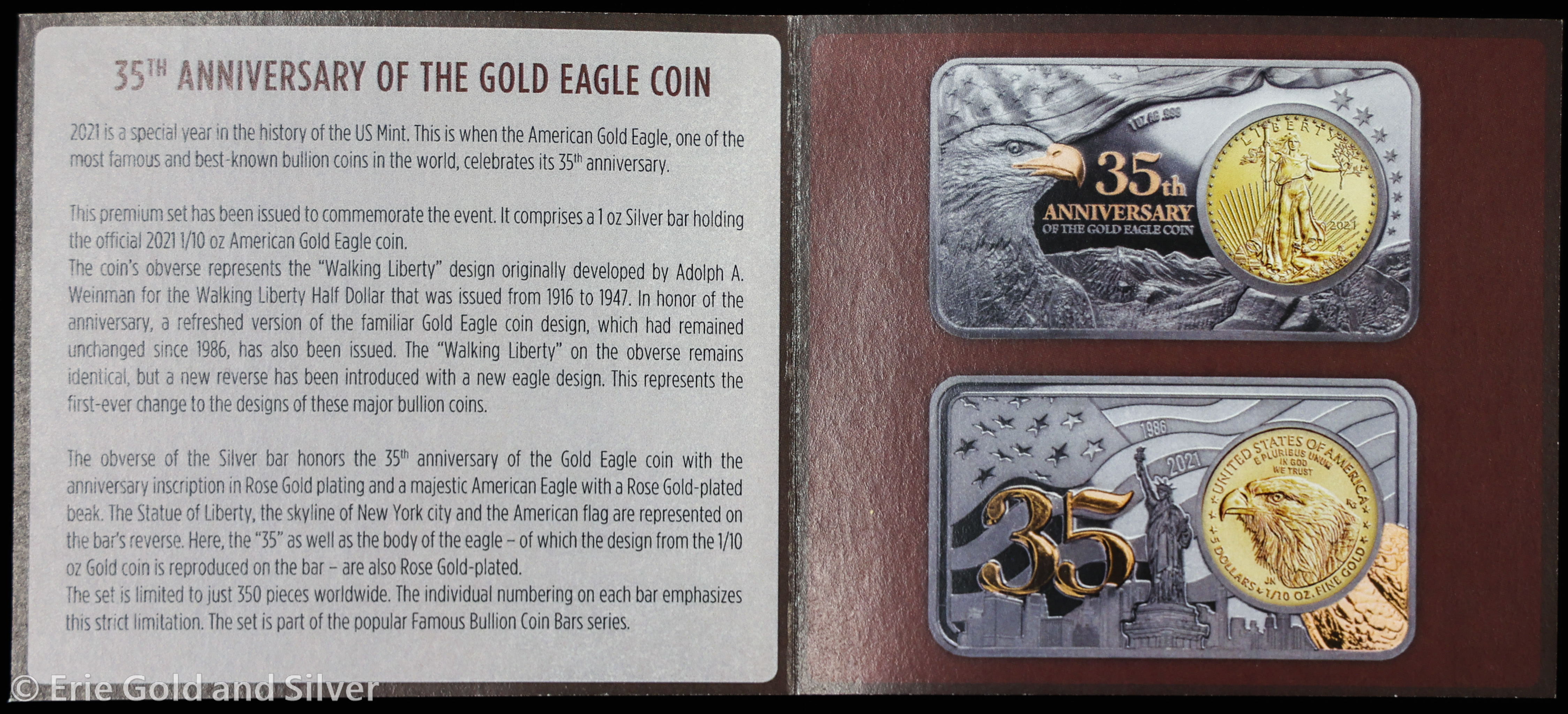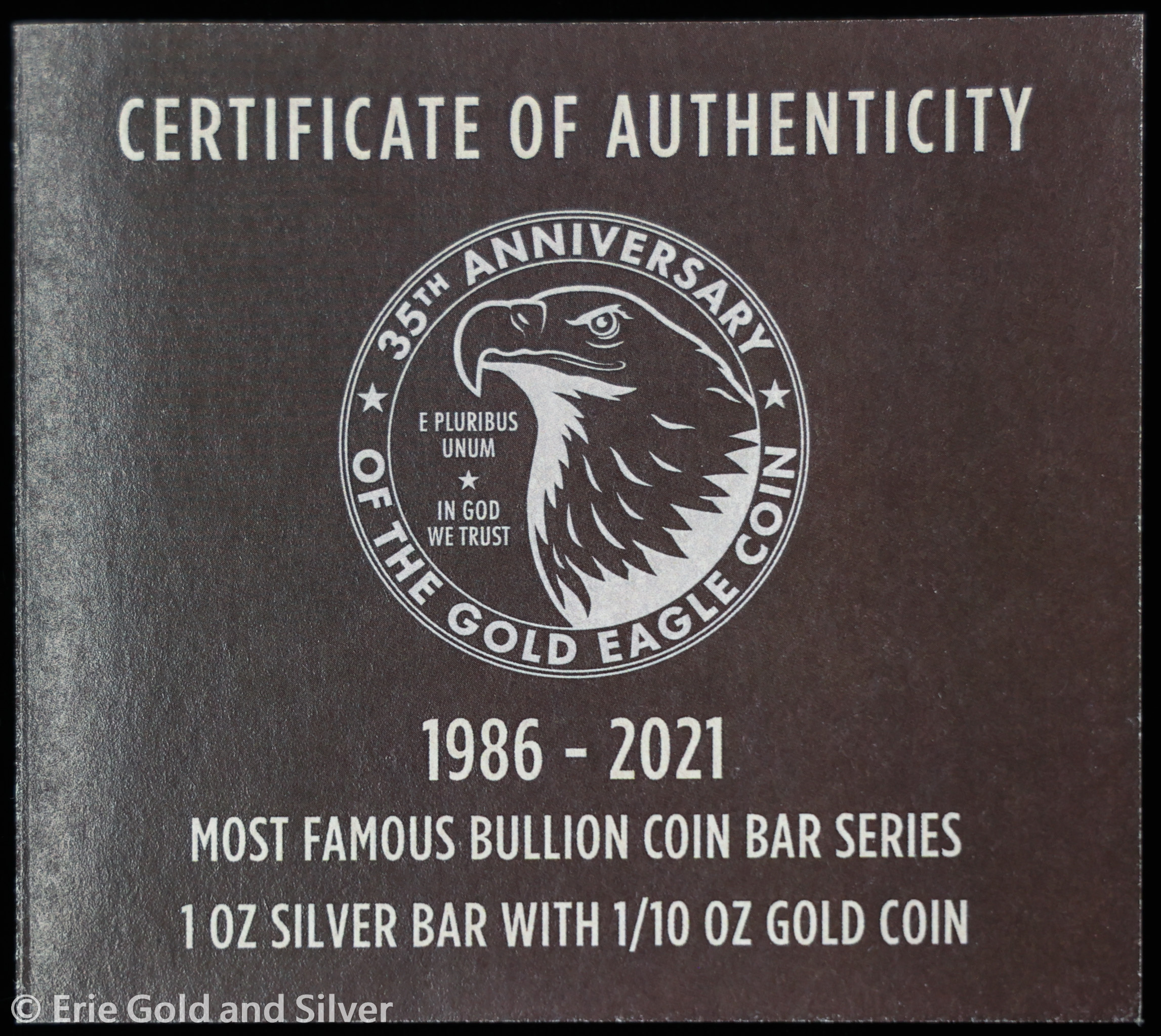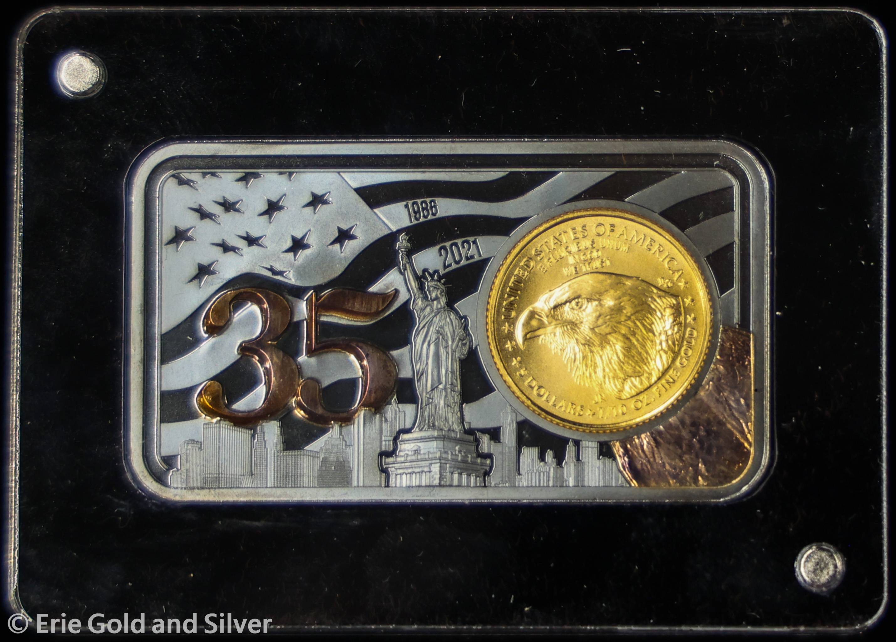 2021 Gold Eagle 35th Anniversary Commemorative 1 oz Silver Bar with 1/10 oz Gold Coin in OGP