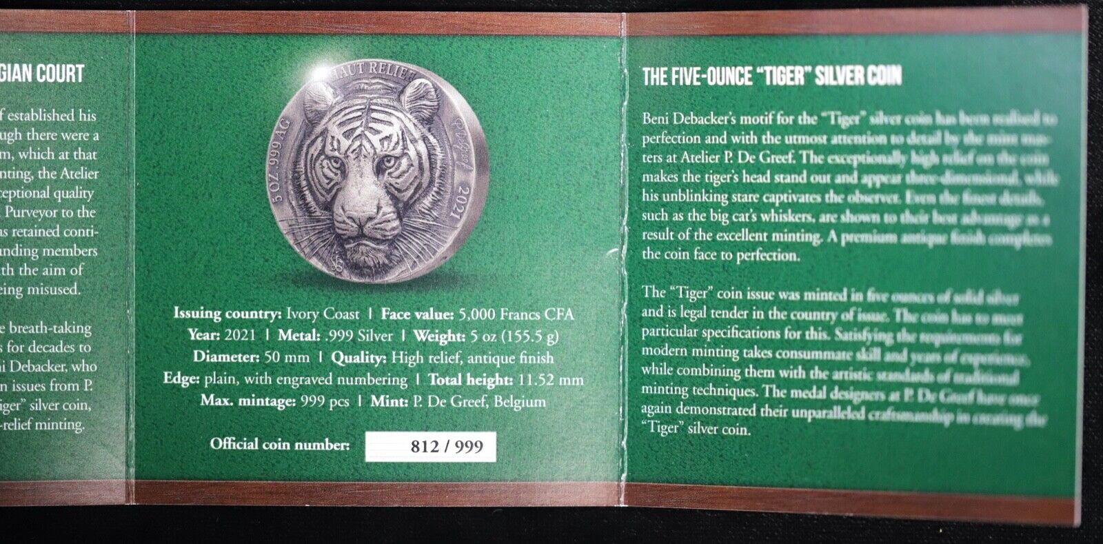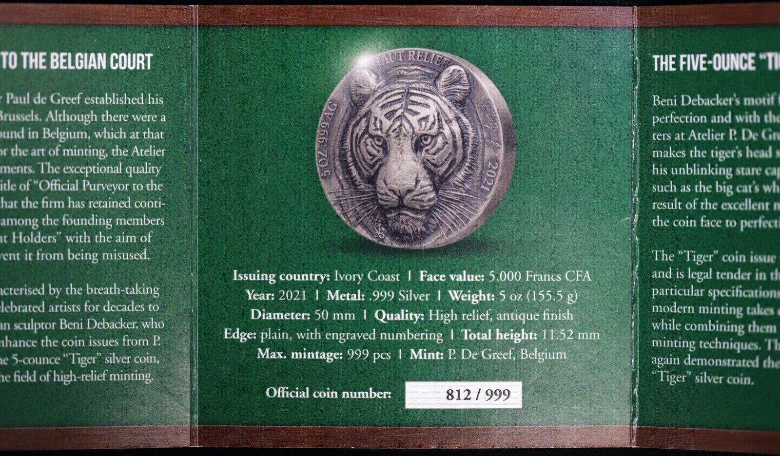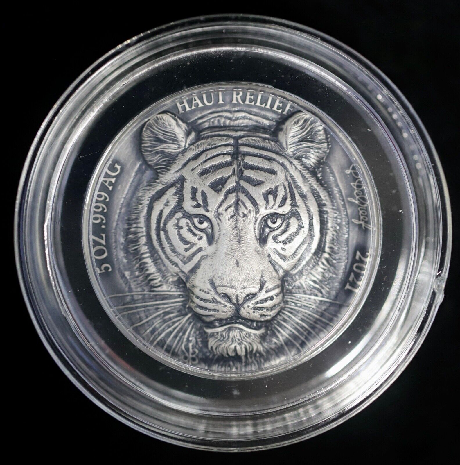 2021 Ivory Coast 5 oz High Relief Antiqued Finish Tiger with Box & COA