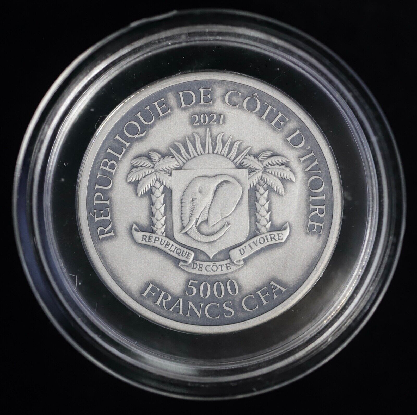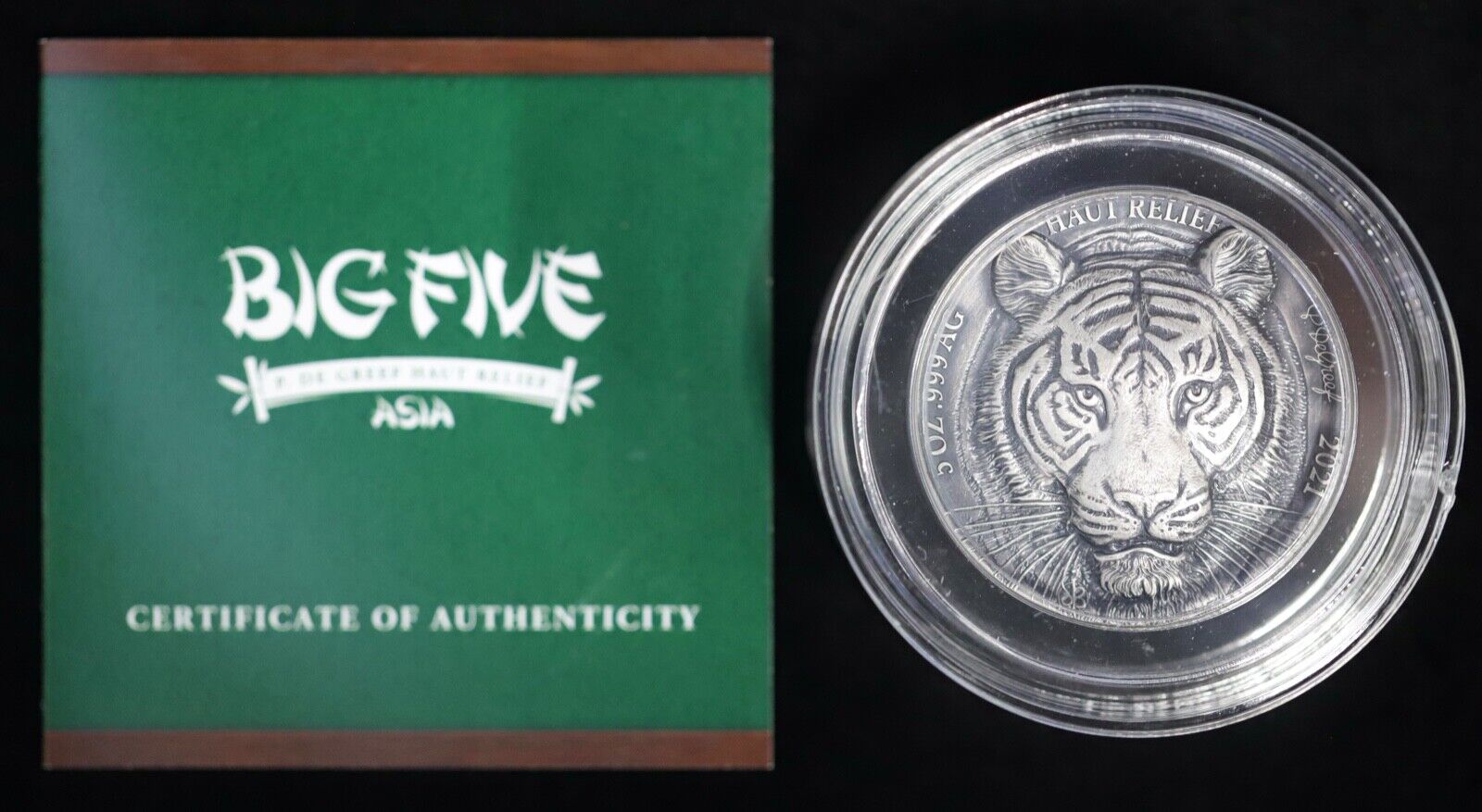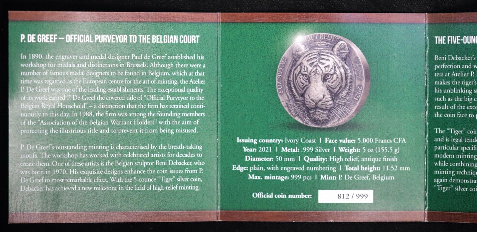 2021 Ivory Coast 5 oz High Relief Antiqued Finish Tiger with Box & COA