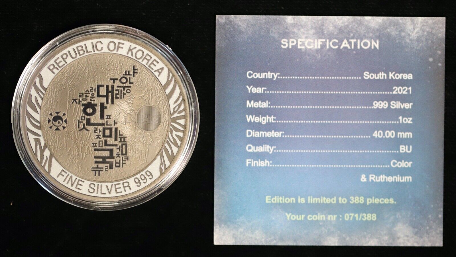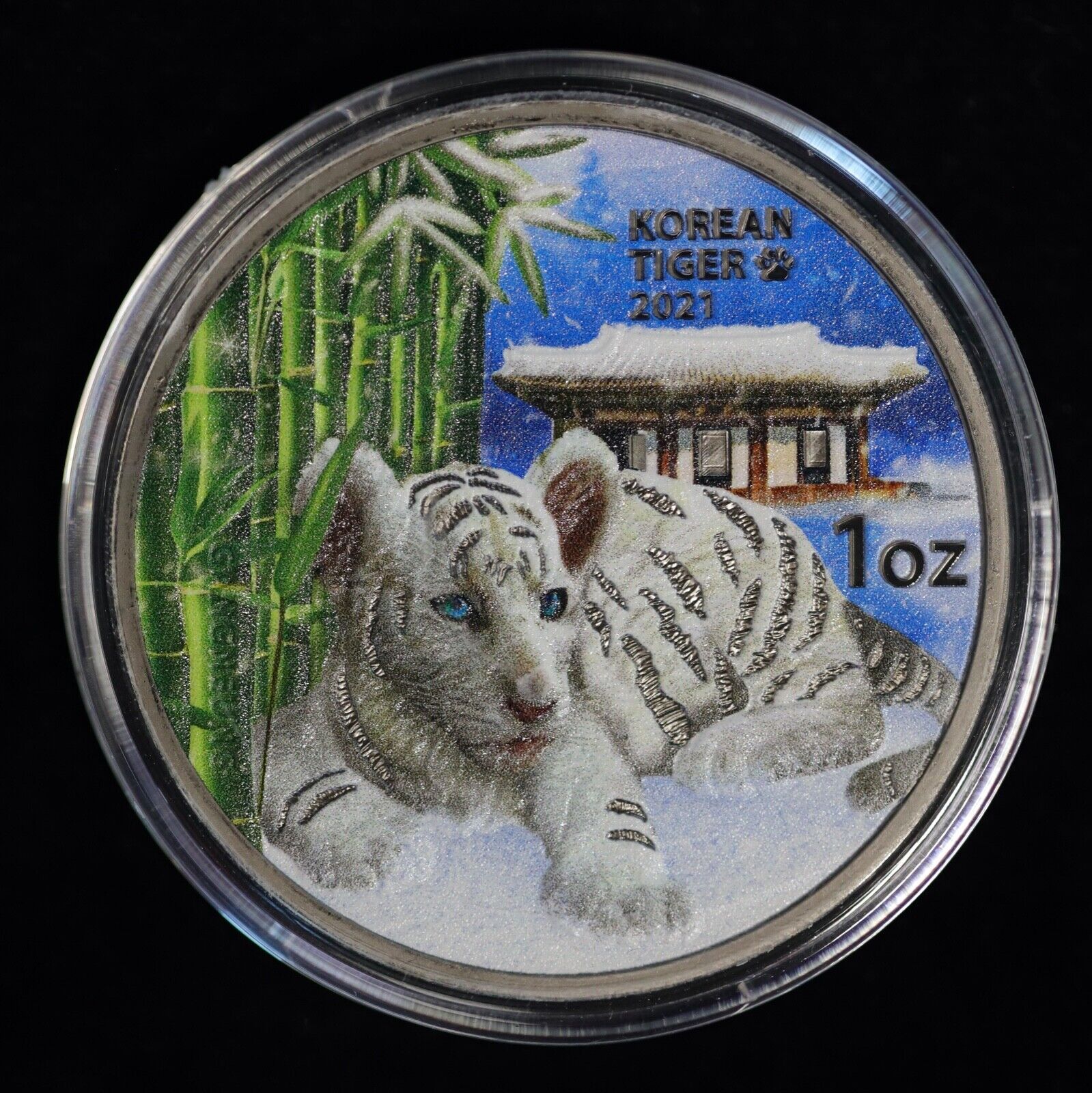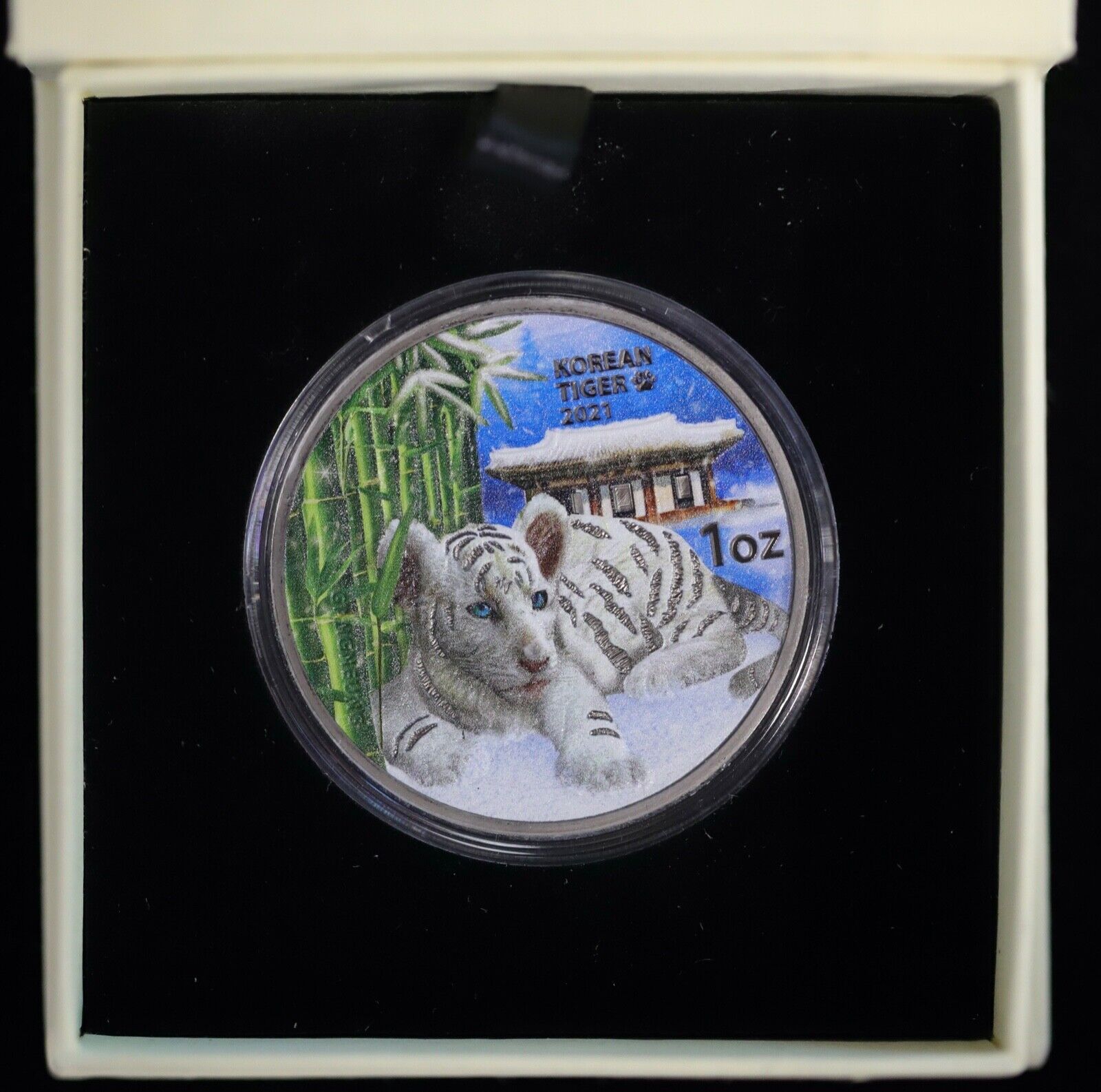 For sale is a 2021 South Korea Tiger "Baekho Edition" 1 oz Silver Colorized Coin with Box & COA. View pictures for details and condition. There are multiple available, so the coin you receive may not be the exact coin pictured, however it will be similar quality. Feel free to contact us with any questions.