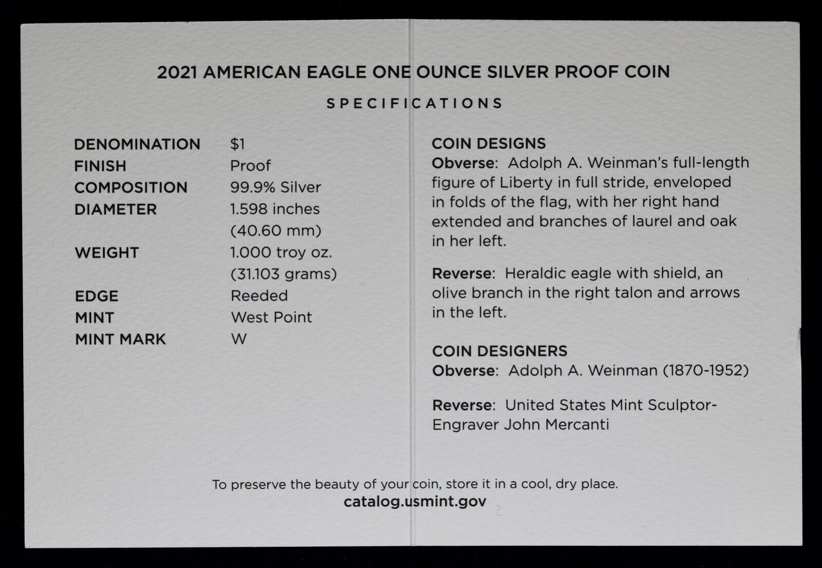 2021 W Type 1 Proof American Silver Eagle with Box & COA US Mint OGP 1 oz Silver