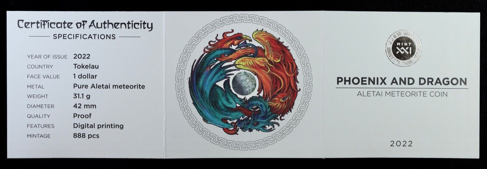 2022 $1 Dragon and Phoenix Pure Aletai Meteorite Proof Coin Tokelau W/ Box & COA