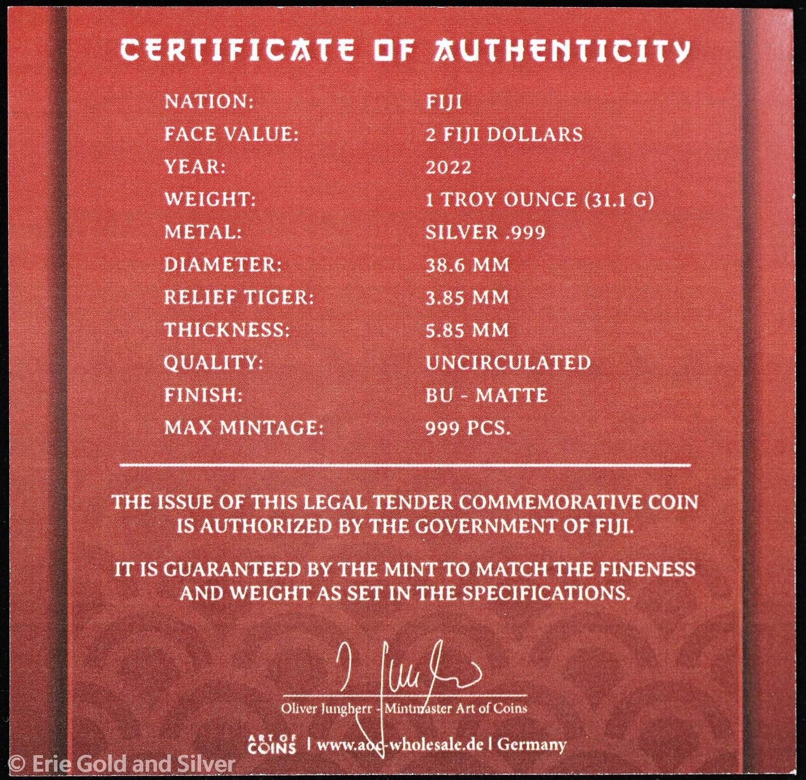 2022 $2 Fiji 1 oz Silver Lunar Tiger Ultra High Relief w/COA