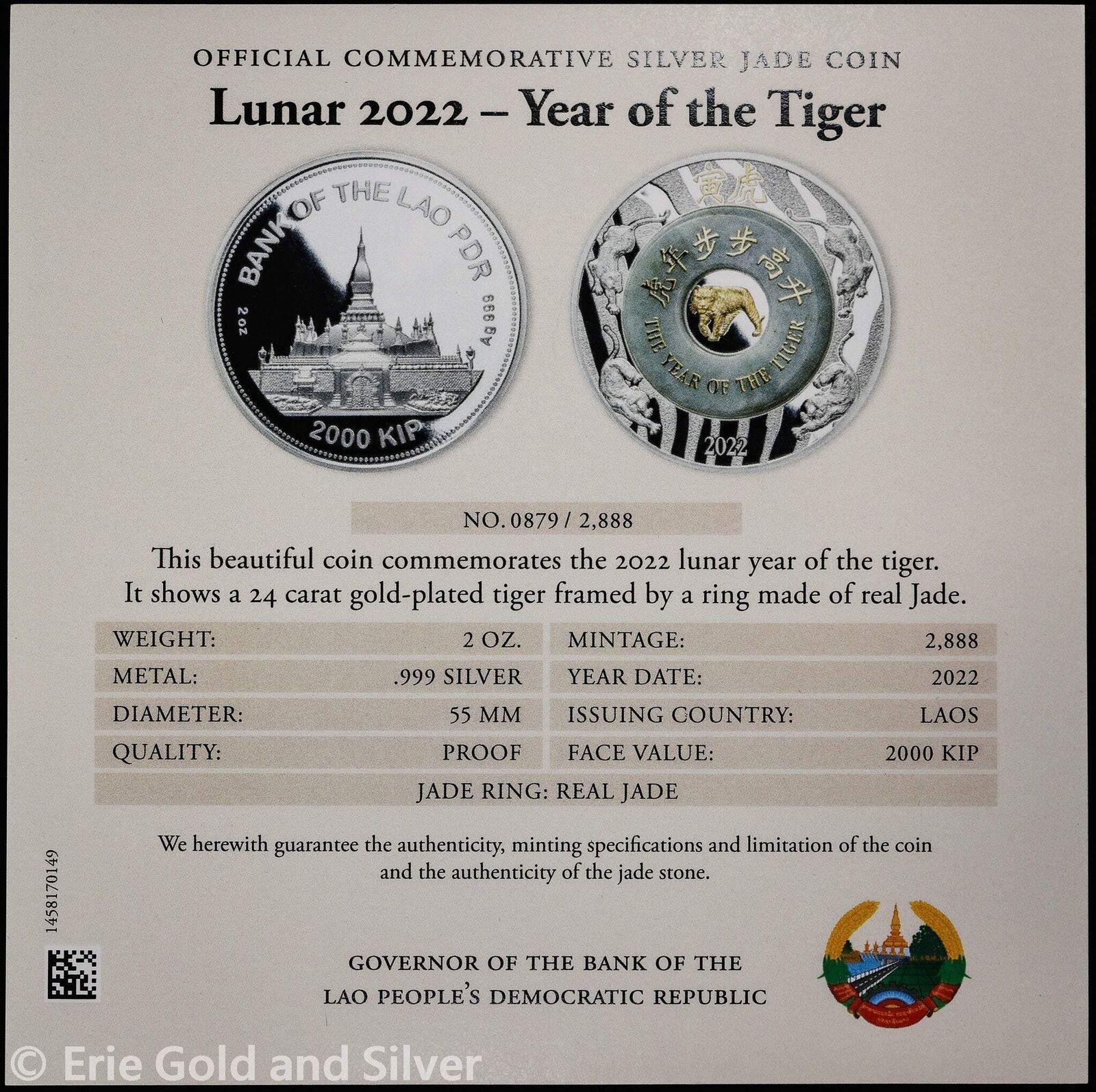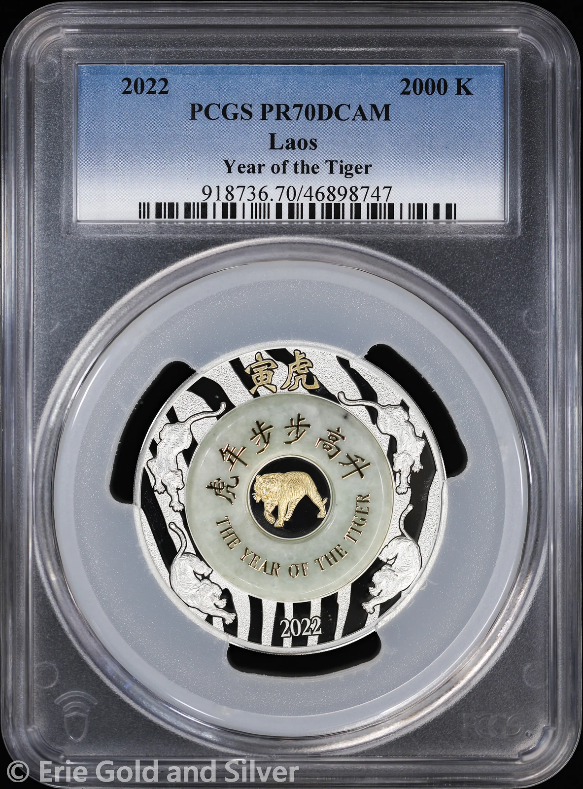 2022 Laos 2 oz Silver & Jade Proof Year of the Tiger PCGS PR 70 DCAM | OGP COA