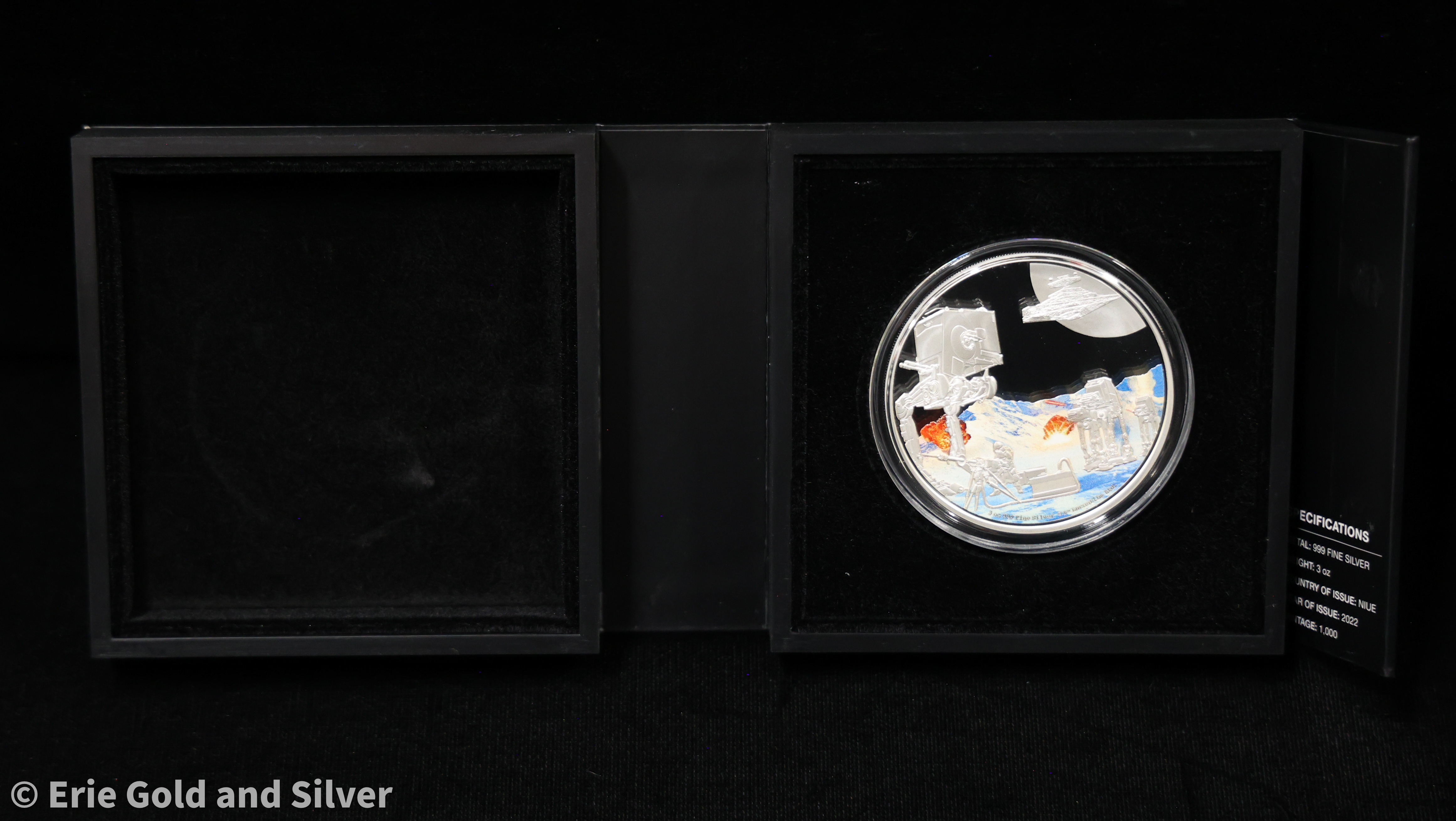 Relive the icy clash on Echo Base with the 2022 Niue Star Wars Battle Scenes: Hoth coin, struck in 3 oz of .999 fine silver. Showcasing the legendary battle in rich detail, this $10 coin captures the epic scale of the saga—an essential addition for Star Wars fans and collectors of cinematic silver.