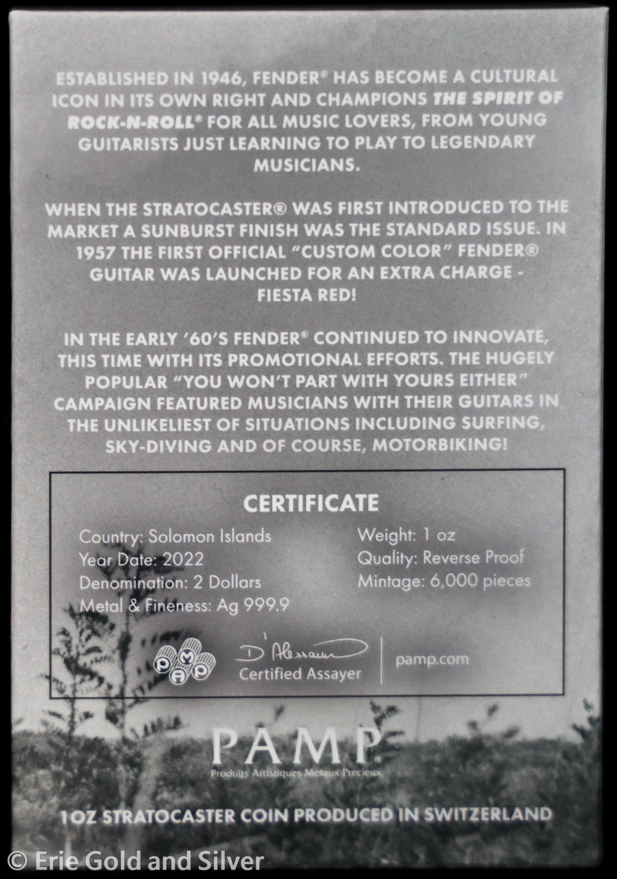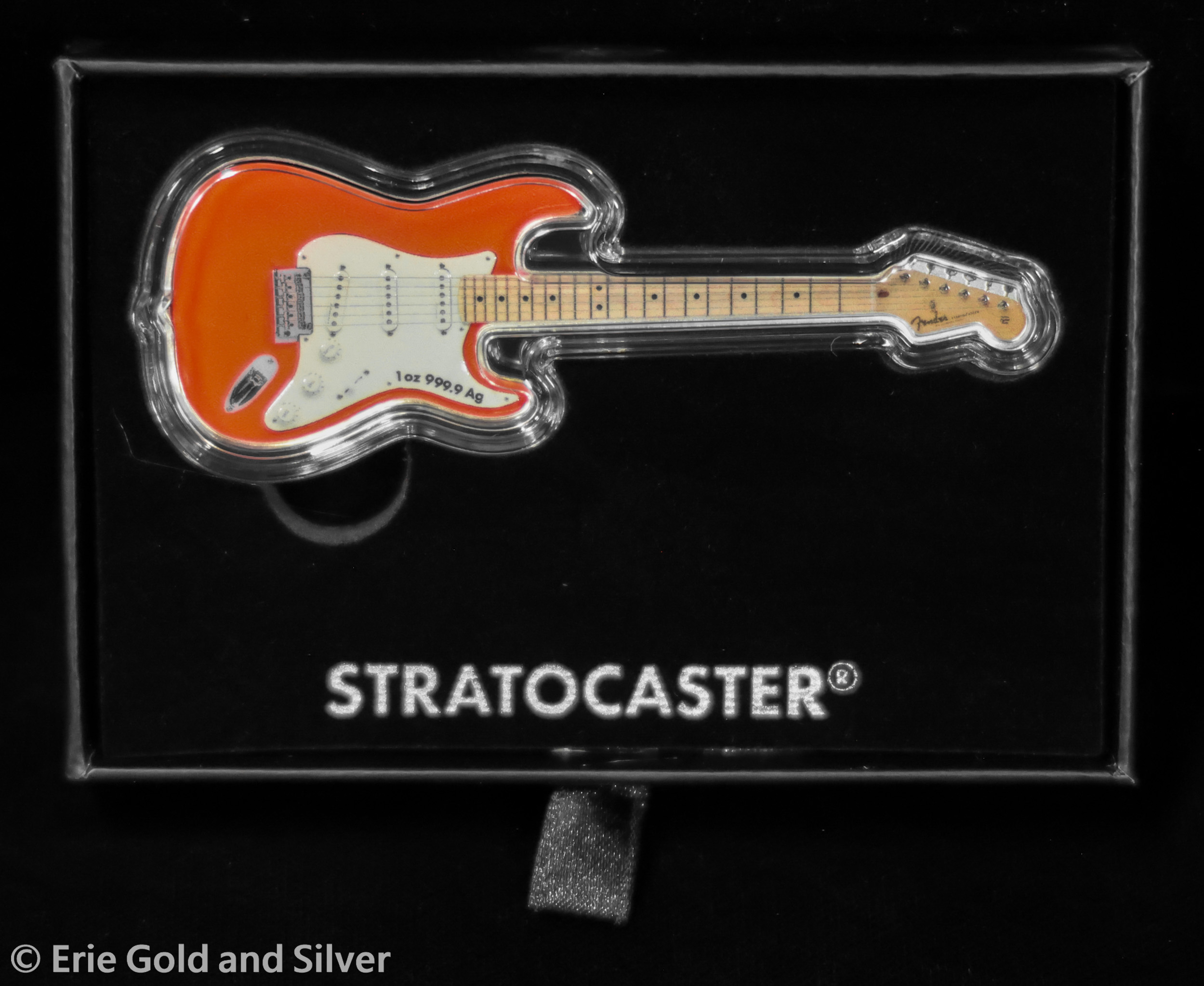 For sale is a 2022 $2 PAMP Solomon Islands 1 oz Silver Reverse Proof Fiesta Red Fender Stratocaster Guitar Shaped Coin in OGP.