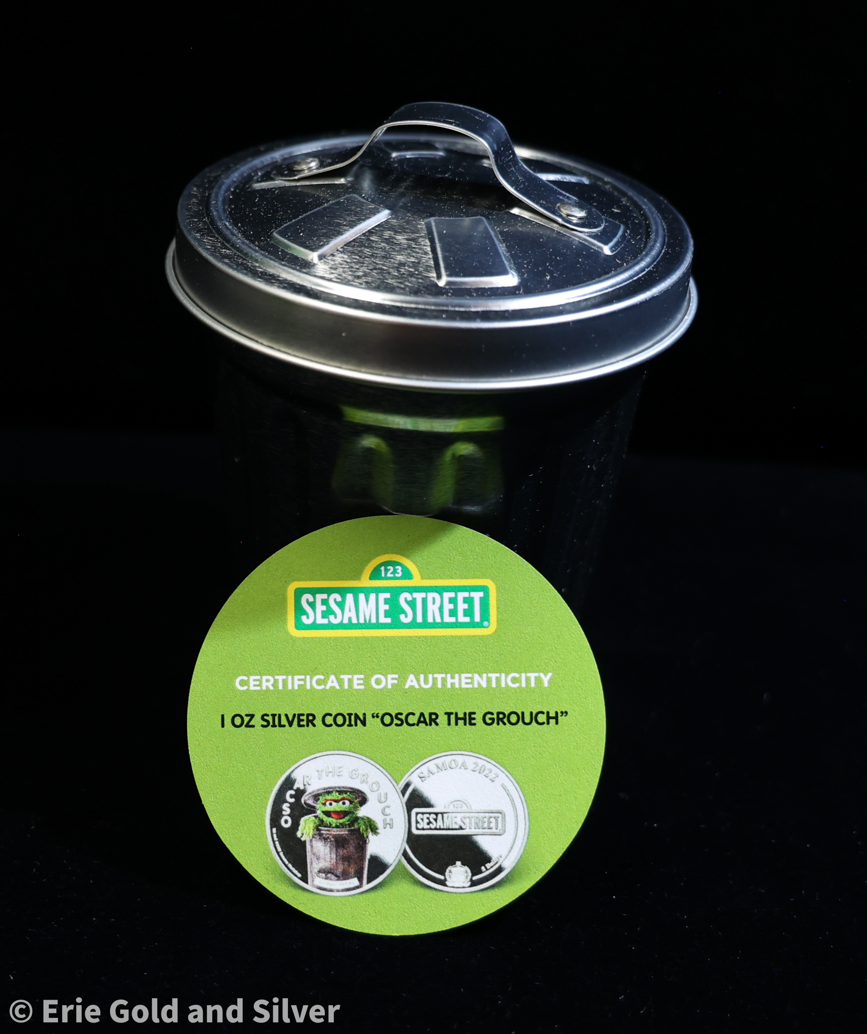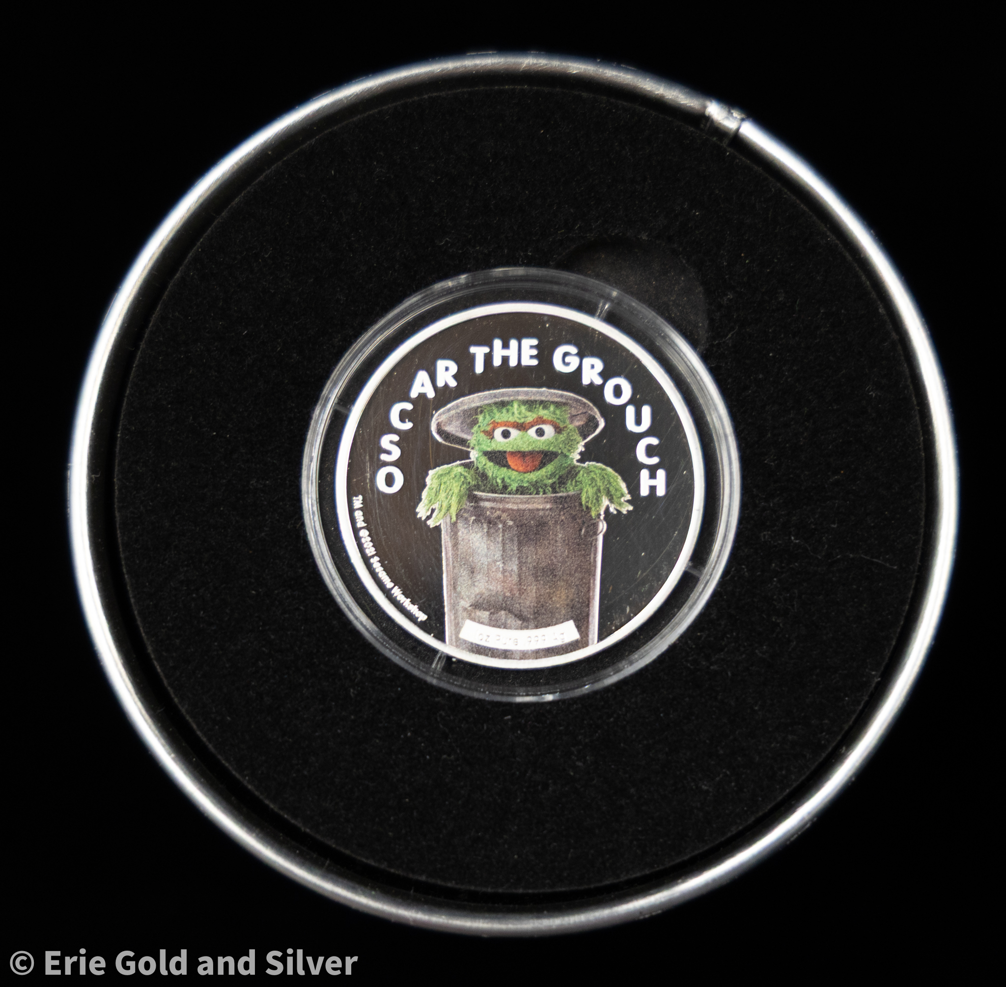For sale is a Sesame Street Oscar the Grouch in a Trash Can 1 oz Silver