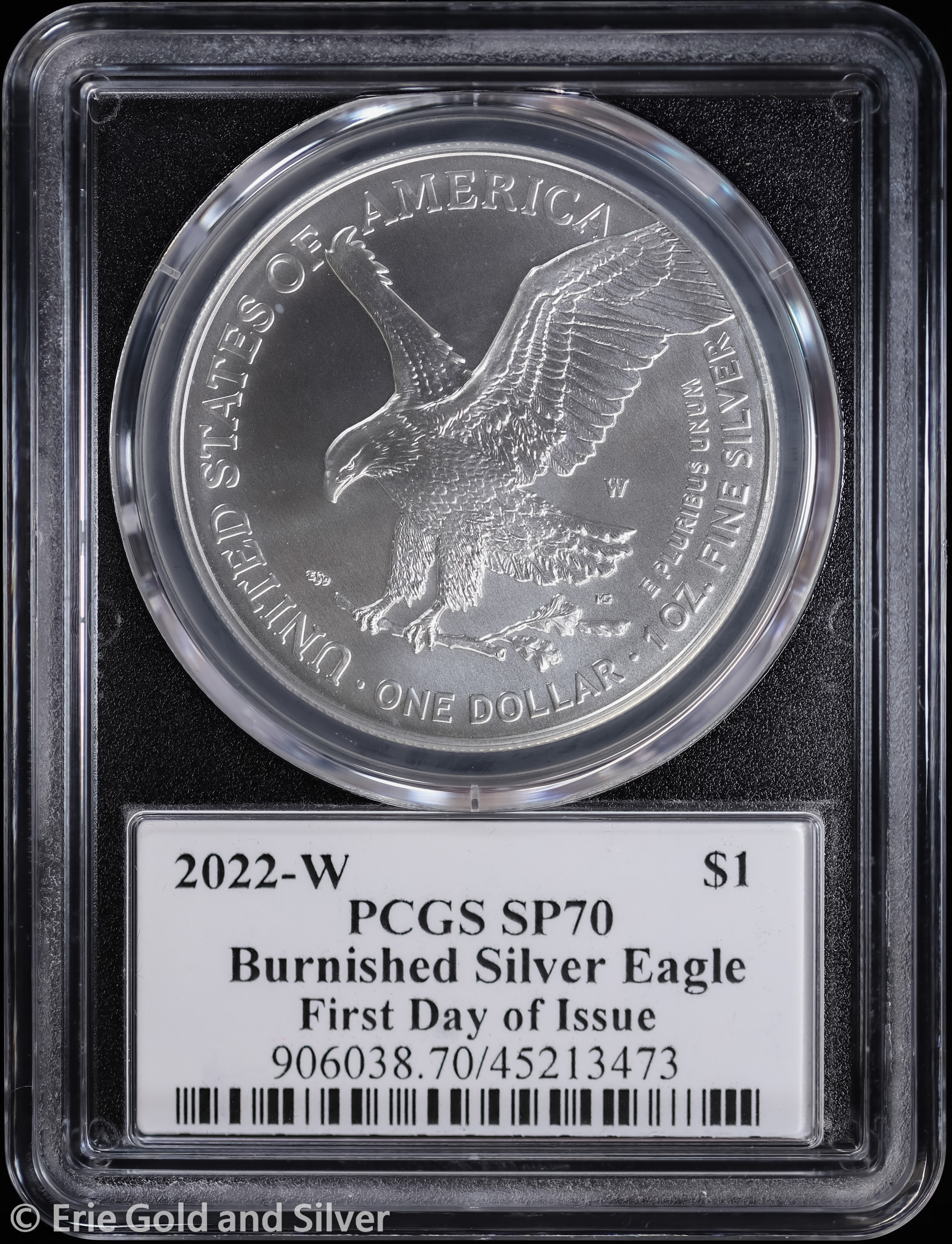 For sale is a 2022-W Burnished American Silver Eagle. Certified / graded by PCGS at SP 70.