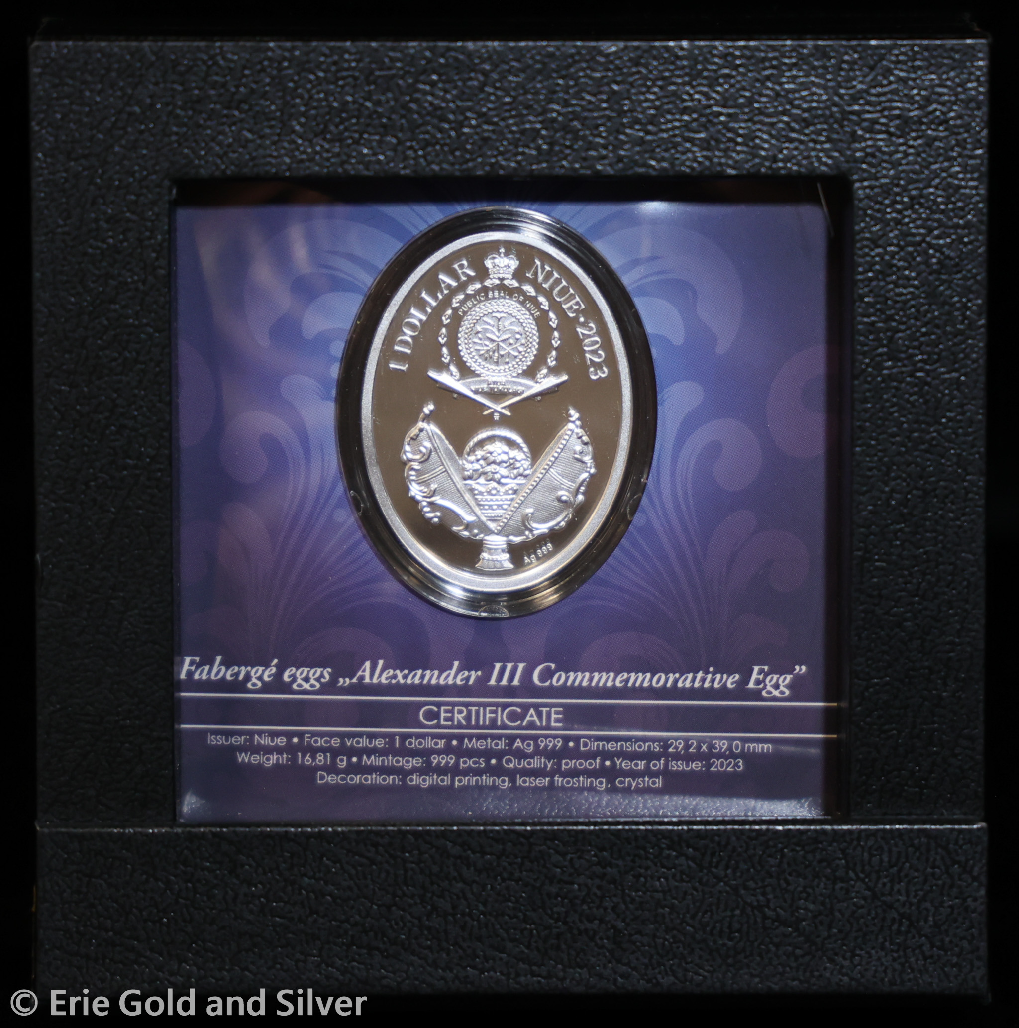 For sale is a 2023 $1 Niue Faberge Eggs Series Alexander III 16.81g Silver Proof Coin in OGP.