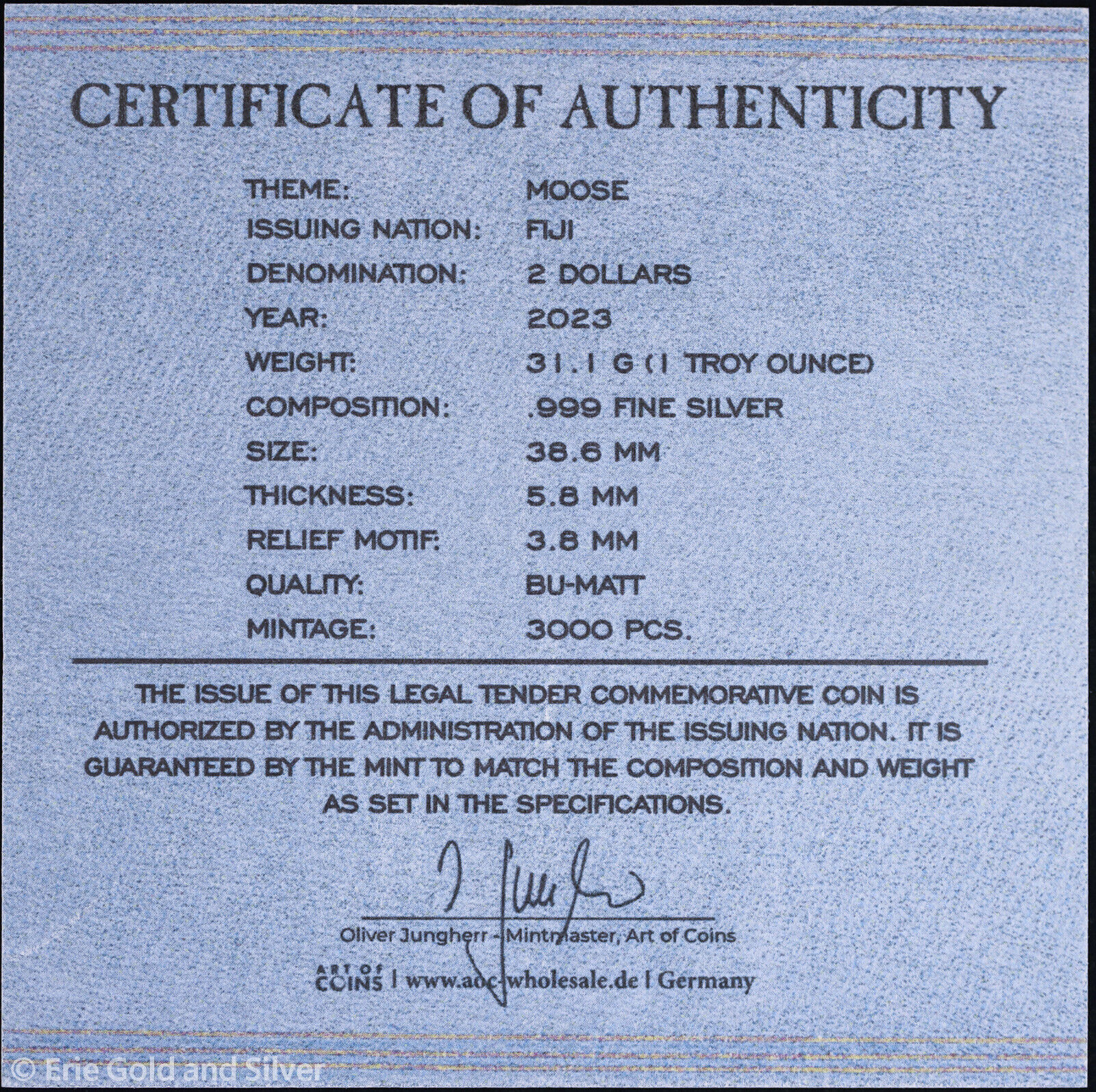 For sale is a 2023 $2 Fiji 1oz Silver America Big Five Moose w/ COA. There are multiple available, so the coin you receive may not be the exact coin pictured. However, it will be similar quality. Feel free to contact us with any questions.