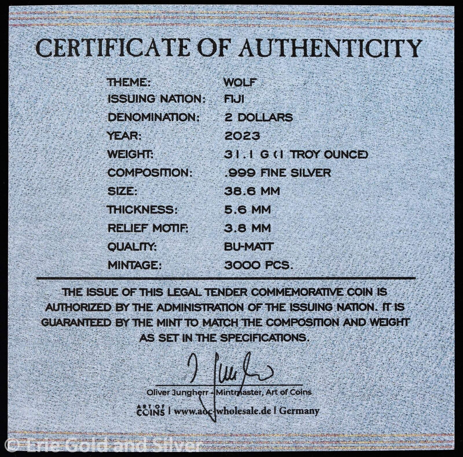 For sale is a 2023 Fiji 1 oz Silver America Big Five Wolf w/COA. View pictures for details and condition. There are multiple available, so the coin you receive may not be the exact coin pictured. However, it will be similar quality. Feel free to contact us with any questions.