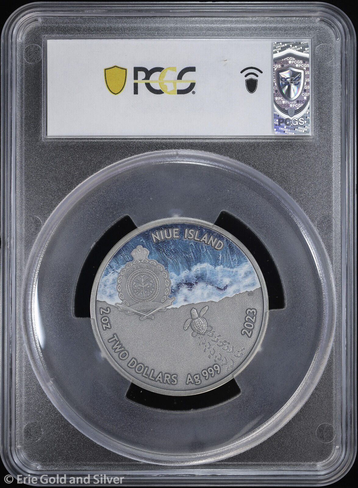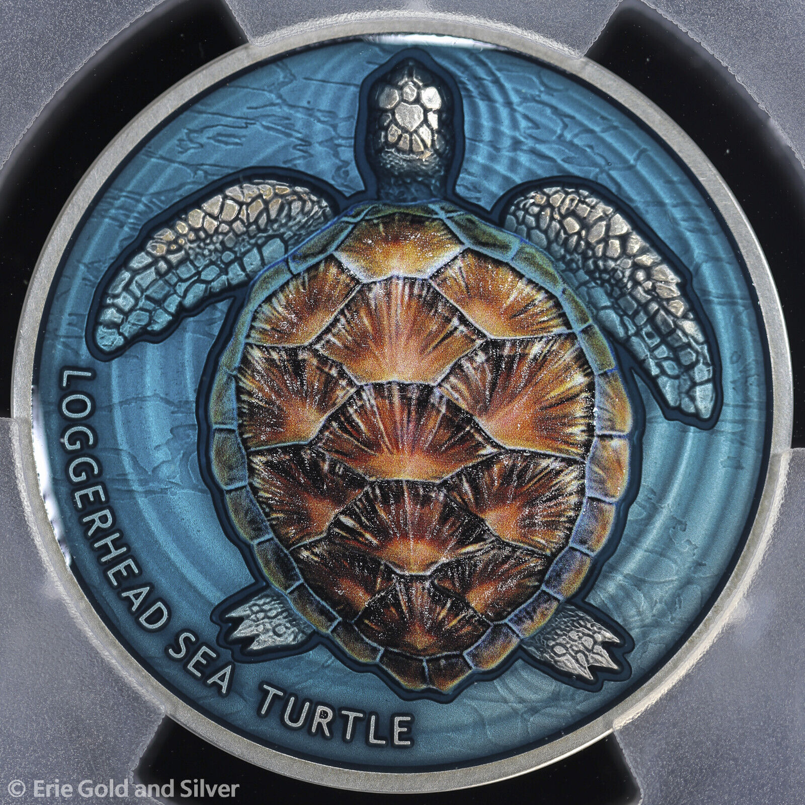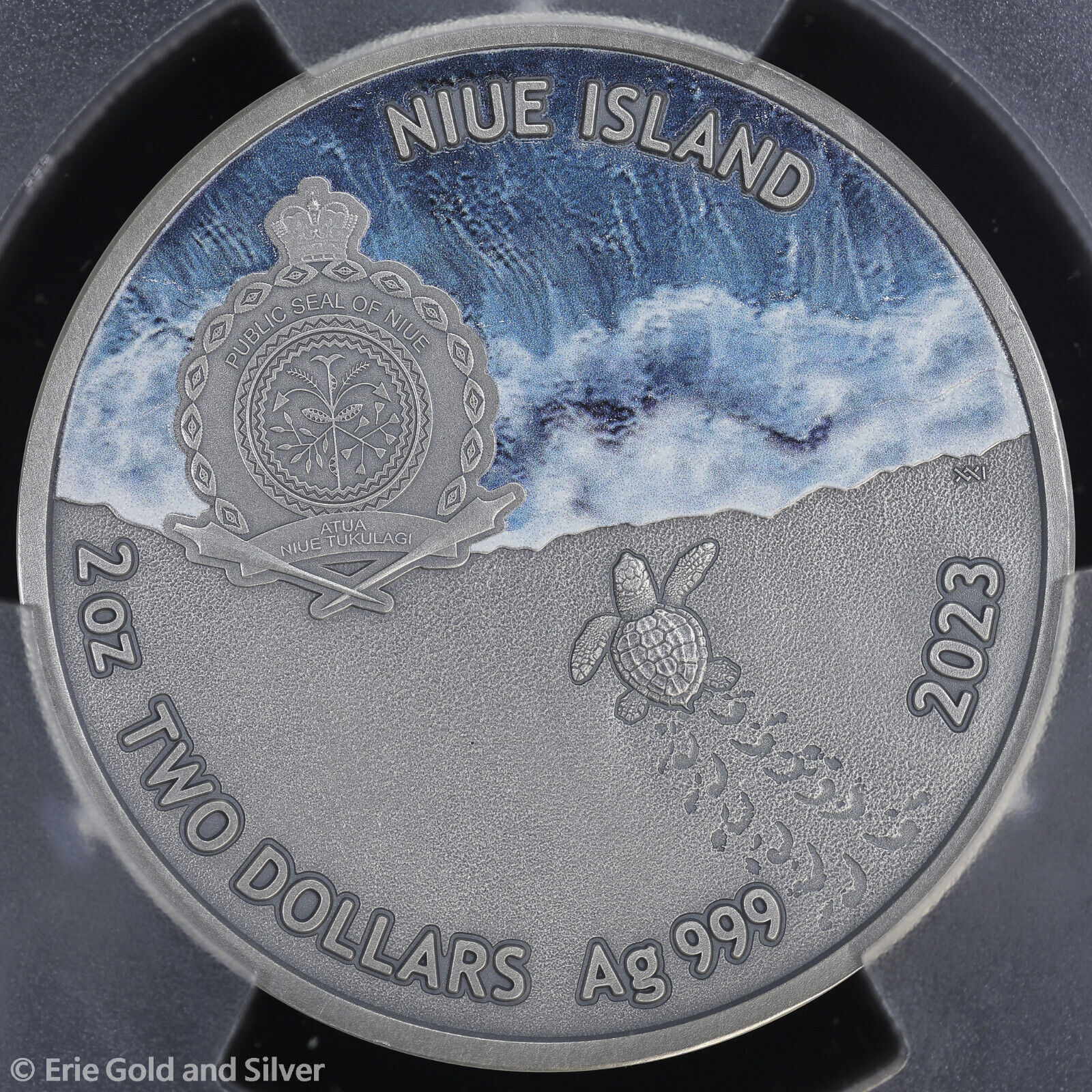 2023 $2 Niue 2 oz Silver Antique Finish Loggerhead Sea Turtle PCGS SP 70