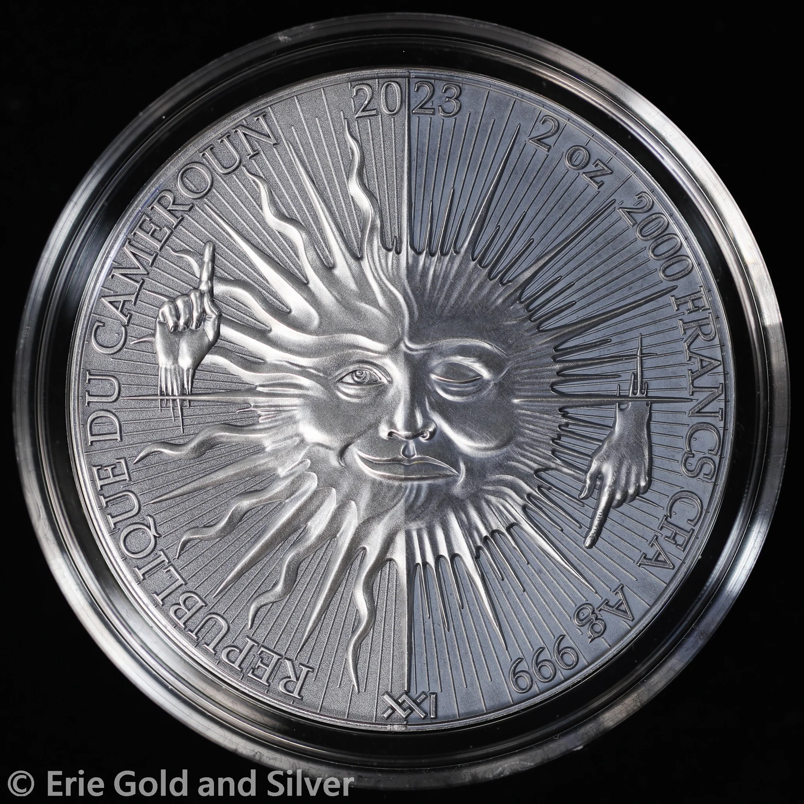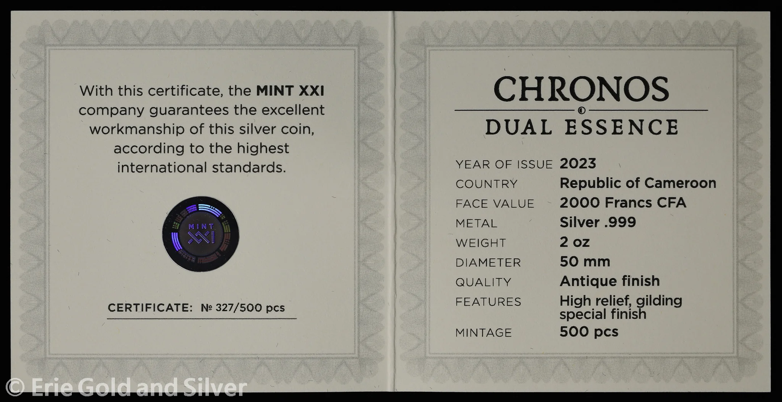 For sale is a 2023 2000 Francs Cameroon 2 oz Silver Antique Finish Chronos Dual Essence. View pictures for details and condition. There are multiple available, so the coin you receive may not be the exact coin pictured. However, it will be similar quality. Feel free to contact us with any questions.