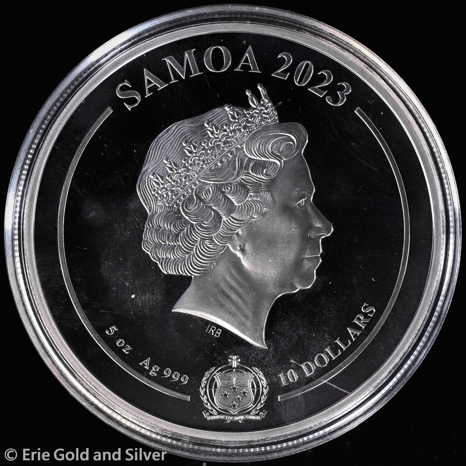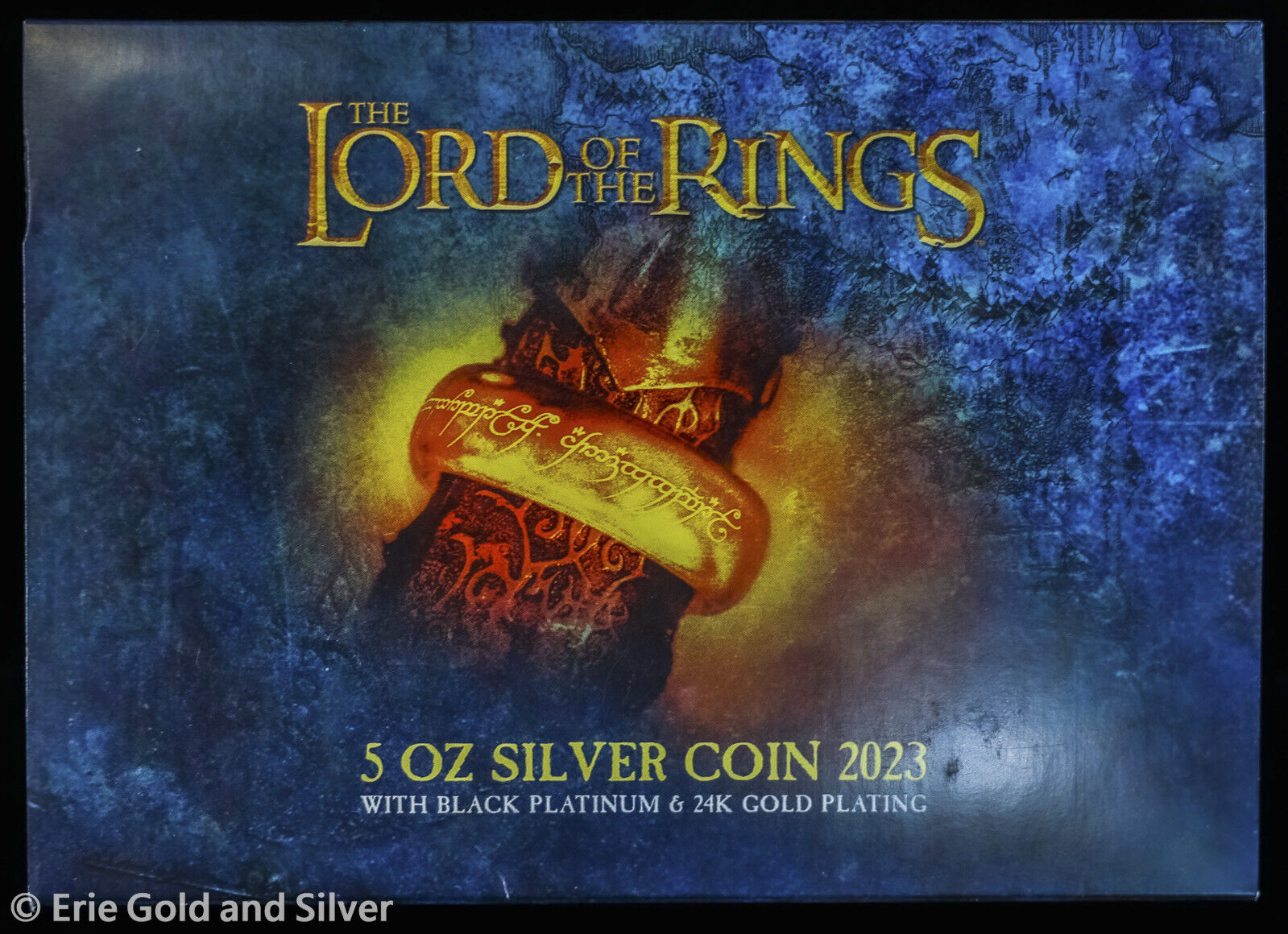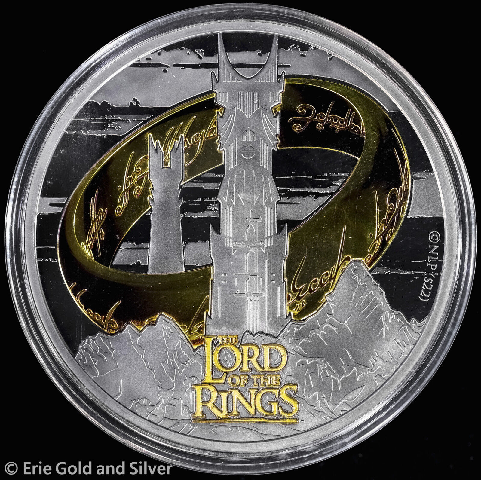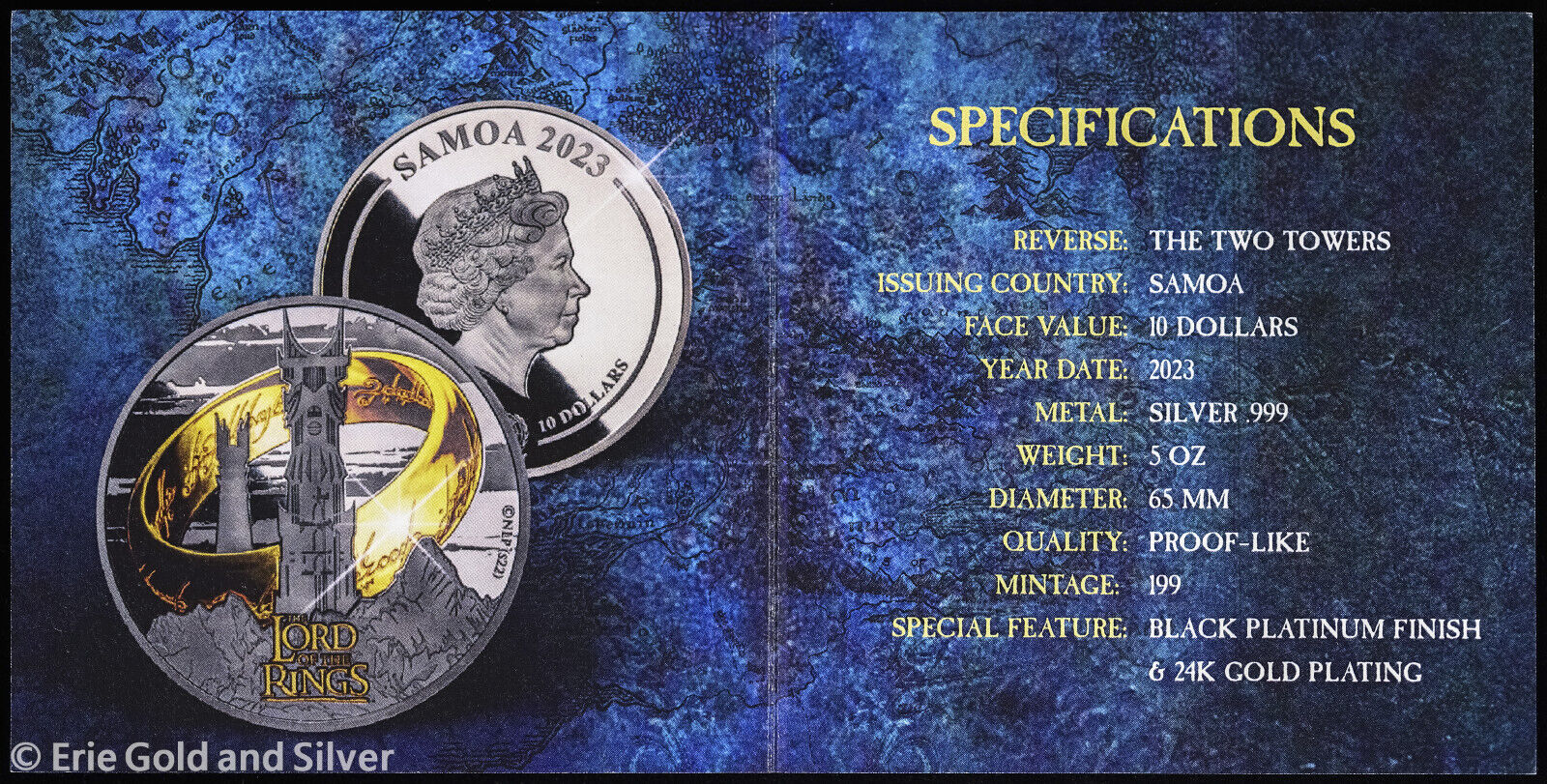 For sale is a 2023 $10 Samoa Lord of the Rings - The Two Towers 5 oz Silver Coin with Black Platinum and 24K Gold Plating.