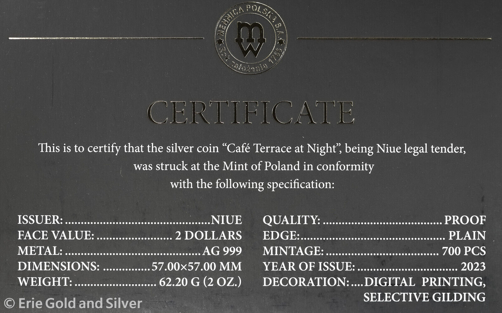 2023 Niue Cafe Terrace by Night Vincent van Gogh 2 oz Silver Coin in OGP