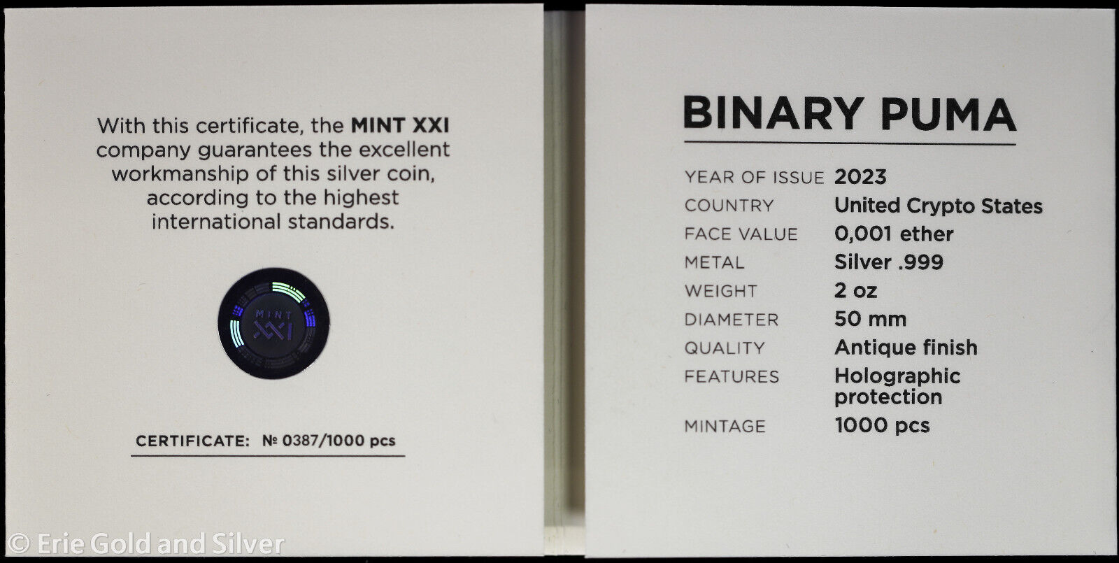 2023 United Crypto States Binary Puma 2 oz Antiqued Silver Coin in OGP