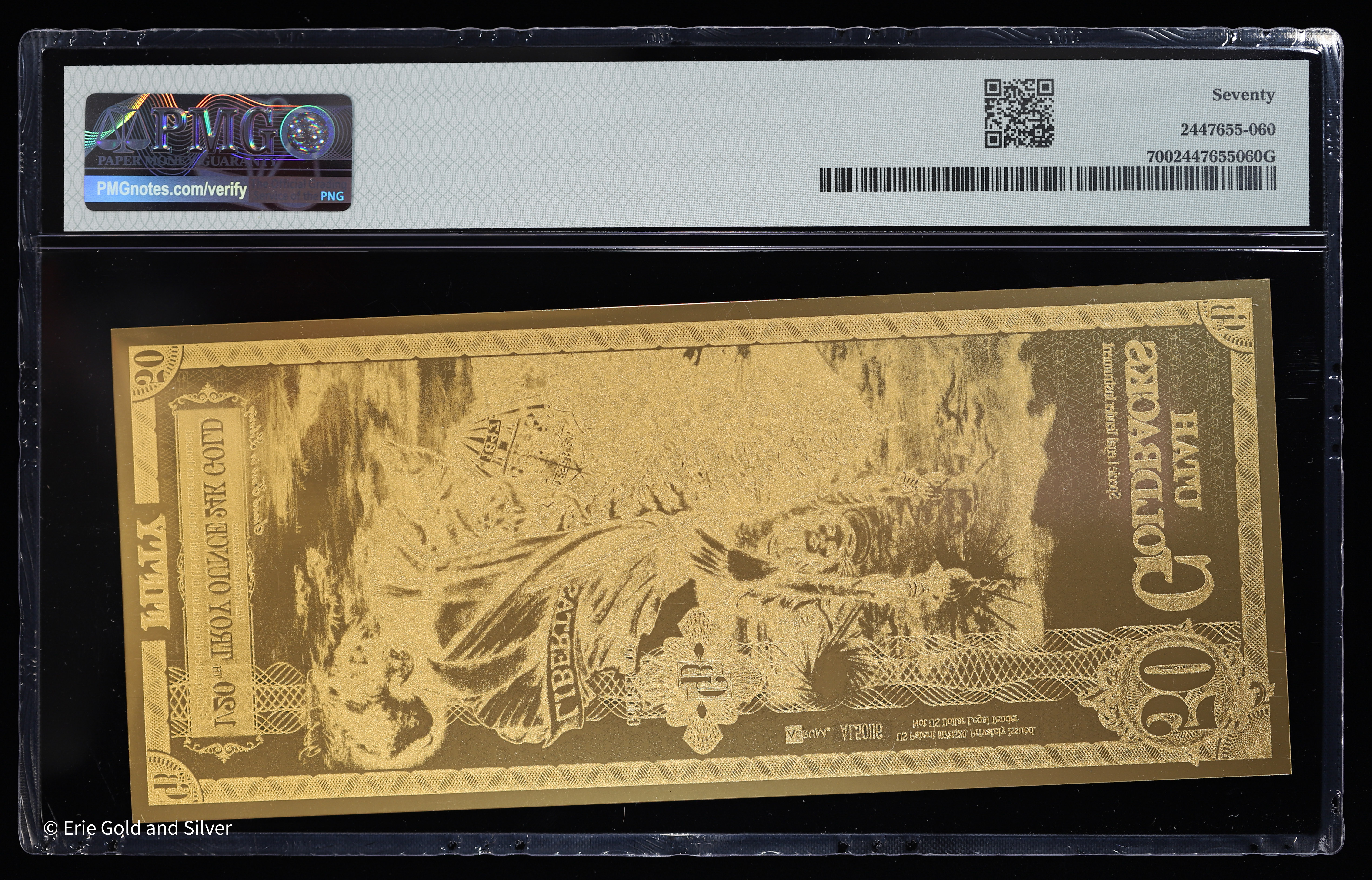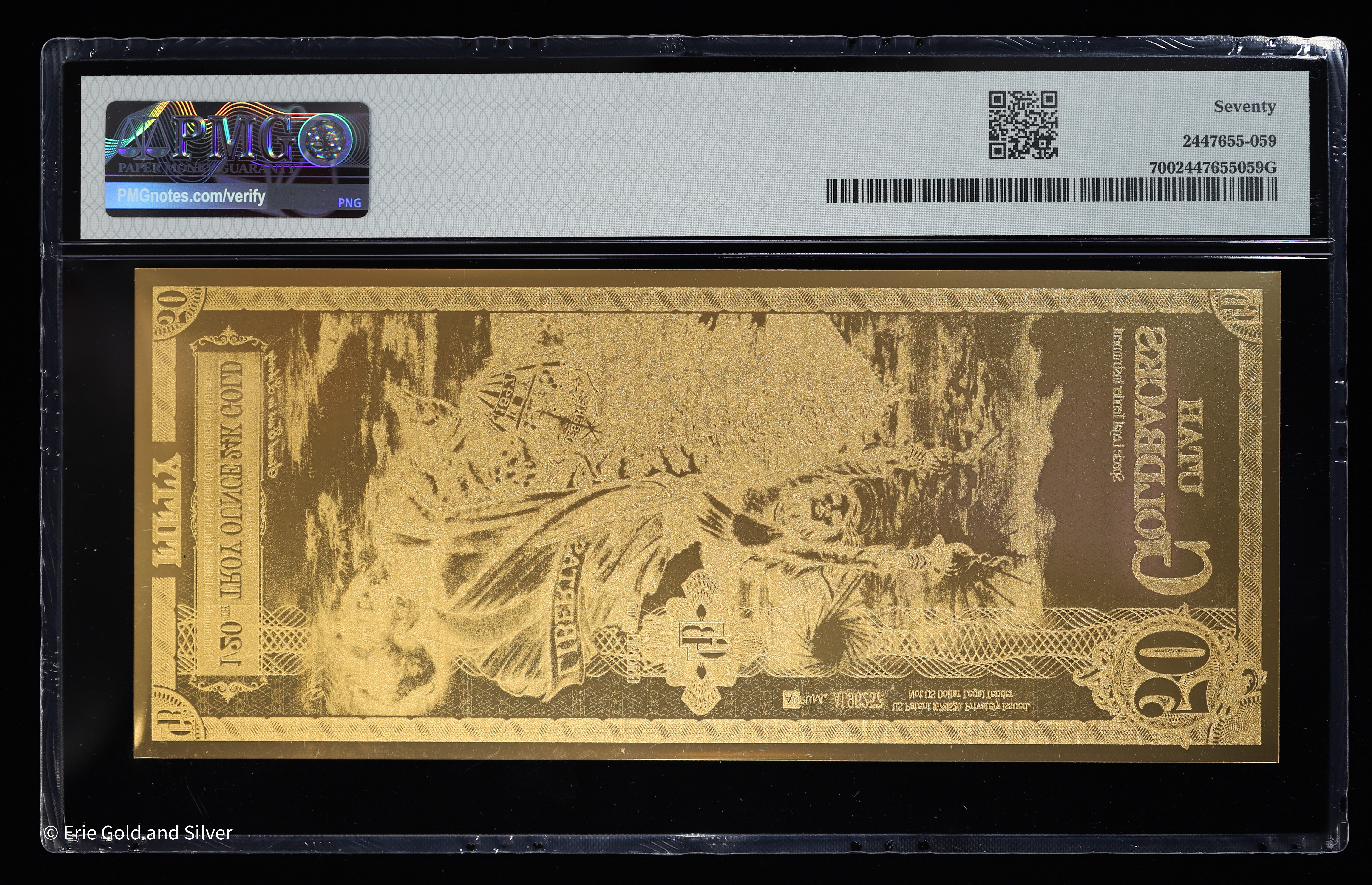 The 2023 Utah 50 Goldbacks “Libertas” is a 1/20 oz 24k gold foil note, privately issued as voluntary local currency. Graded PMG 70 Gem Uncirculated, it features intricate artwork honoring the virtue of liberty, making it a flawless and desirable piece for Goldbacks collectors.