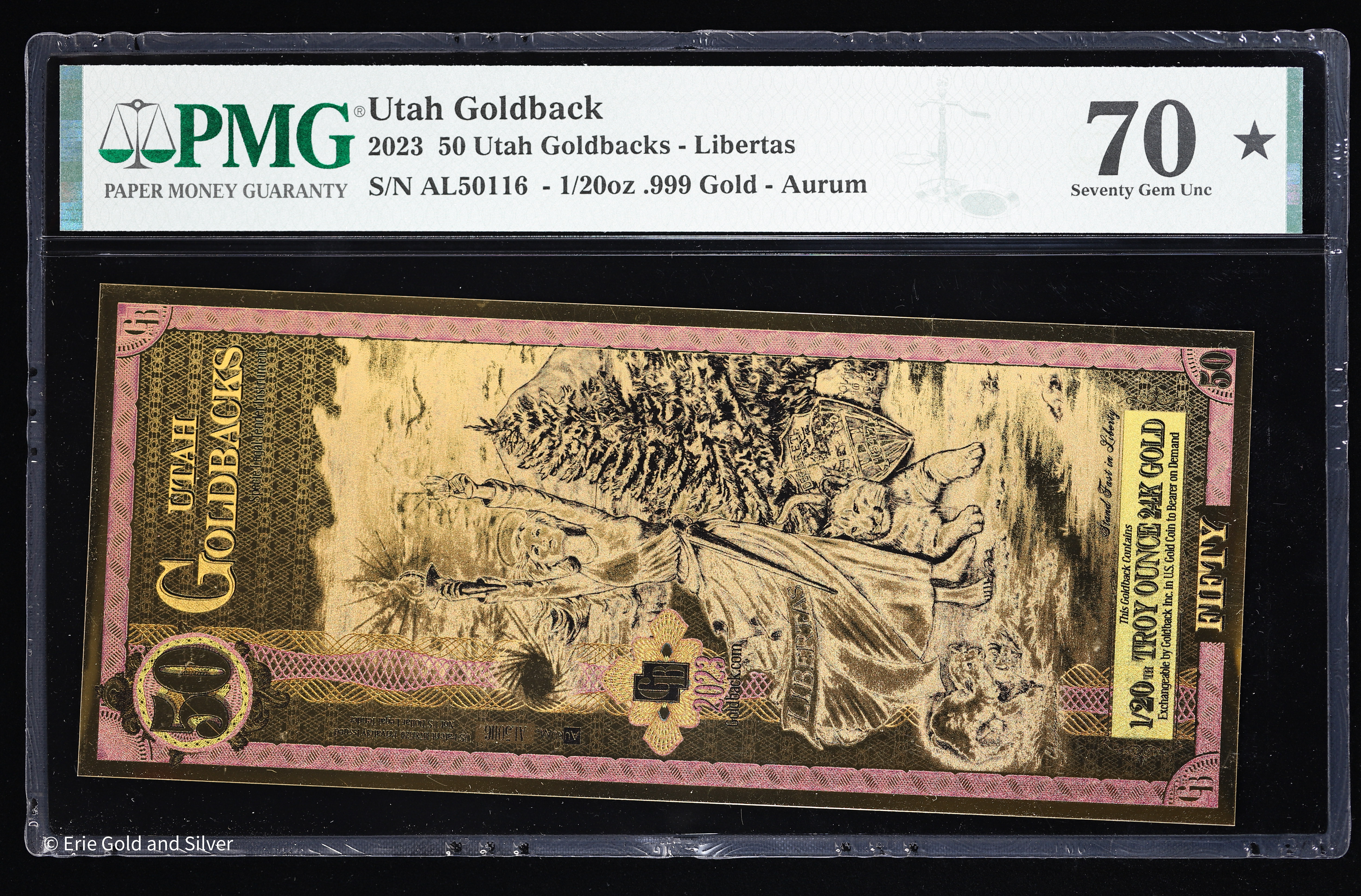 2023 Utah 50 Goldbacks Libertas 1/20 oz 24k Goldback Foil Note PMG 70