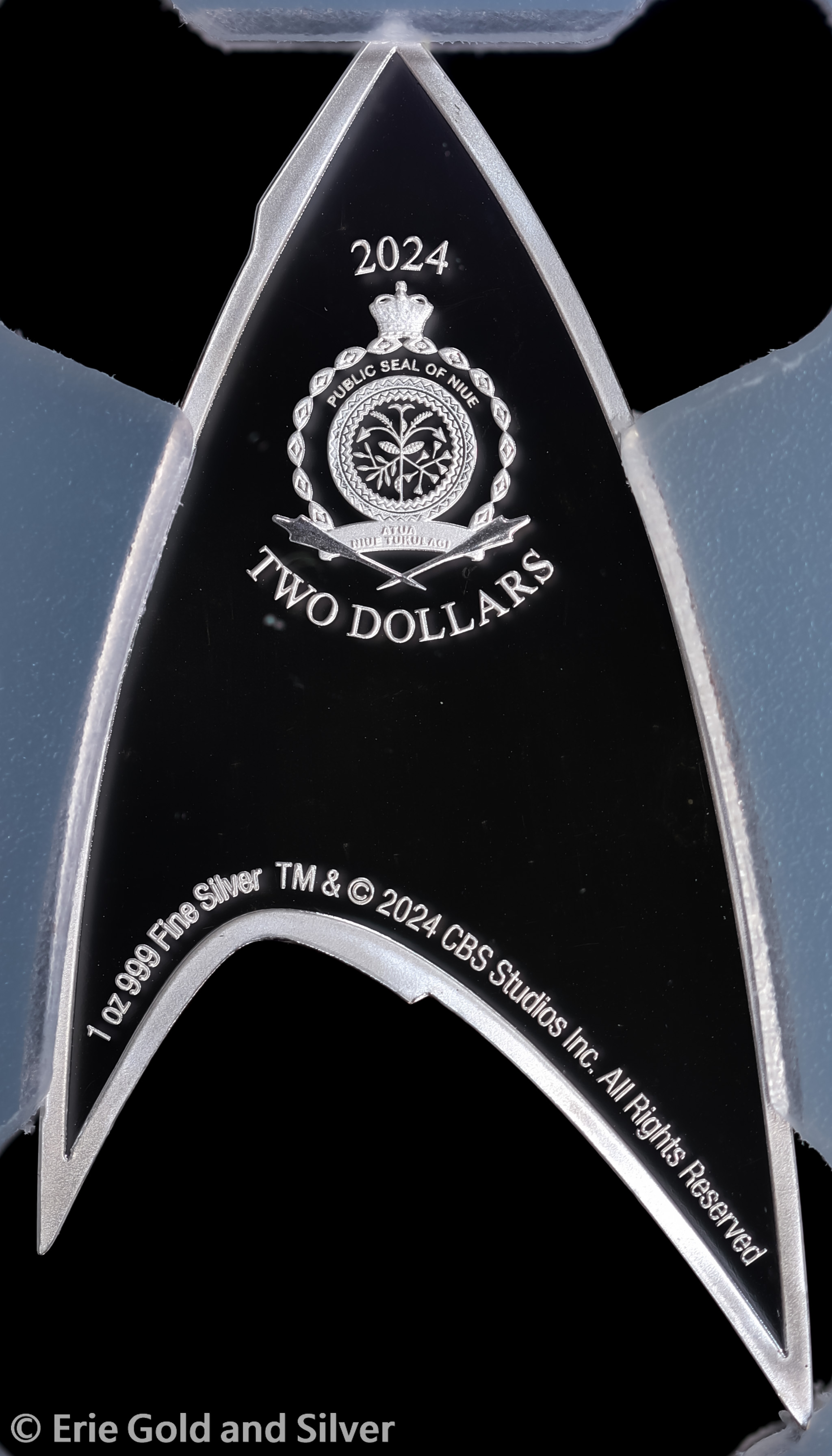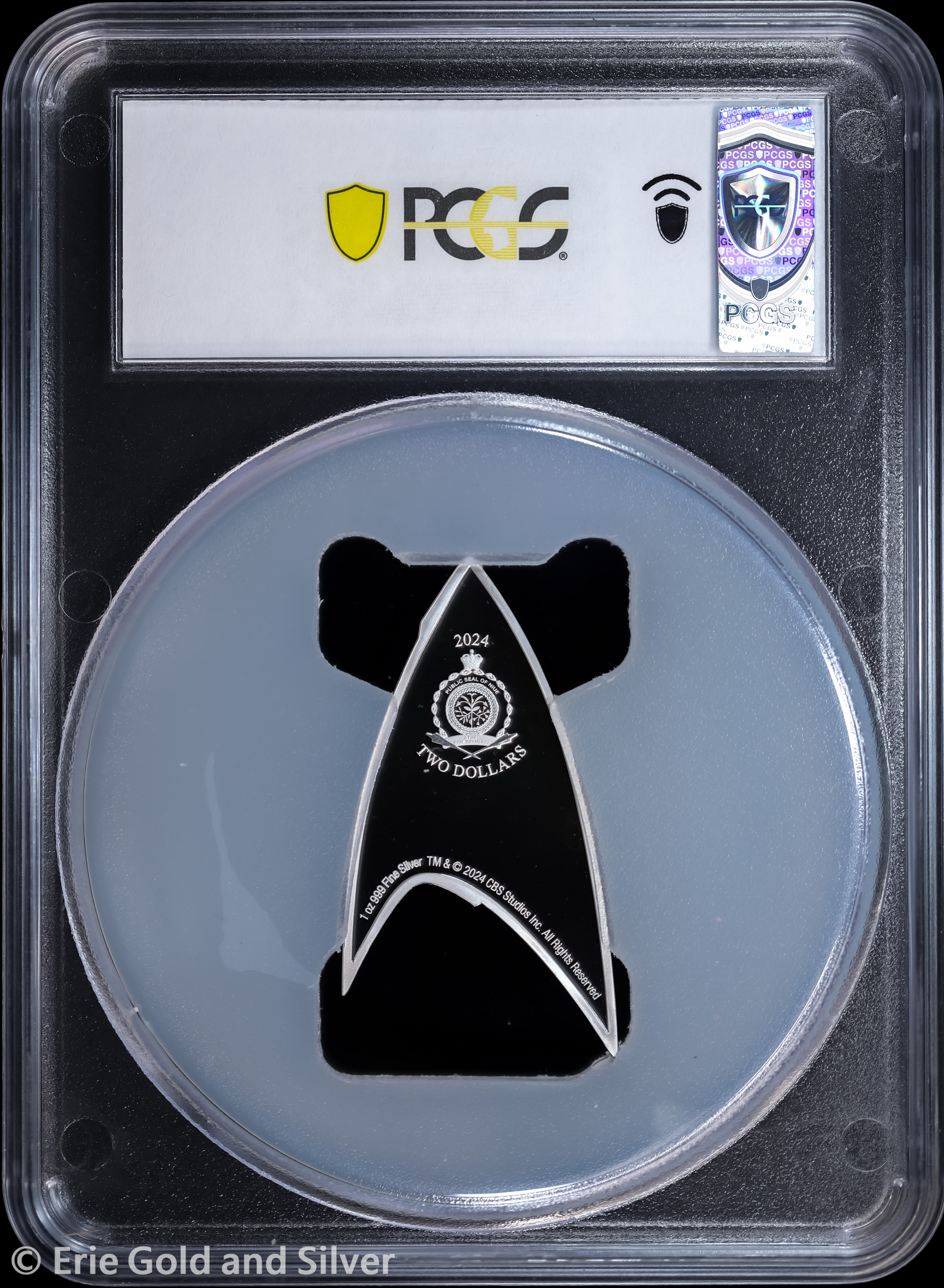 For sale is a 2024 $2 Niue 1 oz Silver Star Trek Sciences Insignia Badge. Certified / graded by PCGS at PR 69 DCAM.