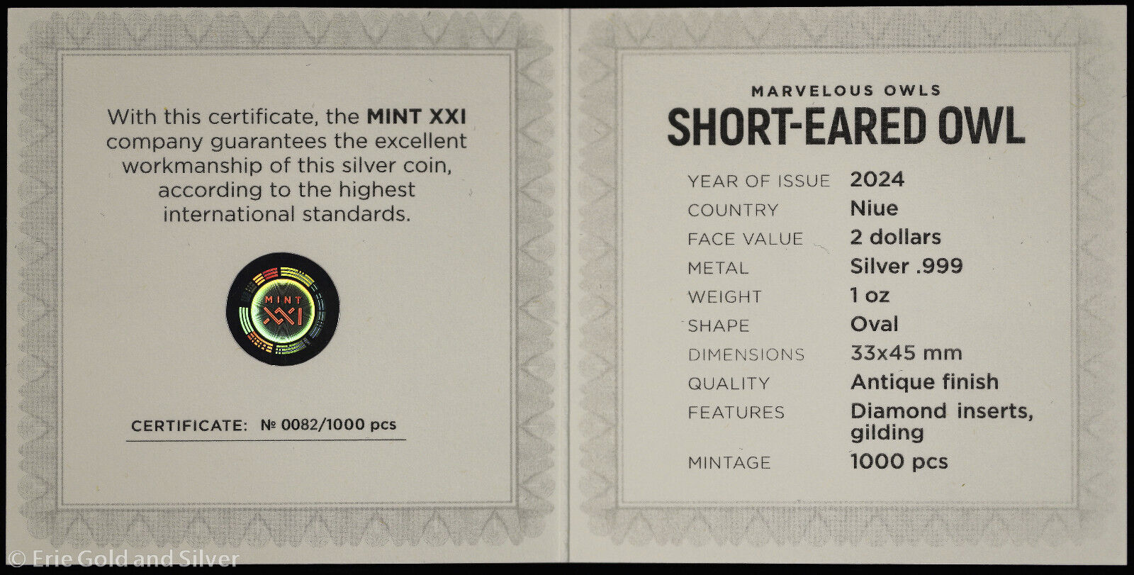 For sale is a 2024 $2 Niue Marvelous Owls - Short Eared Owl 1 oz Silver Antiqued Coin in OGP. View pictures for details and condition. There are multiple available, so the item you receive may not be the exact item pictured. However, it will be similar quality. Feel free to contact us with any questions.