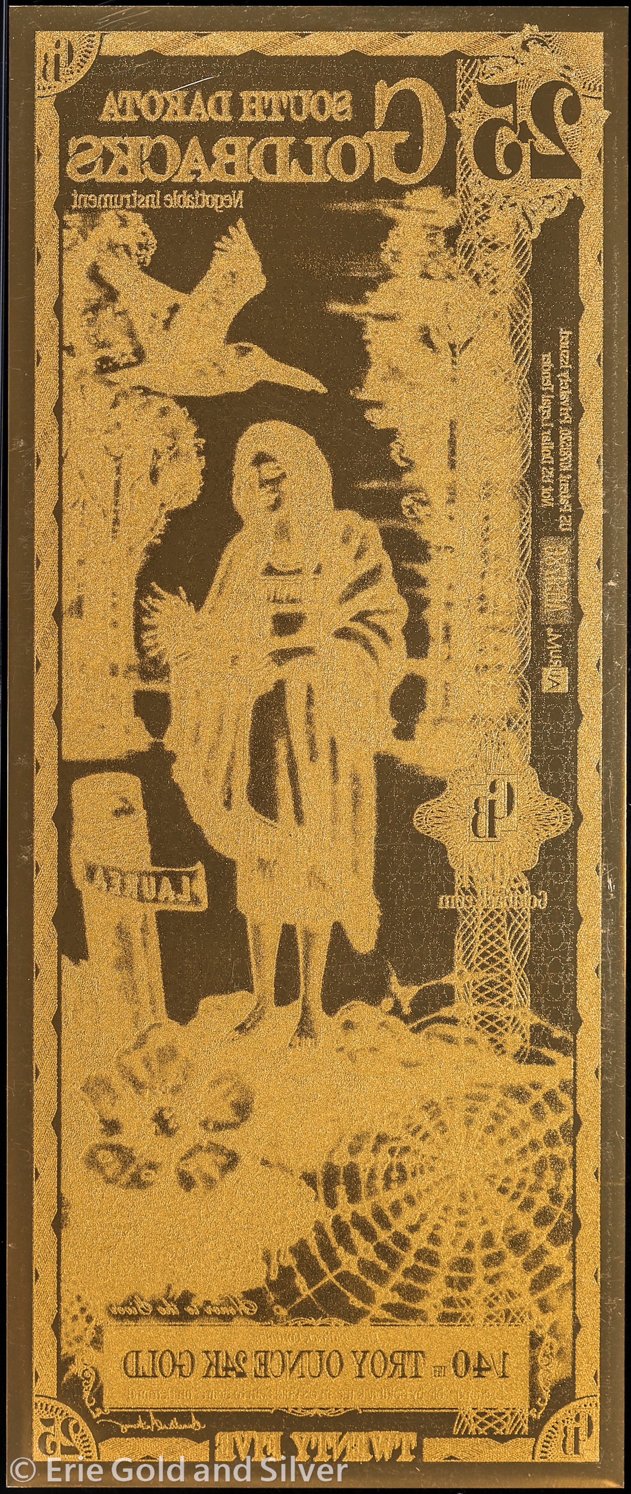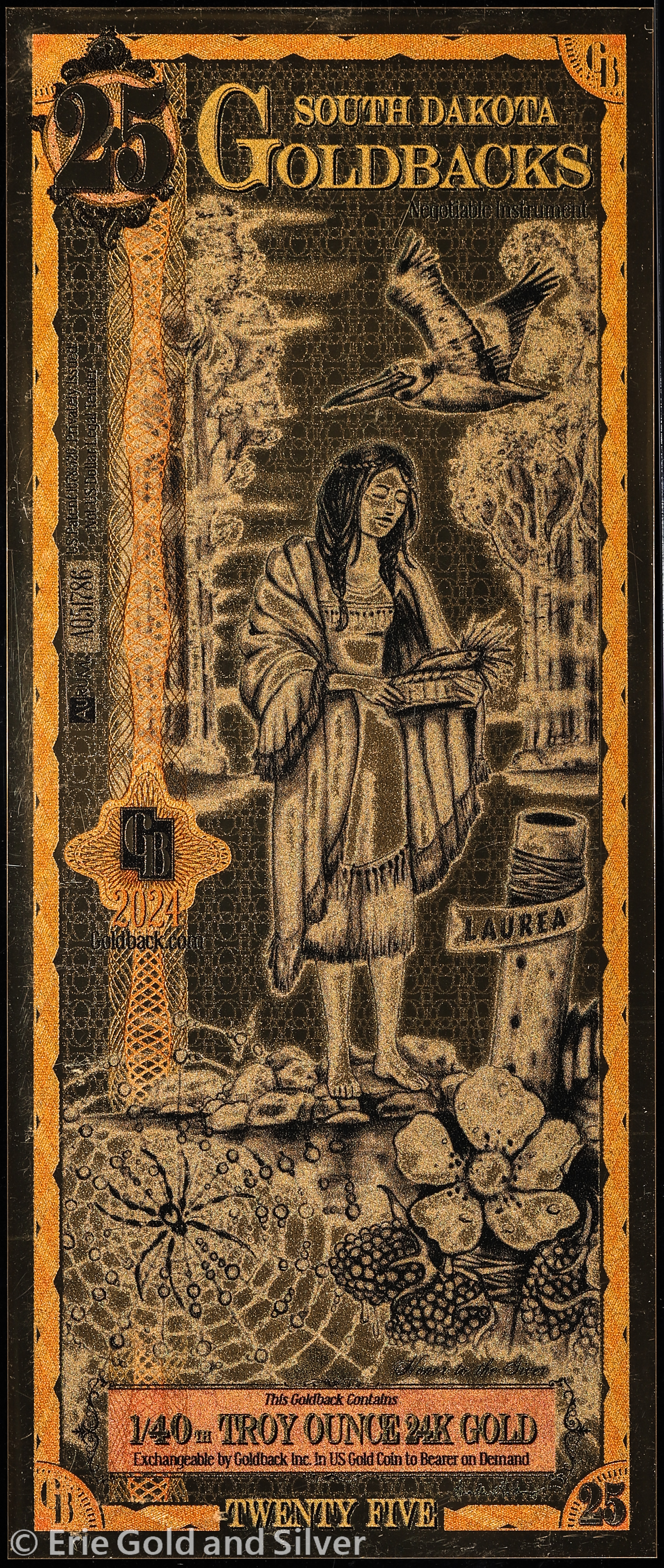 For sale is a 2024 $25 South Dakota Goldback - Laurea 1/40 oz Gold Note. Certified / graded by PMG at PMG 70 Gem Unc Star.