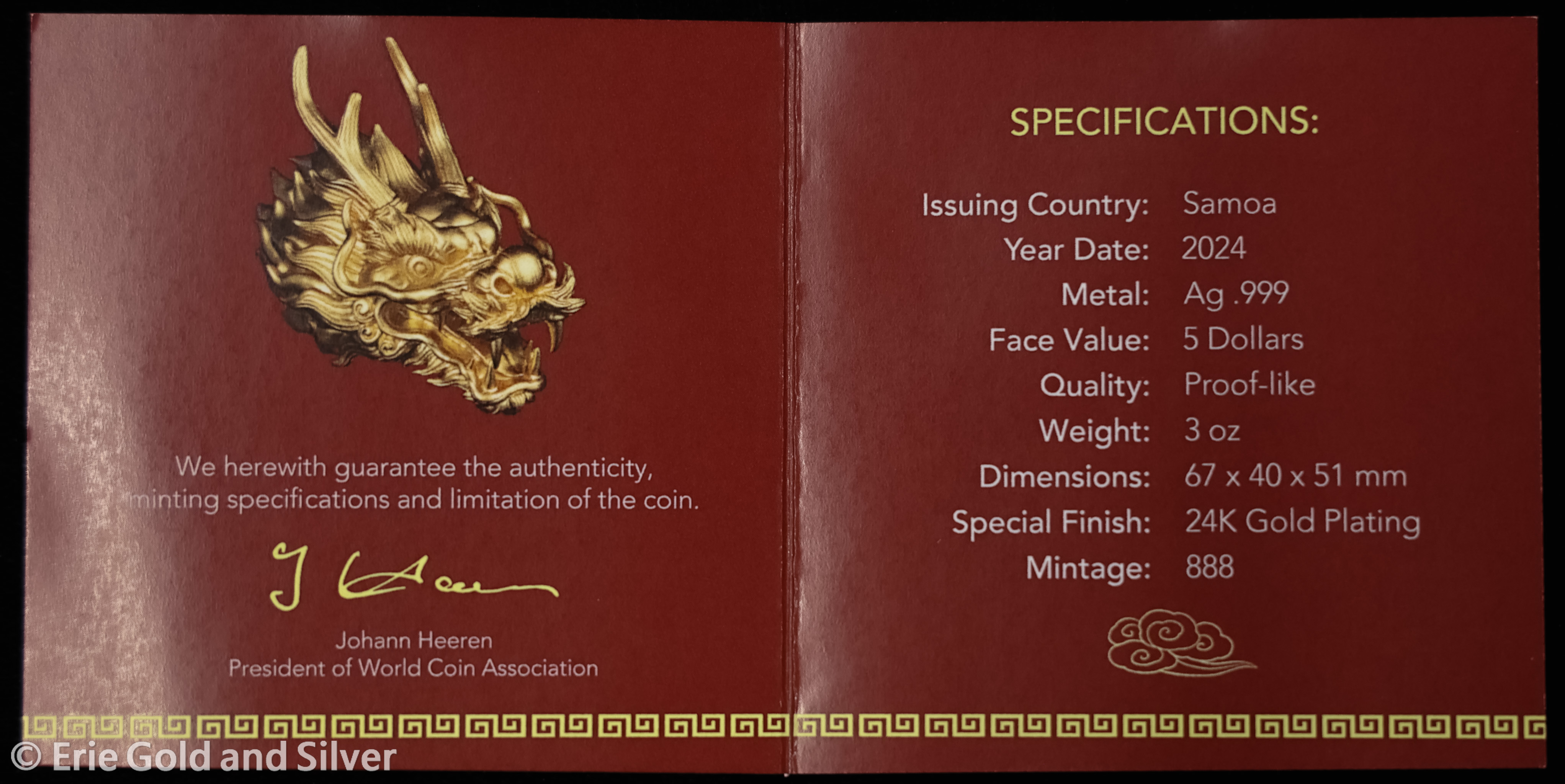 2024 $5 Samoa Proof-Like Dragon Head 3 oz Silver Gold Gilded 3D Coin in OGP