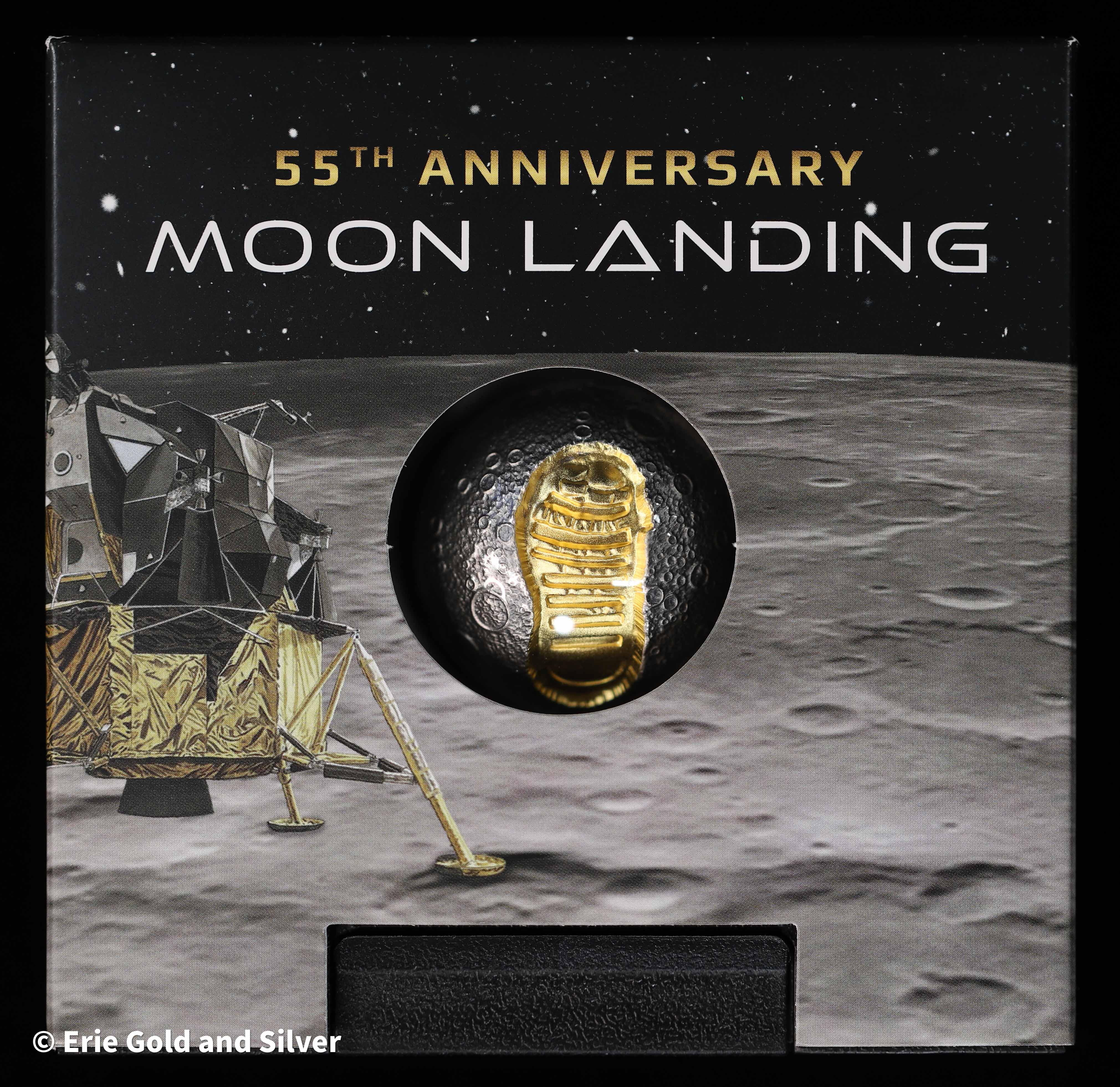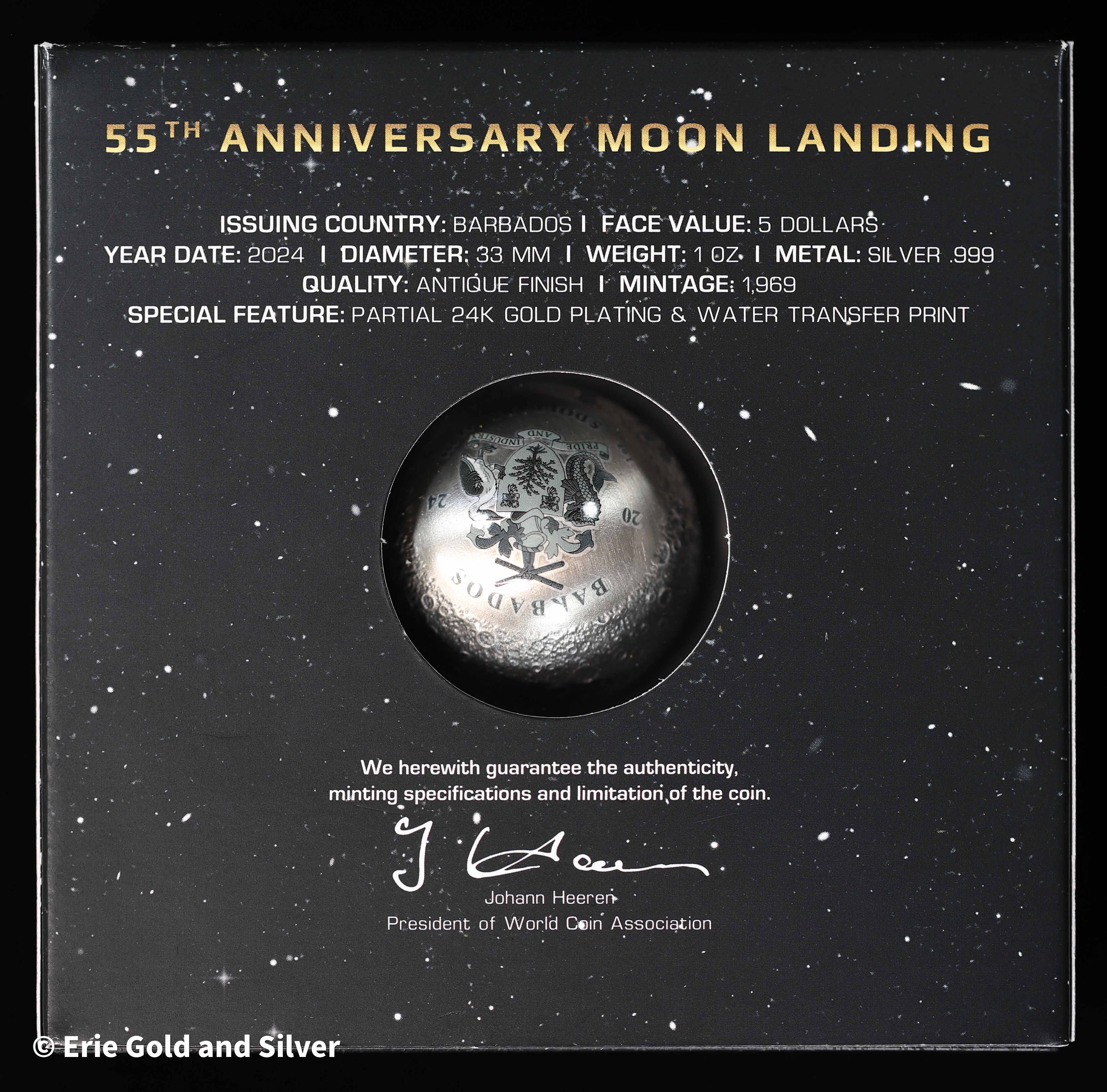 Commemorate a historic achievement with the 2024 55th Anniversary Moon Landing 1 oz .999 Antiqued Silver 3D Coin. Struck from 1 oz of .999 fine silver, this remarkable collectible features a dramatic 3D design honoring the legendary first Moon landing. The antiqued finish enhances the intricate details, giving the coin a bold, sculpted appearance that highlights this milestone in space exploration. A meaningful addition for collectors of space-themed and historical silver coins.