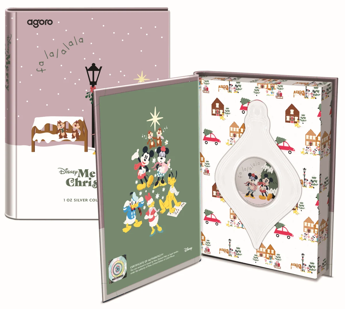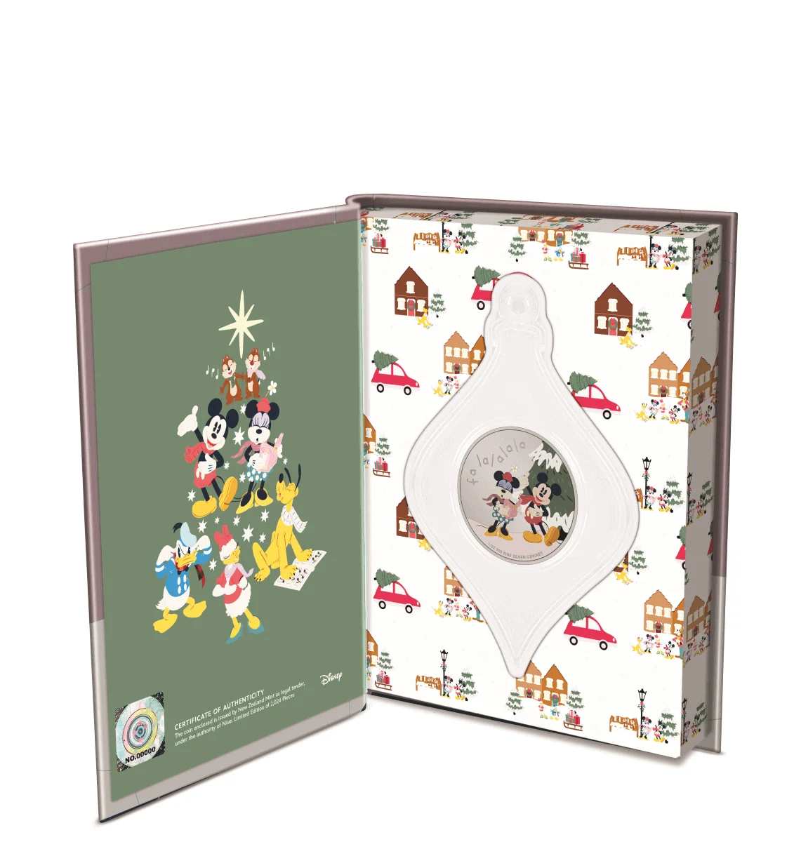Issued in 2024, this Disney Merry Christmas – Mickey & Minnie Mouse ornament contains 1 oz of fine silver and features the iconic duo in a holiday-themed design. Blending seasonal charm with precious metal content, this piece is a festive addition for collectors of Disney-licensed silver, holiday ornaments, and themed collectibles.
