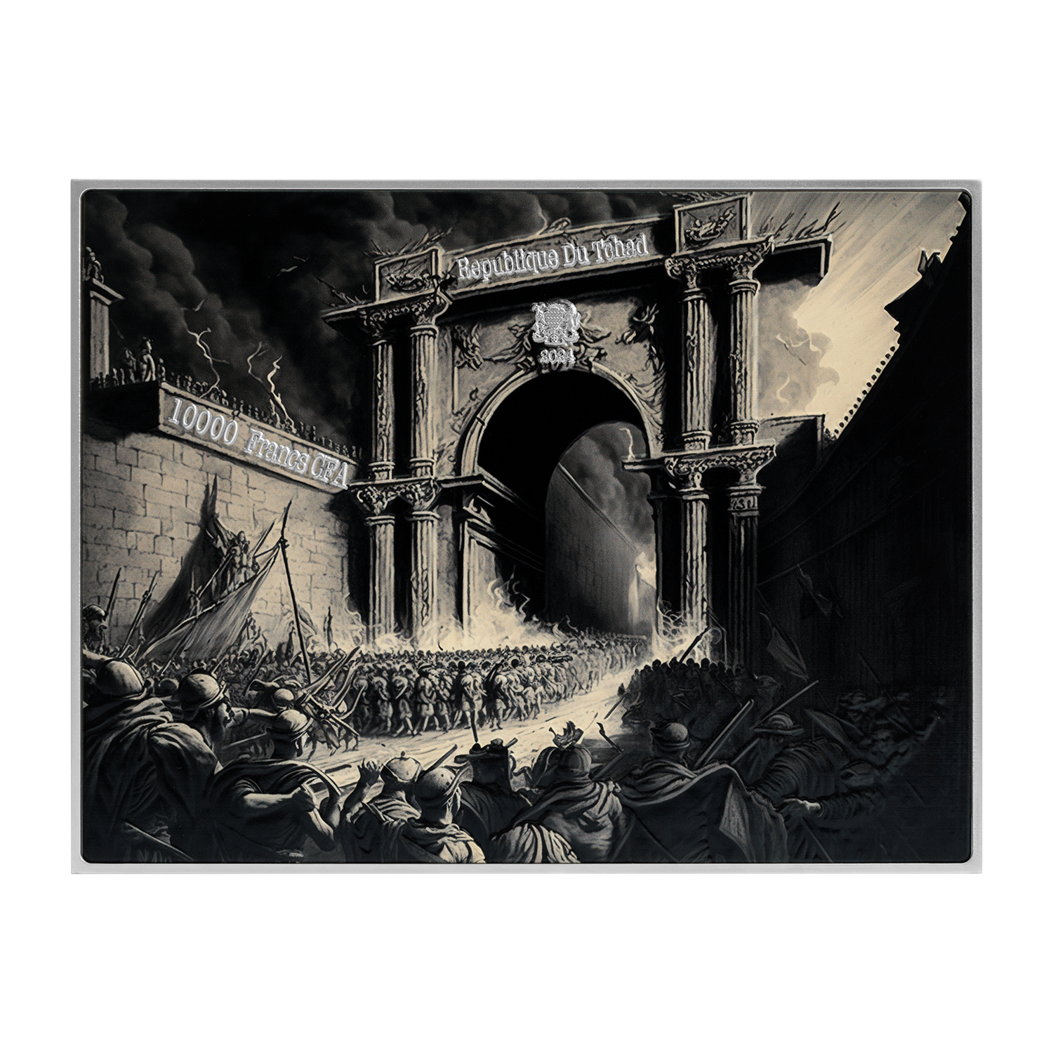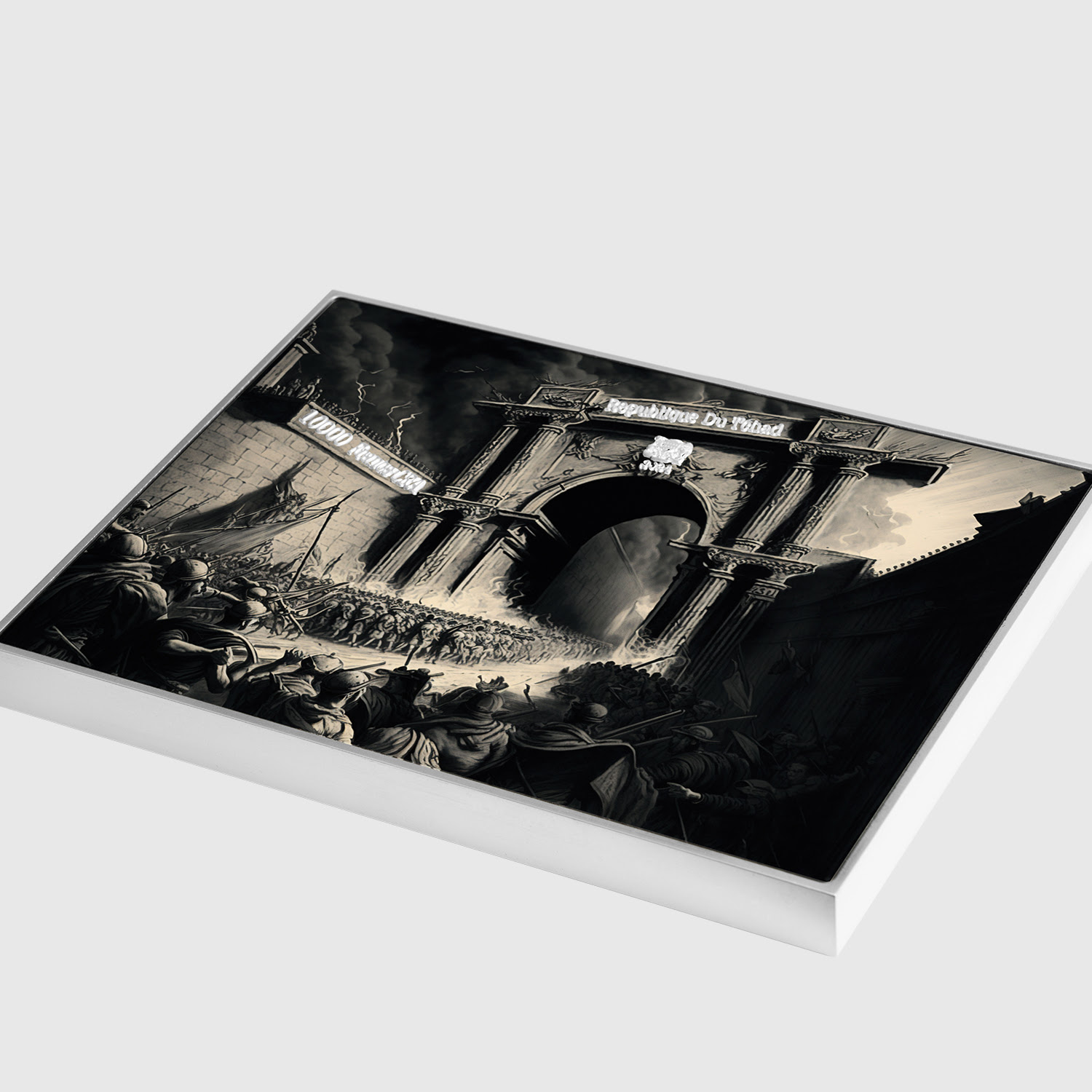 Strike a harmonious chord between history and artistry with this elegant Chad-issued silver tribute to Jacques‑Louis David’s iconic 1799 painting, The Intervention of the Sabine Women. This non-circulating rectangular coinlic relic is crafted from .999 fine silver and accented with copper and zinc for depth and durability. This coin is more than a metallic collectible—it’s a celebration of diplomatic unity, classical art, and limited-edition rarity. With its generous size and dramatic rectangular form, it’s a visual and tactile homage to both mythic Rome and French Neoclassicism.