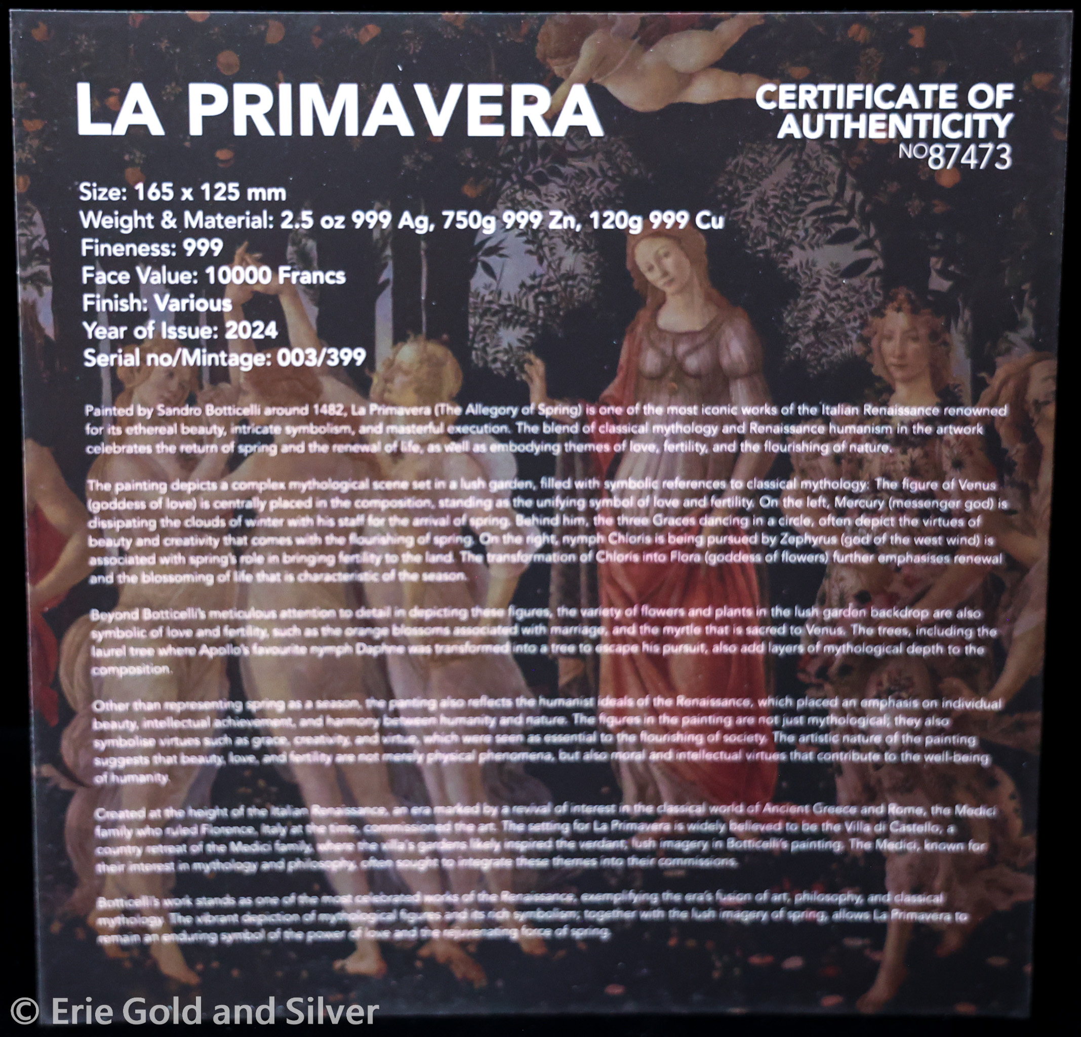 For sale is a 2024 La Primavera by Botticelli 2.5 oz Silver Coin in OGP.