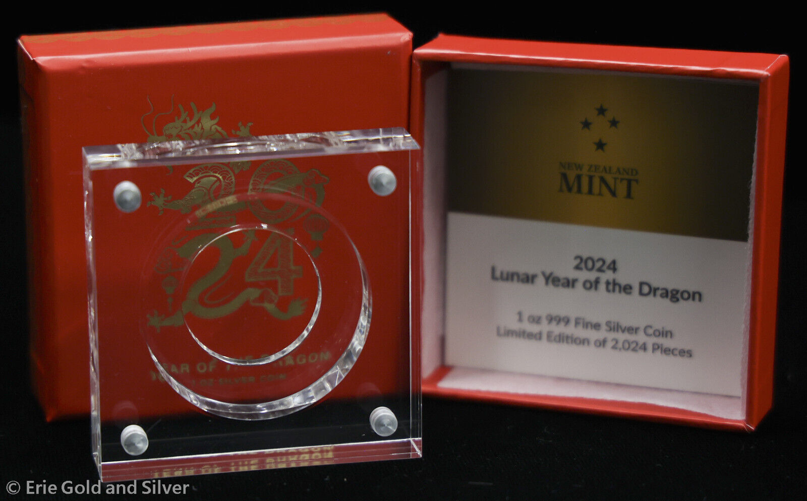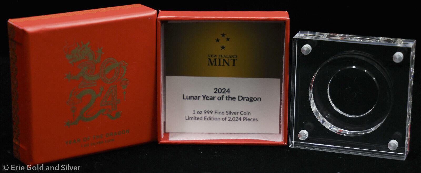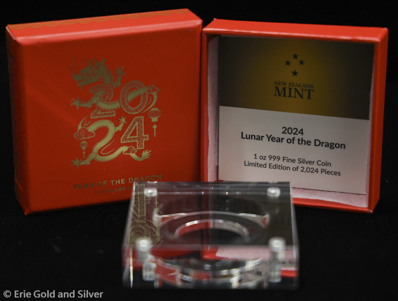 For sale is a 2024 Niue Year of the Dragon 1 oz Silver Coin OGP BOX ONLY. NO COINS. View pictures for details and condition. There are multiple available, so the item you receive may not be the exact item pictured. However, it will be similar quality. Feel free to contact us with any questions.