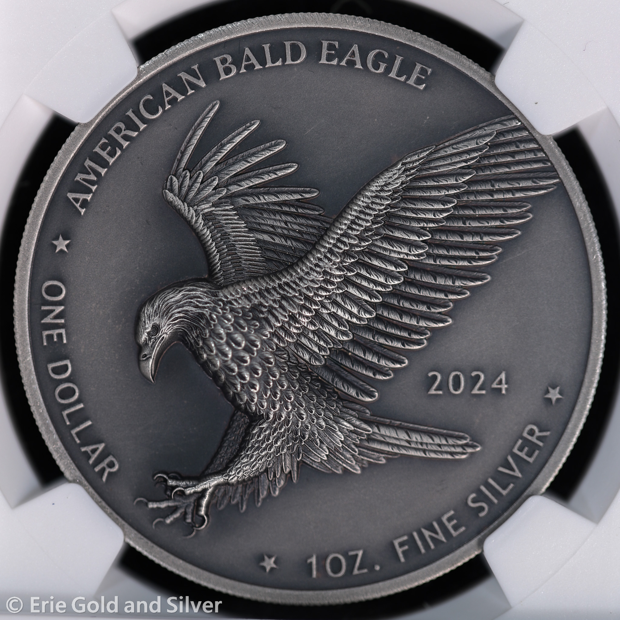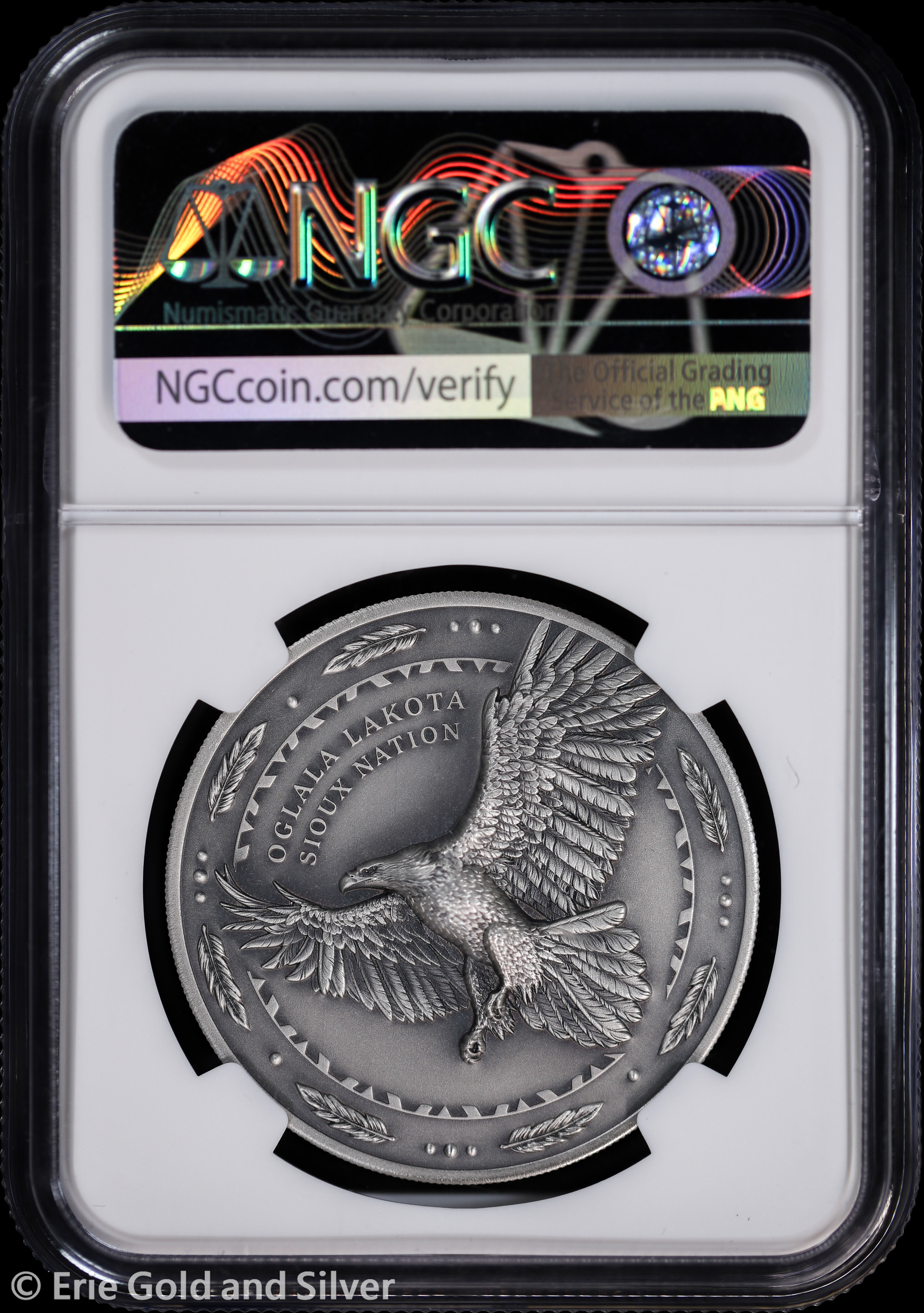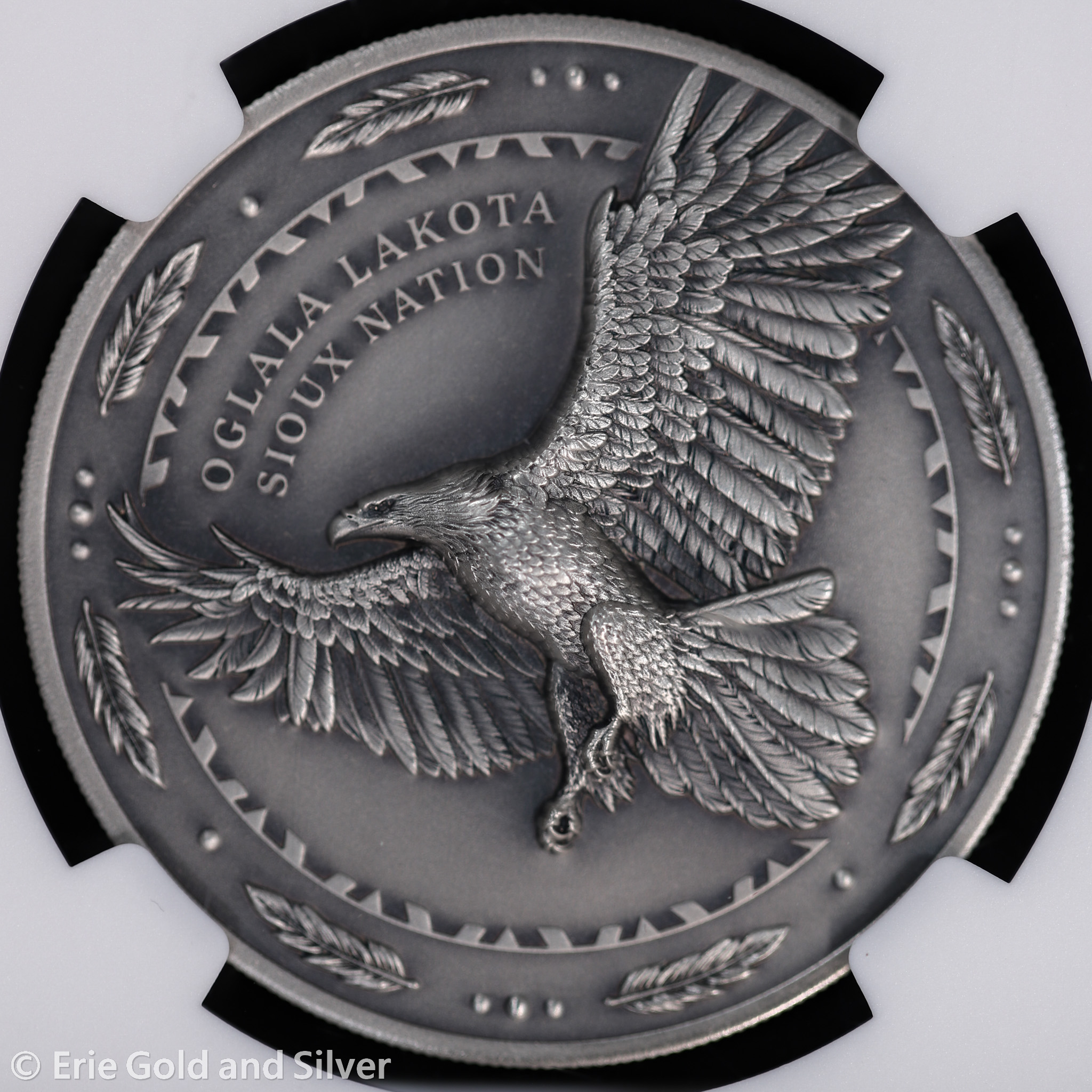 For sale is a 2024 Oglala Lakota, Sioux Nation Antiqued American Bald Eagle 1 oz Silver Coin. Certified / graded by NGC at MS 70.