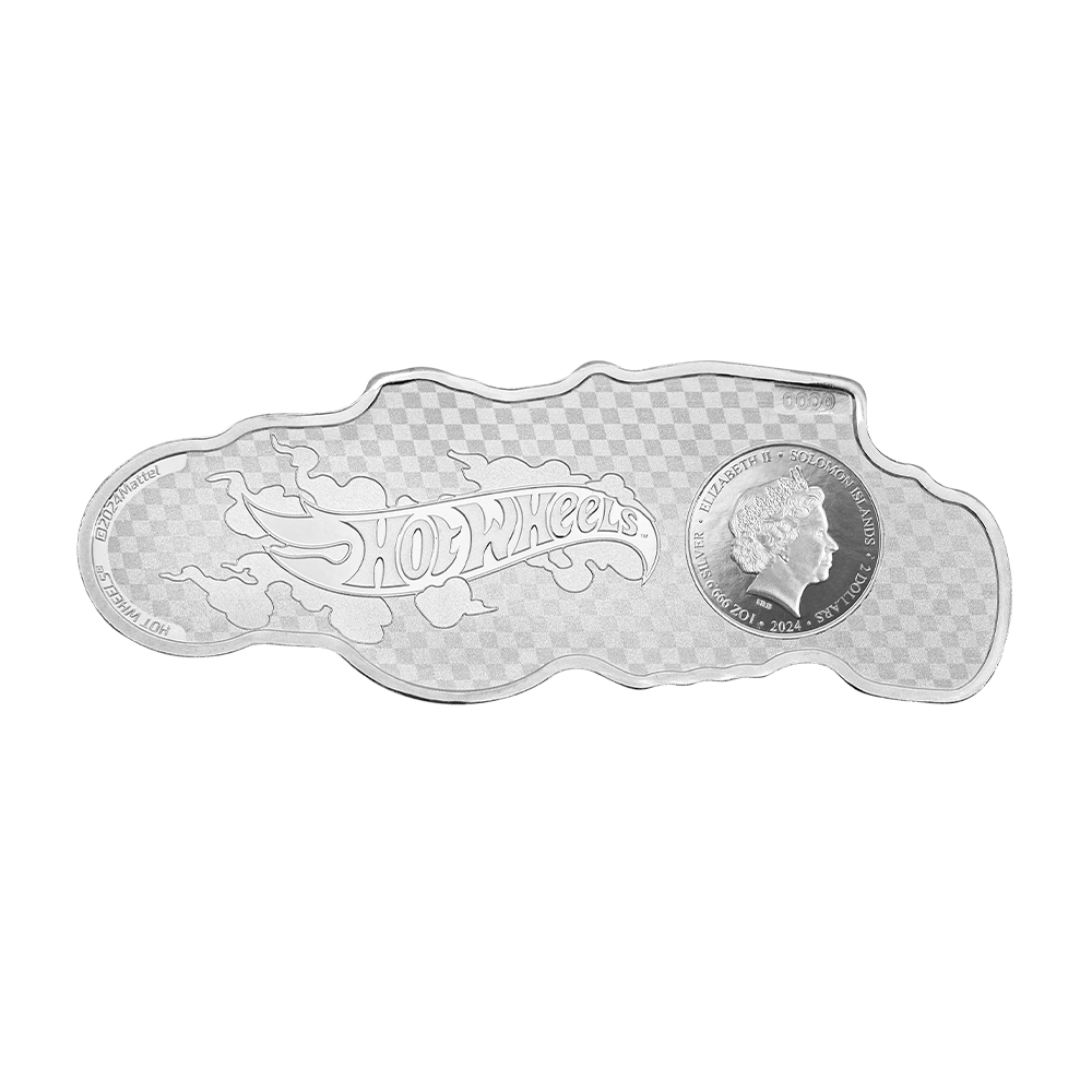 Design: The reverse showcases a vibrantly colorized, proof-like depiction of the Bone Shaker™, featuring its signature skull-shaped grille, skeleton hands around the headlights, and exposed engine, all rendered with intricate detail and a glossy finish. The obverse displays the Ian Rank-Broadley effigy of Queen Elizabeth II, with inscriptions including “SOLOMON ISLANDS,” “2 DOLLARS,” “2024,” “1 OZ 9999 FINE SILVER,” the Hot Wheels logo, and a unique serial number set against a checkered flag pattern.