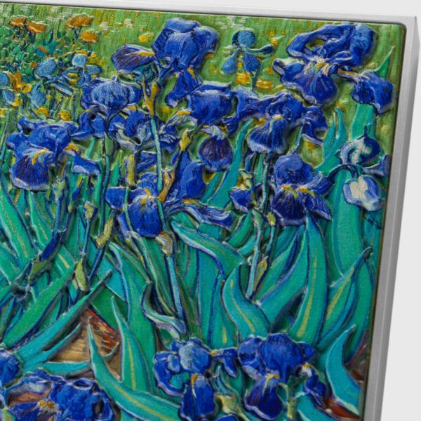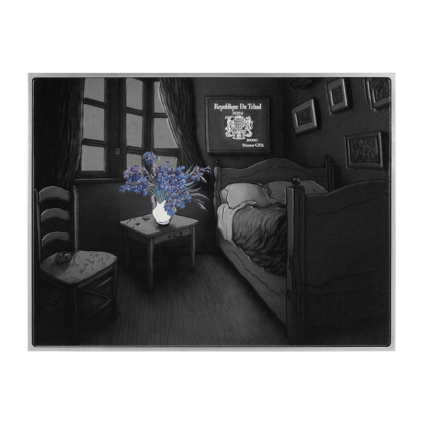 Celebrate Vincent van Gogh’s timeless masterpiece with the 2024 Chad "Irises 1889" 2.5 oz Silver Antiqued Colorized Coin. Struck using a “Tri-Metal” technique—layering .999 fine silver over zinc and copper—the rectangular, antique-finished coin vividly portrays the painting’s lush irises in rich, colorized relief. Issued by the Republic of Chad, this limited edition (only 399 pieces) includes a presentation case and Certificate of Authenticity, making it a stunning artistic tribute and rare collector’s keepsake.