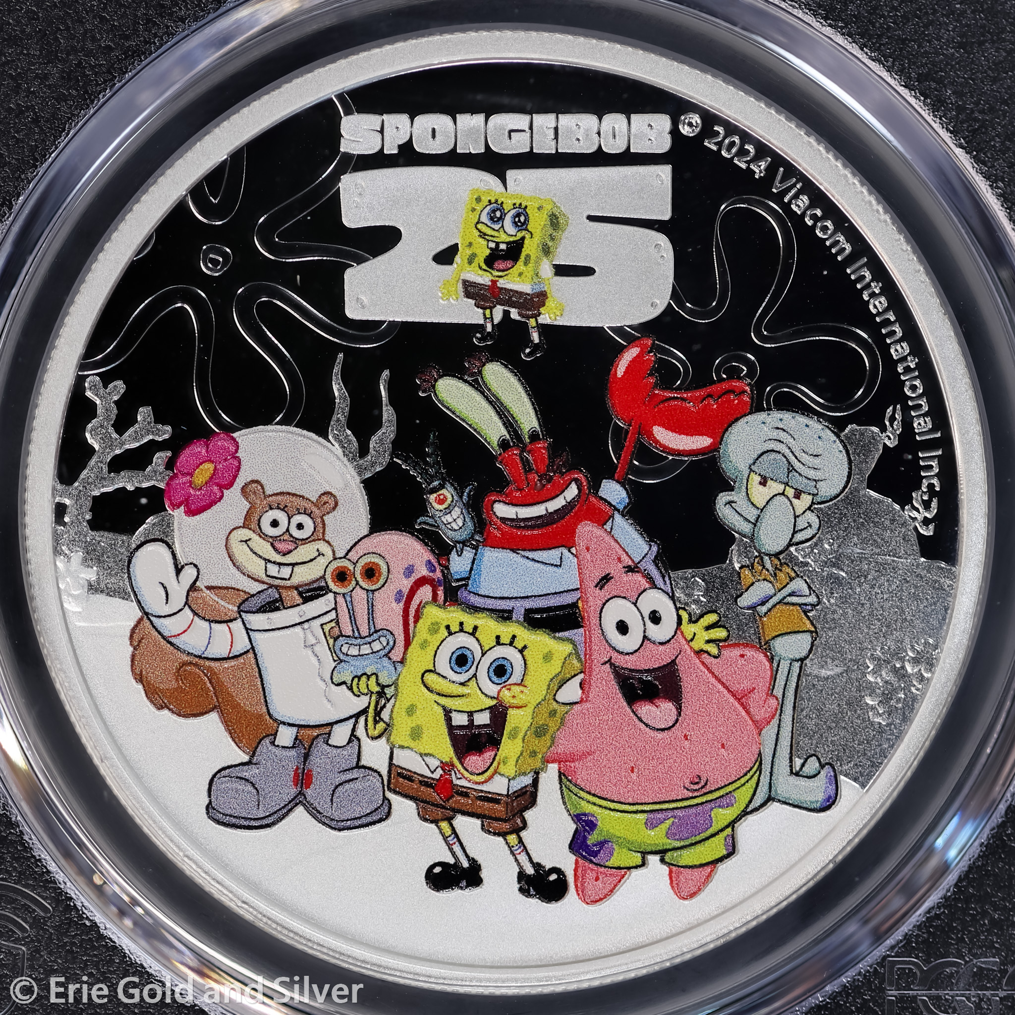 For sale is a 2024 Tuvalu SpongeBob and Friends 25th Anniversary 1 oz Silver Proof Colorized Coin. Certified / graded by PCGS at PR 70 DCAM.