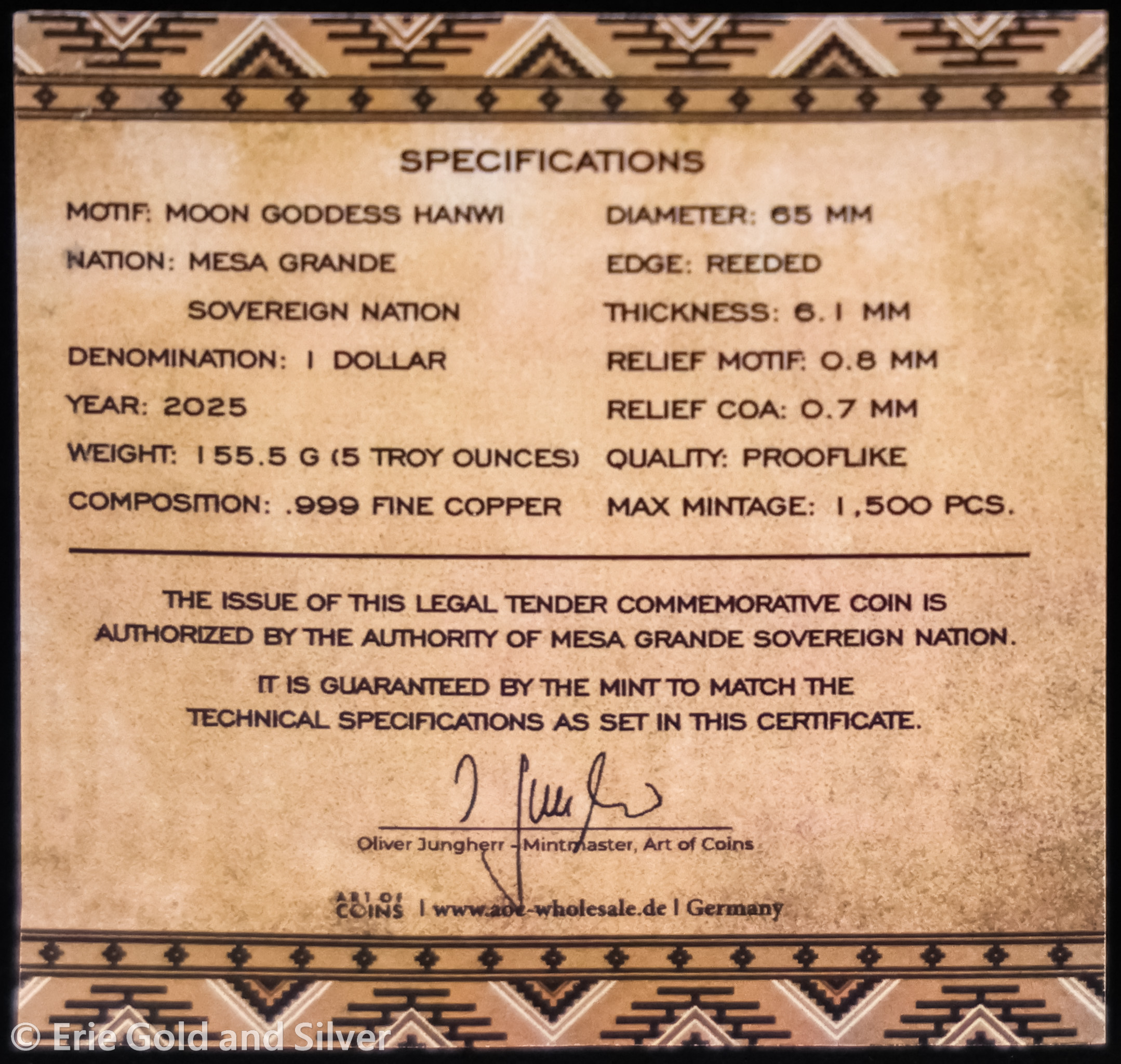 2025 $1 Mesa Grande Moon Goddess Hanwi 5 oz Copper Coin w/ COA